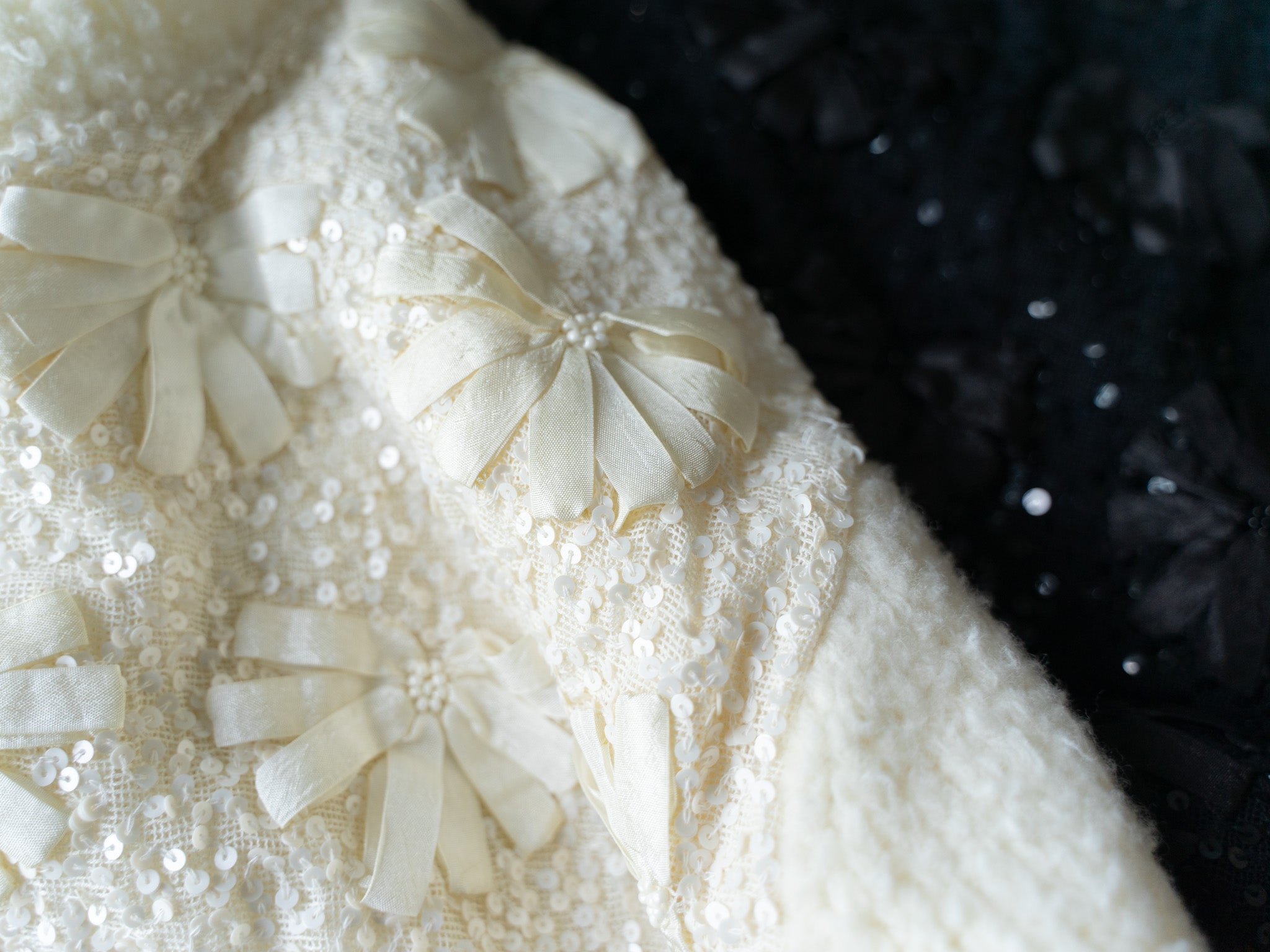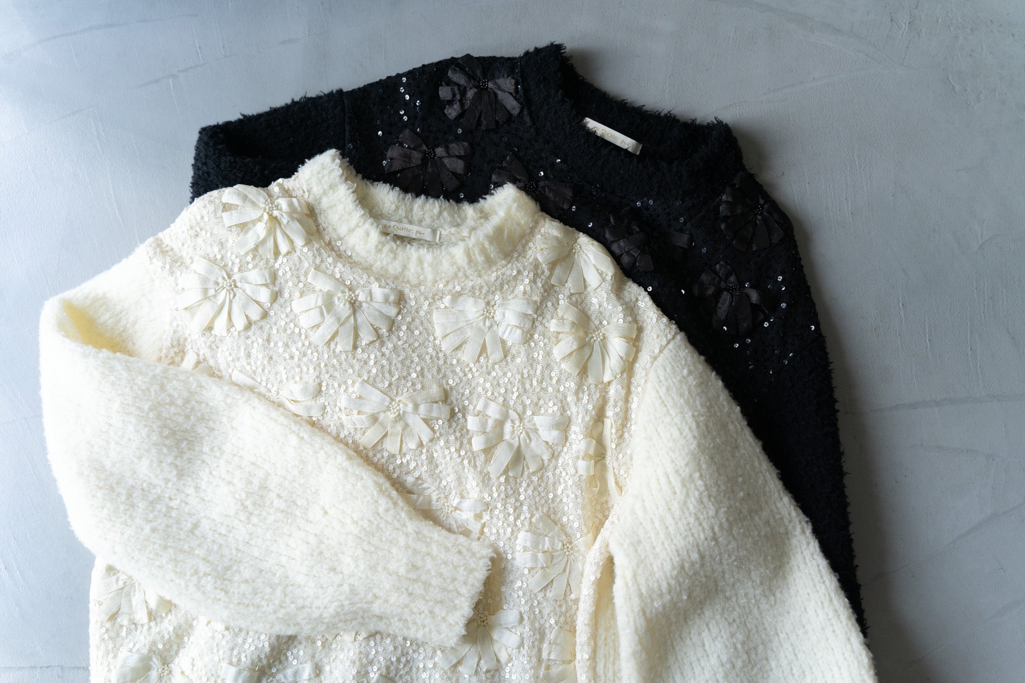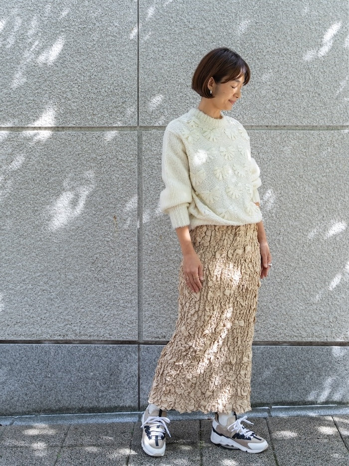 インドならではのリボンの手刺繍やスパンコール刺繍を施した贅沢なボディパーツと組み合わせた、新しい試みのアイテムです。ne Quittez pasのスカートやパンツに合わせて、冬のヌキテパスタイルをお楽しみください。