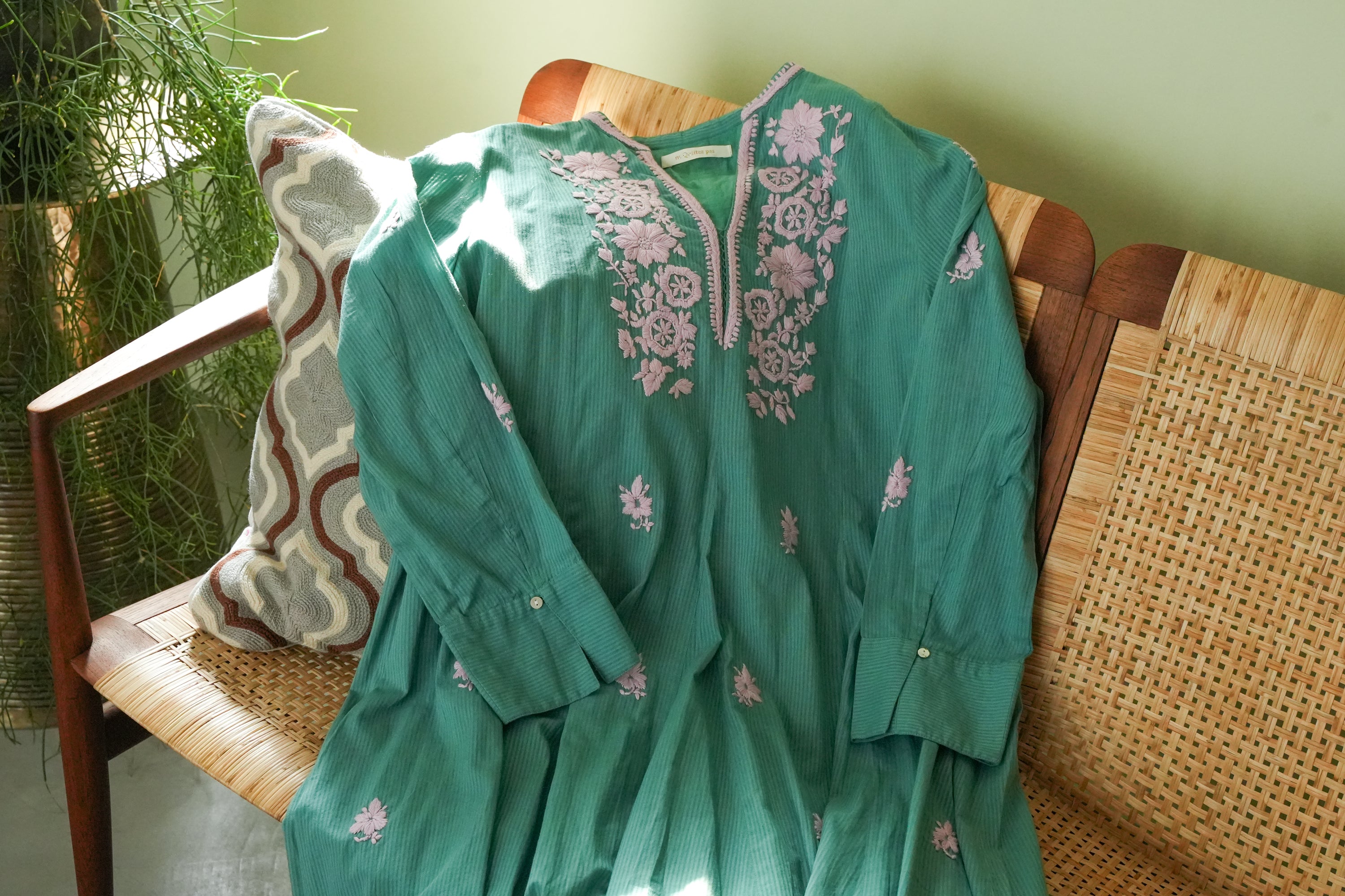 Dobby Stripe Chikan Embroidery Panel Dress / ¥49,500(税込)