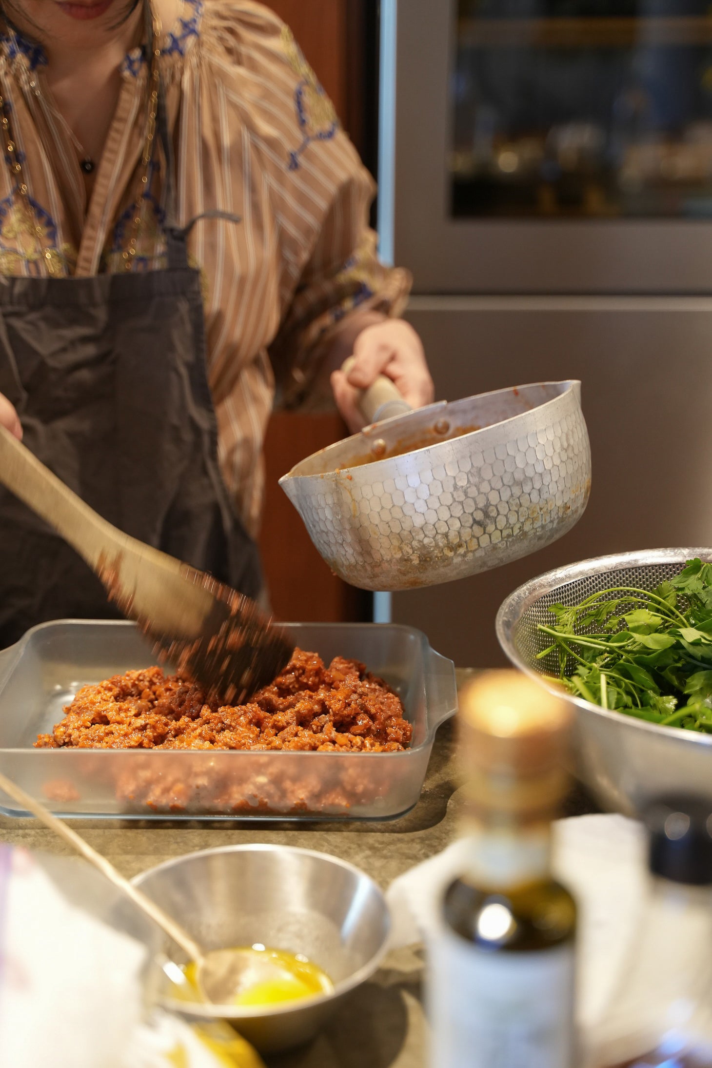 セアルさんのYouTubeのルームツアーを撮影している間に、亮子さんはキッチンでお料理。ご著書に掲載されているホームパーティーにおすすめの3品を中心に、センス溢れるランチを振る舞ってくださいました。「今日のメインはヨーグルトソースのムサカ。ひき肉料理だけれどさっぱりとした味わいで、どんな方にも喜ばれる一品です」──by 亮子さん
