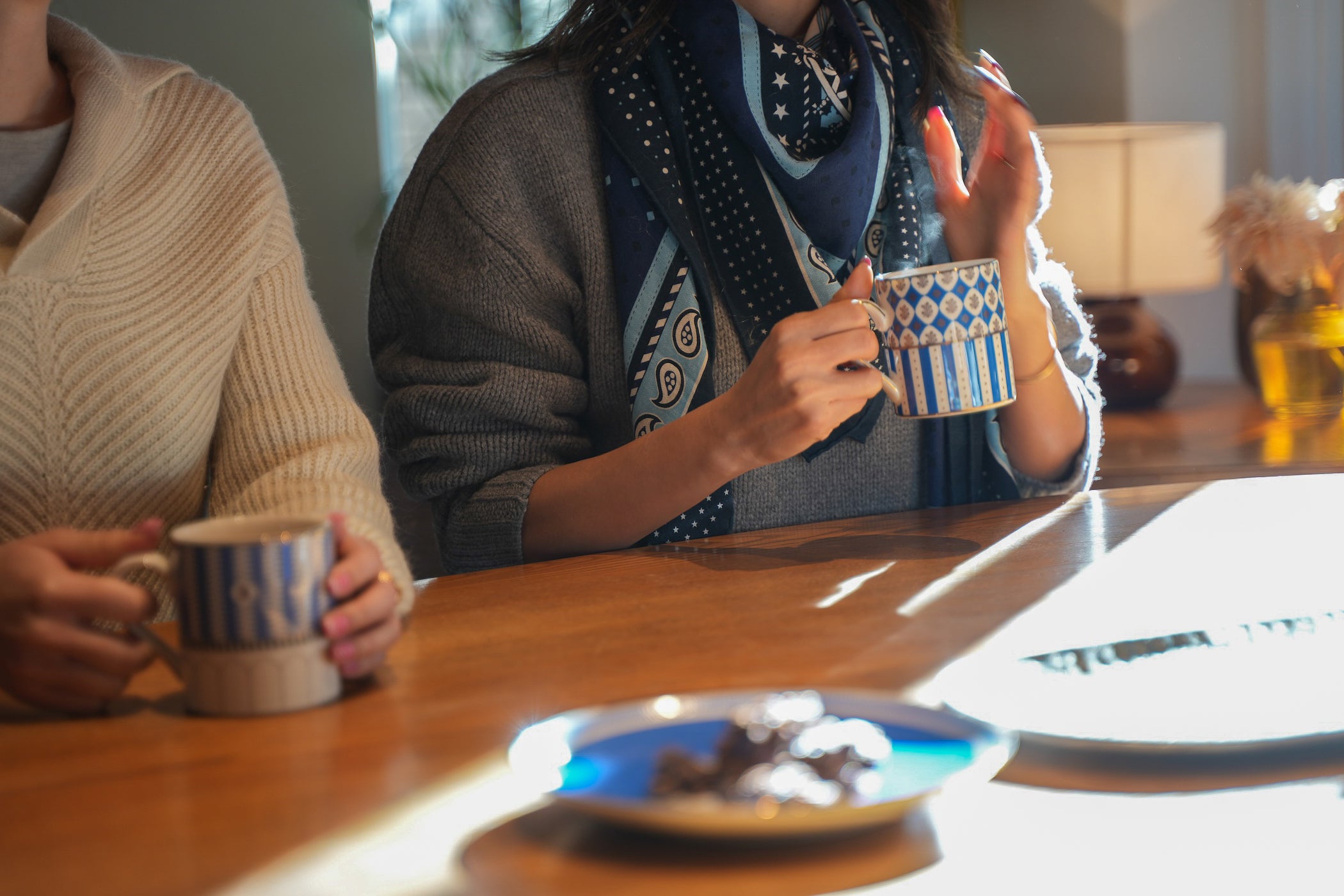茶器は、Pasand Homeの「The Blue Collection」。アートディレクター・川上恵莉子さんによるデザインです。Pasandのシグネチャーカラーであるブルーを基調に、インド建築や工芸、テキスタイルなどを、現代の暮らしに馴染むテーブルウェアとして再構築したもの。カジュアルに使えるマグカップは、サッと手に取りやすくWelcome Teaにぴったりです。この日、セアルさんとMamiは久しぶりの再会。お茶を片手に、積もる話に花が咲きます。