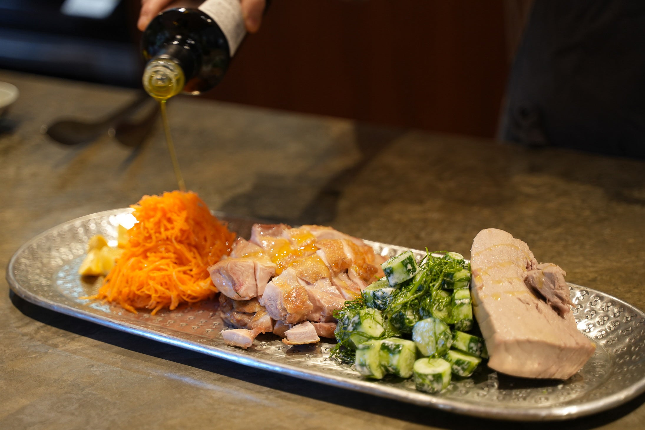Pasand Homeのトレーの上に、グリーンサラダのトッピングとなるお料理を盛り付けていきます。