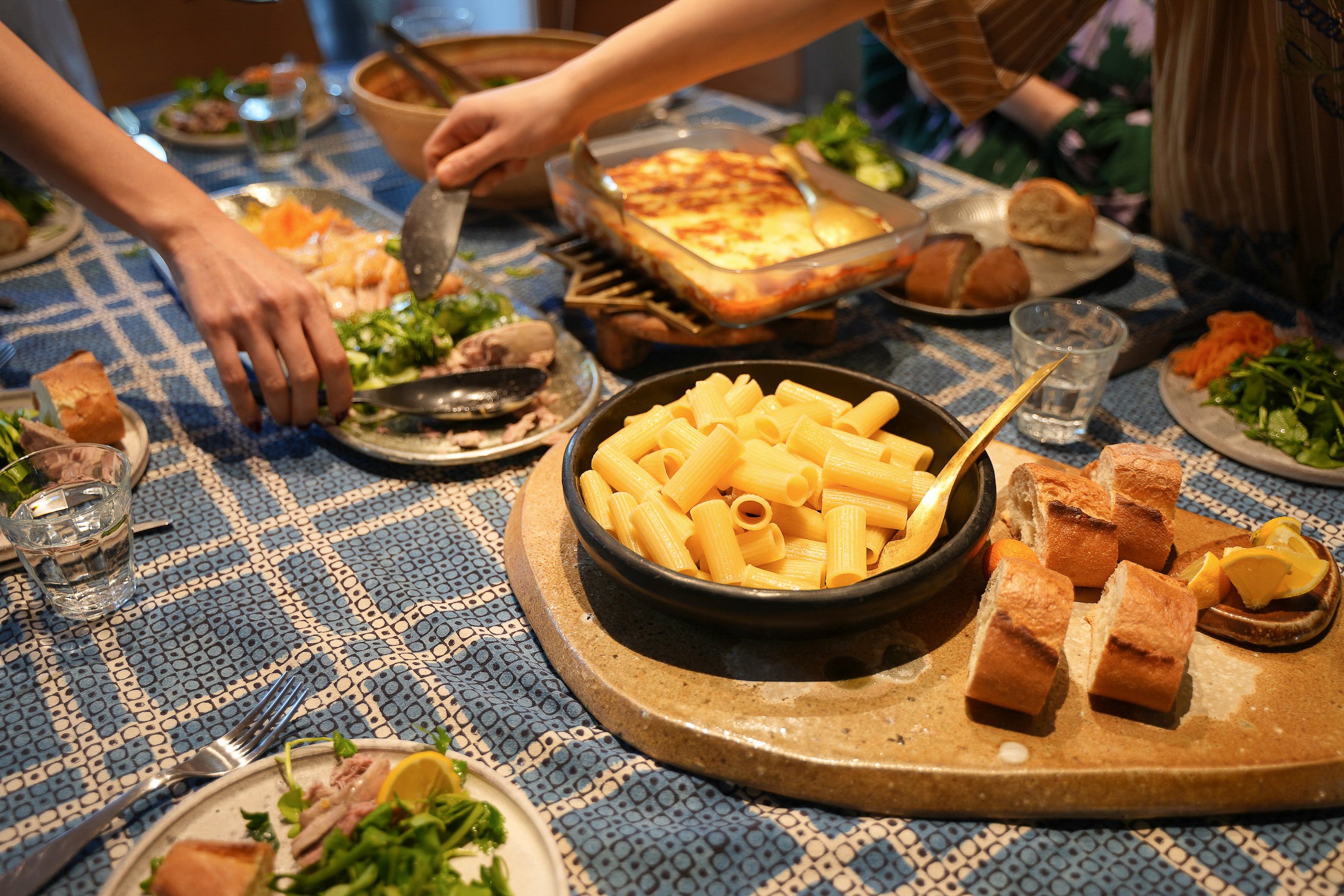 料理家の亮子さんは、お料理はもちろん、盛り付け方にもこだわりがたくさん。「自分で一通り作ることが多いですが、ゲストにも気兼ねなくキッチンに入ってもらって一緒にお料理を楽しむこともあります。ホームパーティーでは、小皿に分けるよりも大皿に盛り付けた方がテーブルが華やかに。今日の盛り付けに使用したPasand Homeのもののような横長のトレーは普段からよく使っています。オリーブや生ハムなど、シンプルな食材をのせてもサマになっておすすめです」──by 亮子さん