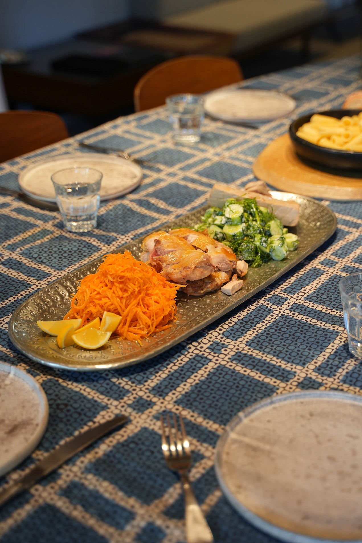 テーブルクロスは以前Pasandで販売していた、インドに古くから伝わるブロックプリントのもの。手のひらサイズの木版にインクをつけて、ひと押しひと押し職人が作り上げていく手法で、機械では出せないハンドメイドならではの優しい風合いが生まれます。お料理が映えるシックなネイビーの色味のテーブルクロスは、ダークトーンなのでシミが付いてしまっても目立ちにくいところも便利です。