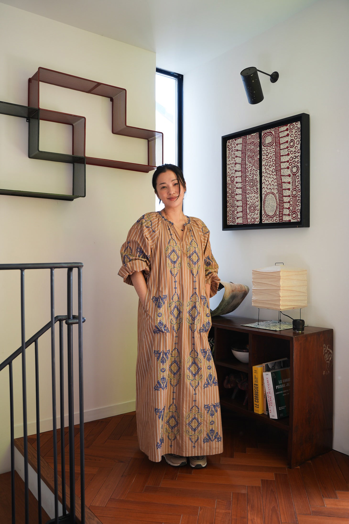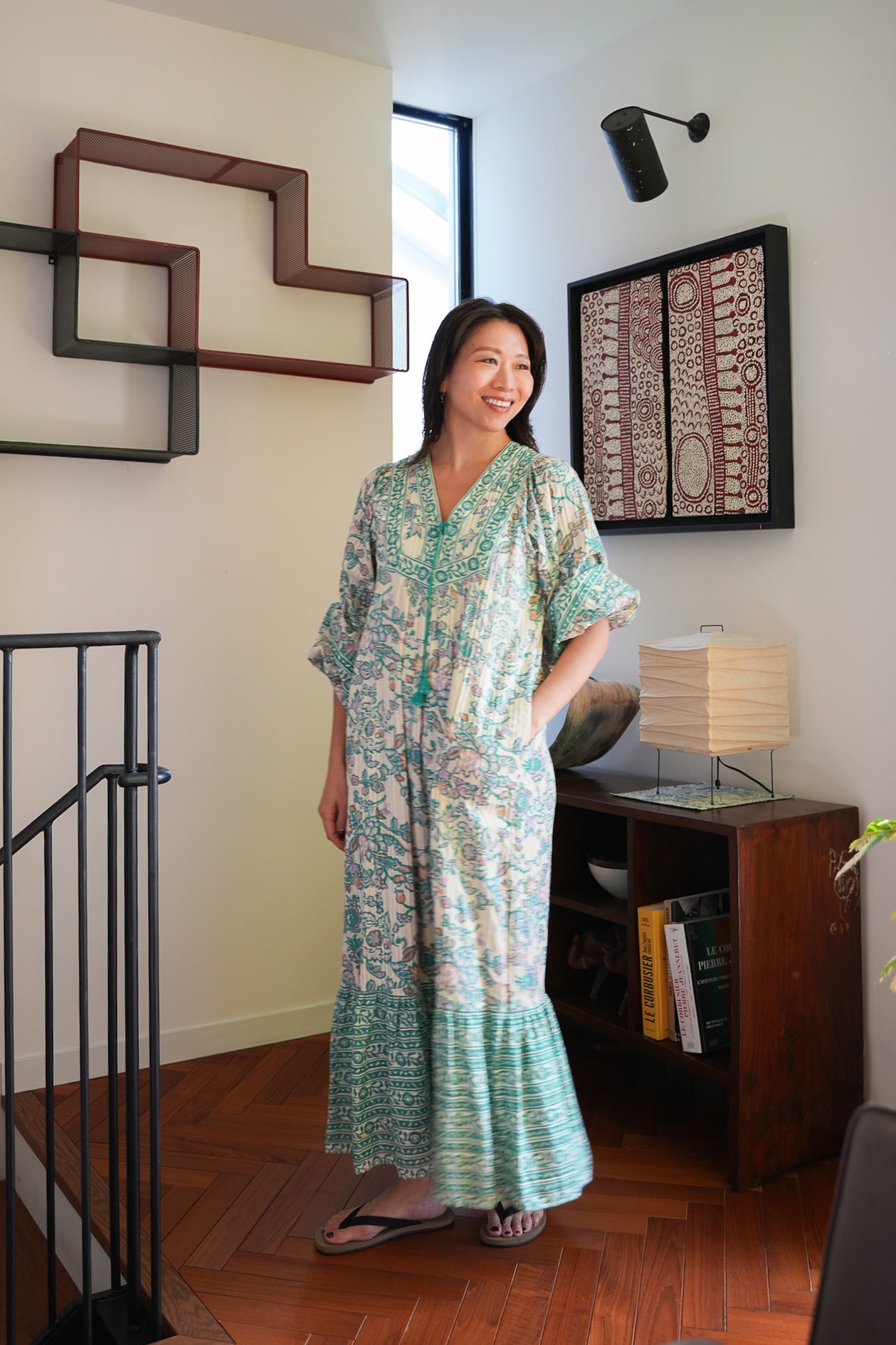 亮子さんは、デニムやニットに合わせてデイリーにPasandのドレスを楽しんでくださっているそう。ホームパーティーにはアリ刺繍が施されたSara mallikaのドレスをセレクト。インドの職人が手がけるアリ刺繍は、チェーンステッチのように繋がり、糸の光沢を存分に生かした技法です。「Pasandのドレスはポケットがついているものが多くて便利。水仕事をするので、袖にゴムがついていて、袖を捲ったときに留まる仕様も嬉しいです」──by 亮子さん