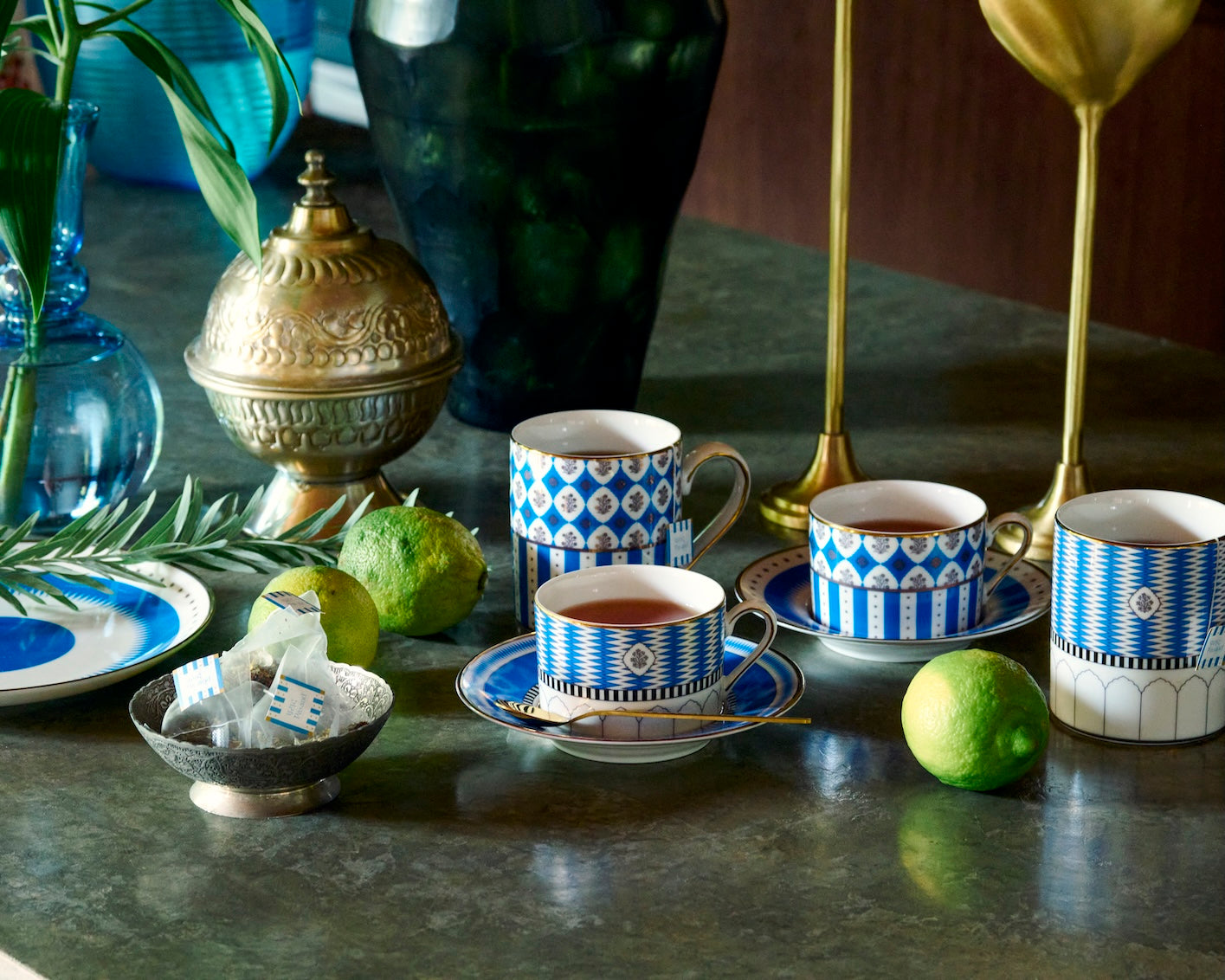 「テーブルにお花があると雰囲気が出ると思います。今回のような鮮やかなブルーの茶器には、アクセントとして濃いピンクのお花を飾っても素敵です。例えば、一輪のバラや、ダリアや、ケイトウなど。服を選ぶように、茶器と花のテーブルコーディネートを考えるのも楽しそうですよね。あとは、デザイン自体がインドをテーマにした異国の空気感を感じられるものなので、チャイなど、スパイシーなお茶を淹れるのもいいですね。今回の『The Blue Collection』が、みなさまの日常の中で心地よく、特別な時間を演出できたら嬉しいです」
