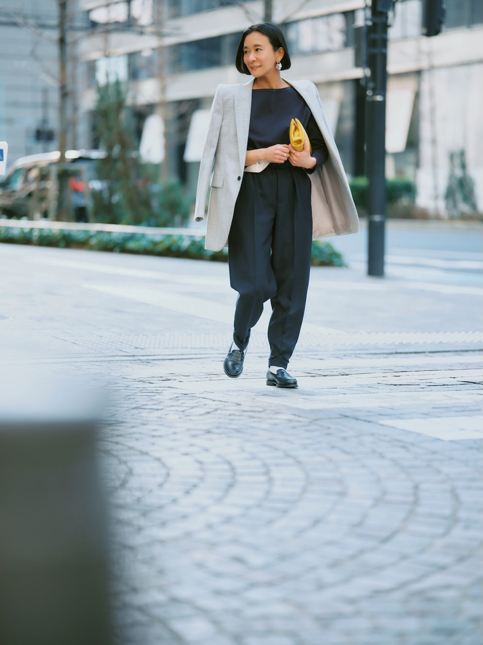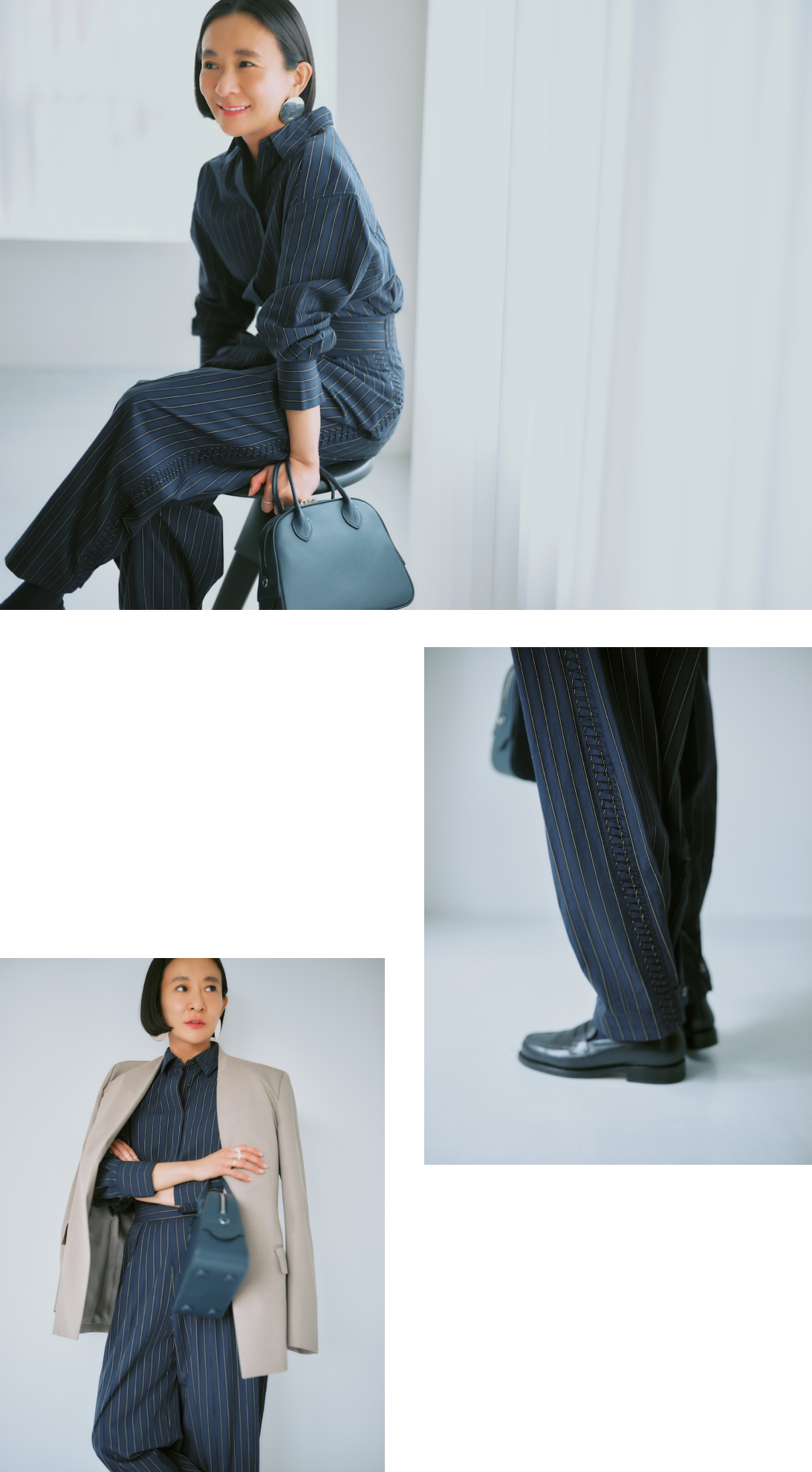 「オフィスやホテルなど、きちんと感が求められる場にも自信を持って着ていける服をイメージして作りました。カチッとしたフォルムに仕上げるために、ハリのある生地や構造にこだわっています。肩の部分は生地を重ねて、ややパワーショルダーに。パンツのセンターに施されたタックも、きれいめな印象をキープできる秘訣です。ウエスト位置を高く設定しているので、脚長効果も狙えます。ハンサムな一枚なので、クラッチバッグやヒールを合わせてレディライクにスタイリングしました」