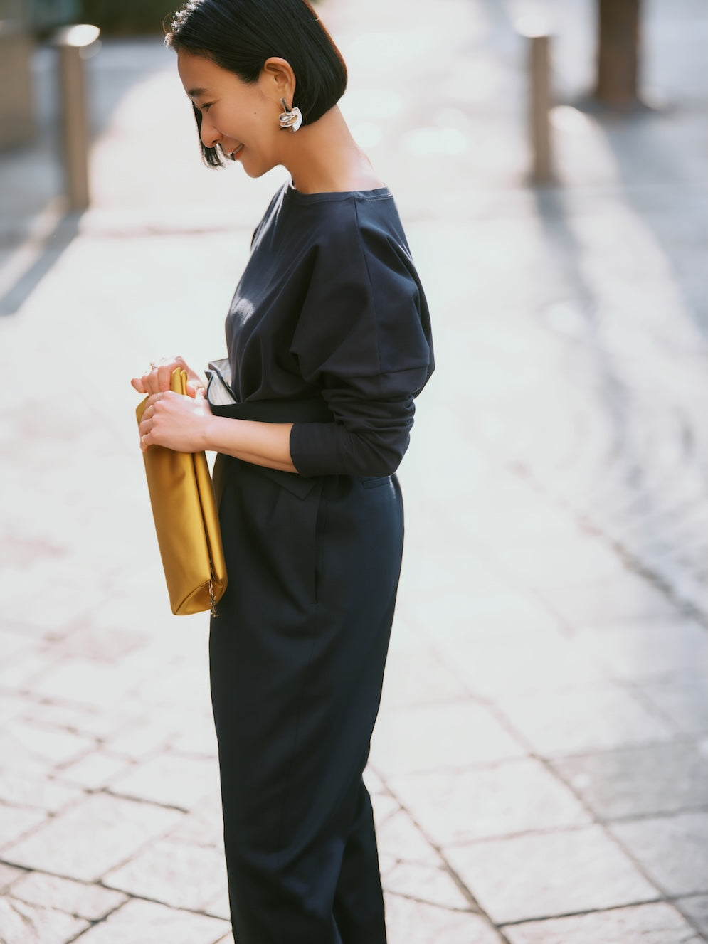 「まだ肌寒さの残る初春は、ニットだと暑いけれど、普通のロンTだと薄すぎたりカジュアルすぎたりして仕事には着ていきづらい。なので、それを解決してくれる程よく地厚で女性らしいシルエットのきれいめなカットソーを作りました。働くシーンでは袖をまくることが多いから、たくしあげたときに留まりやすいダブルカフス仕様に。顔周りがスッキリ見えるボートネック&ゆったりとした腕周りで、体型カバーも叶う万能選手です。背中のネックラインには、さりげなく煌めくシルバーのステッチラインを施しました」