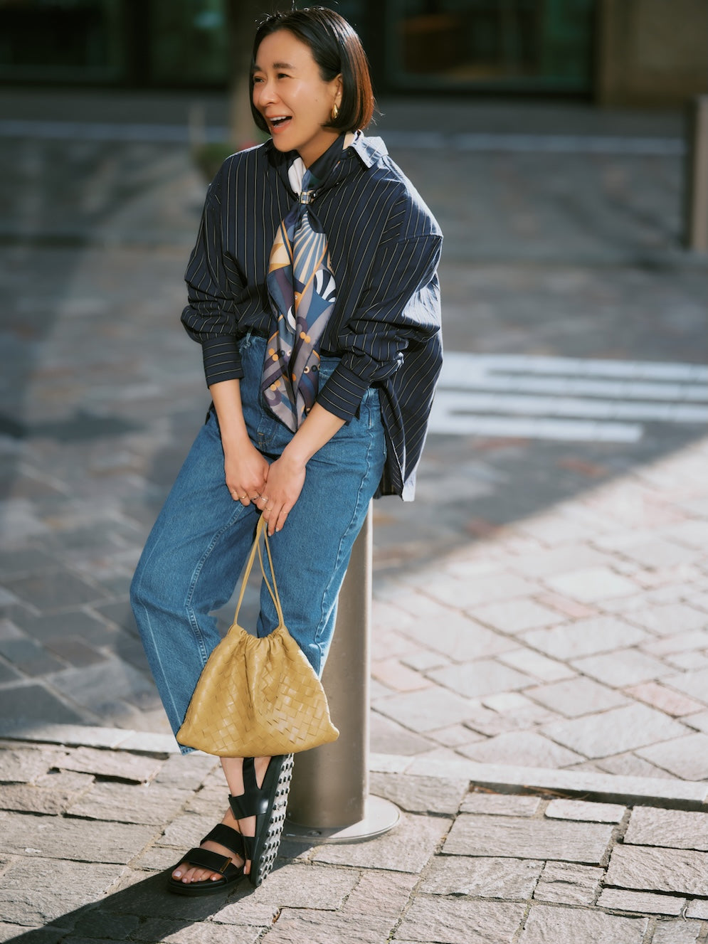 「シャツを休日に着るなら、デニム合わせで少しラフに。前だけINすると、ふわっとした立体的なシルエットを楽しめます。一見シンプルに見えますが、背中にはインドのクラフトならではの繊細なピンタックを並べた優雅なデザイン。肩部分は少し厚みを持たせて、ややパワーショルダーに。一枚で着るのはもちろん、羽織りとしてカーディガン感覚で着るのもおすすめです。首に巻いたスカーフは、スカーフリングを付けて襟の内側に巻きつけてみました」