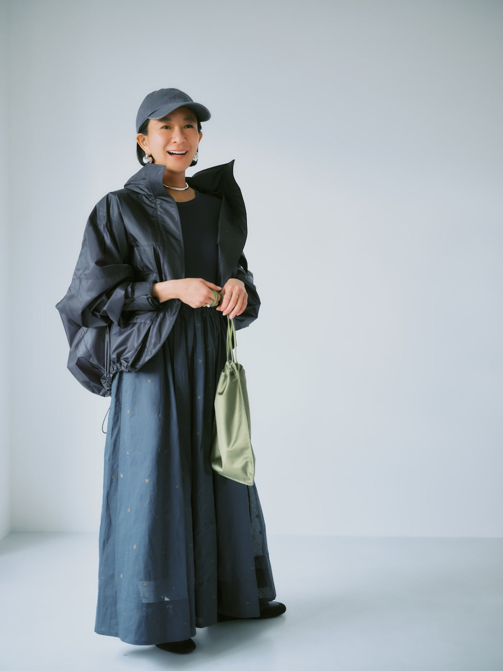「ネイビーのカットソーと、透け感が綺麗なコットンオーガンザのスカートを一枚着で楽しめる、ドッキングドレス。ジャケットやカーディガンを羽織れば肌寒い時期にも着られますし、夏も強い冷房や紫外線対策として七分袖が重宝。ロングシーズン活躍します。大人になると、どんどん肩が丸くなってくる気がしていて…。パワーショルダーでツンとしたシルエットを作ることで、大人の女性の肩周りを一気にシャープに美しく見せるデザインにしました。一枚で決まるので、忙しい朝にぜひ手にとっていただきたいです」