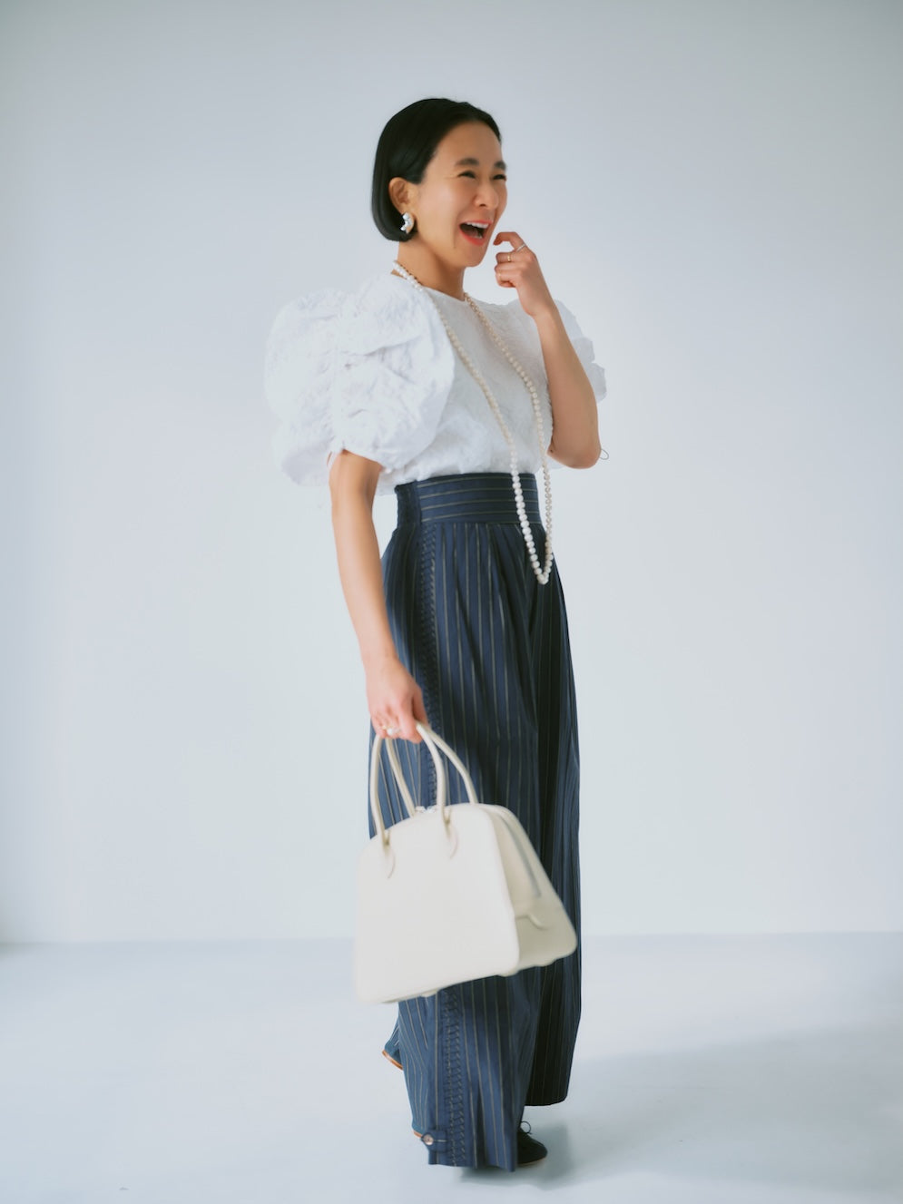 「“脚長効果がスゴい!”と毎回ご好評をいただくハイウエストパンツ、今回のコラボレーションでも作りました。サイドにはインドのクラフトならではの細やかなピンタックラインを施し、アクセントに。ウエストは後ろがシャーリングゴムなので、シャープな見た目に反して、ゆったりとラクに穿けます。メンズライクなムードのパンツなので、あえて甘いブラウスとスタイリングしました。どんなトップスも受け止めてくれるデザインなので、ワードローブに一本あると重宝するはず」