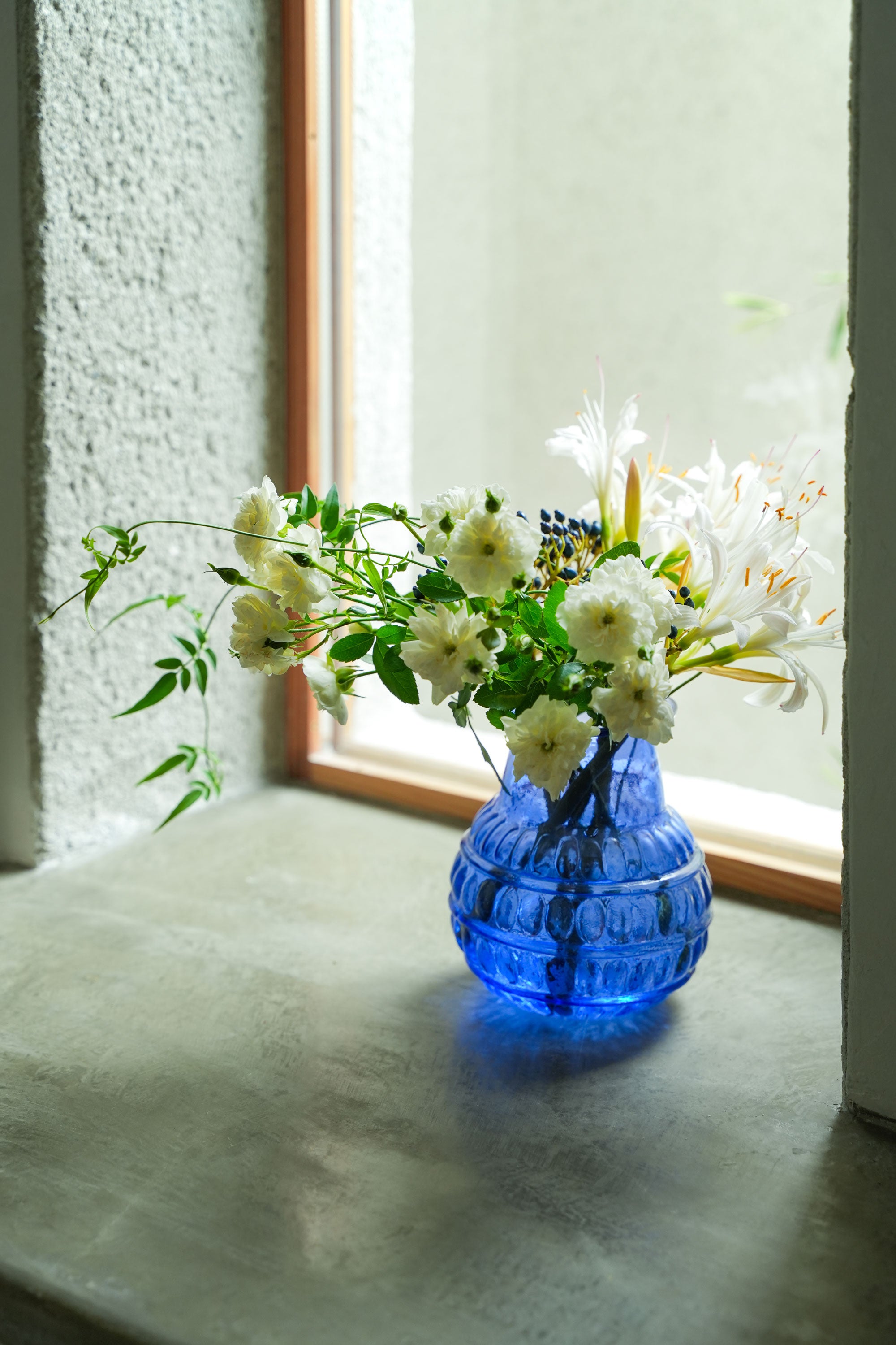 「鮮やかなブルーの花器。色物の花器は難しいと思われがちですが、シンプルな花を生けてもおしゃれにまとまるのでおすすめ。今回は白系の花をセレクトしましたが、同色系のブルーや、あえて反対色の黄色系の花もよく合います。丸くボリュームがある形状の花器なので、花もボリュームを持たせて生けるとバランス◎。バラのグリーンアイス、ネリネ、ビバーナムティヌスを低めに生けて、最後にバランスを見ながらジャスミンの葉を添えました」by Ruri Komeno
