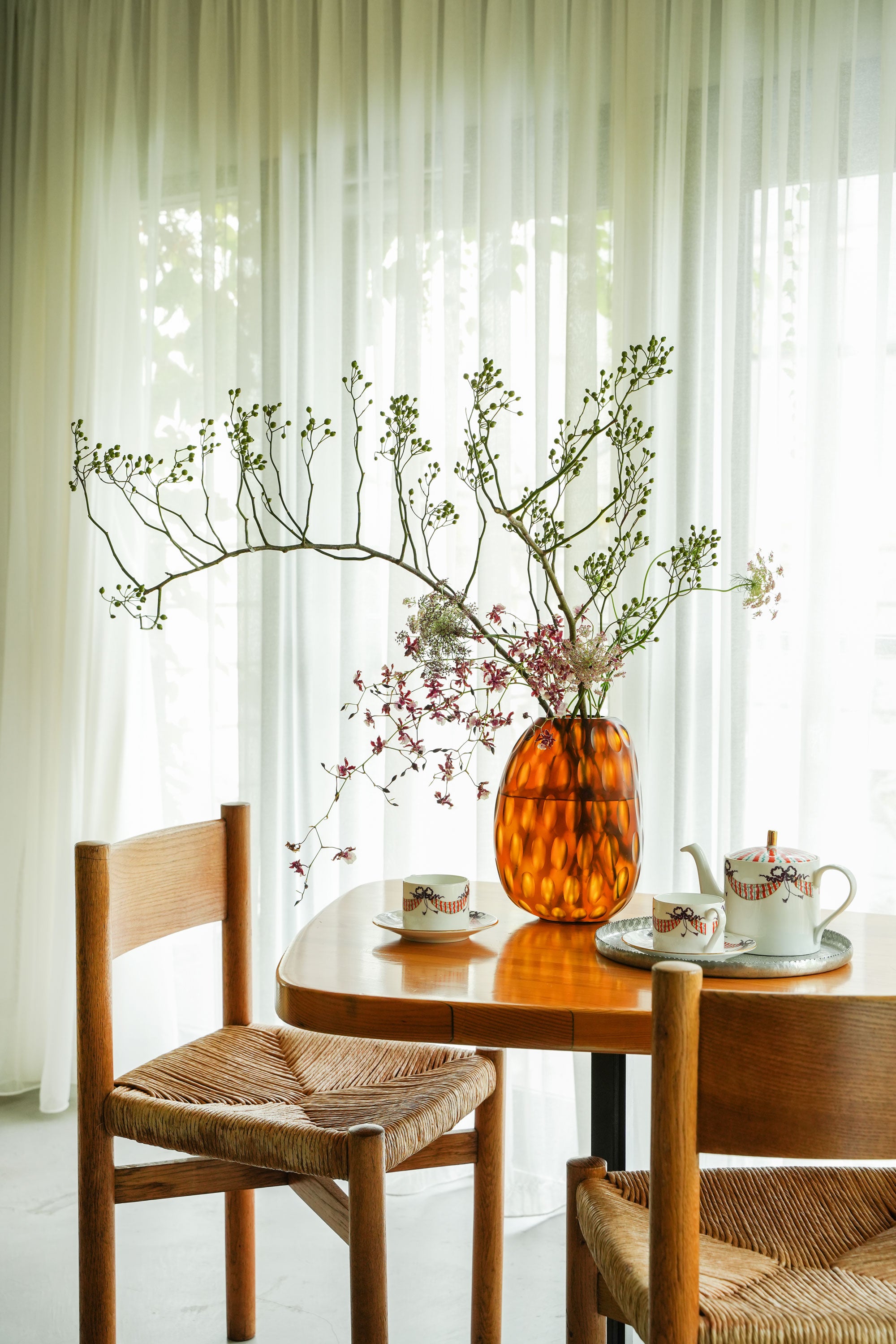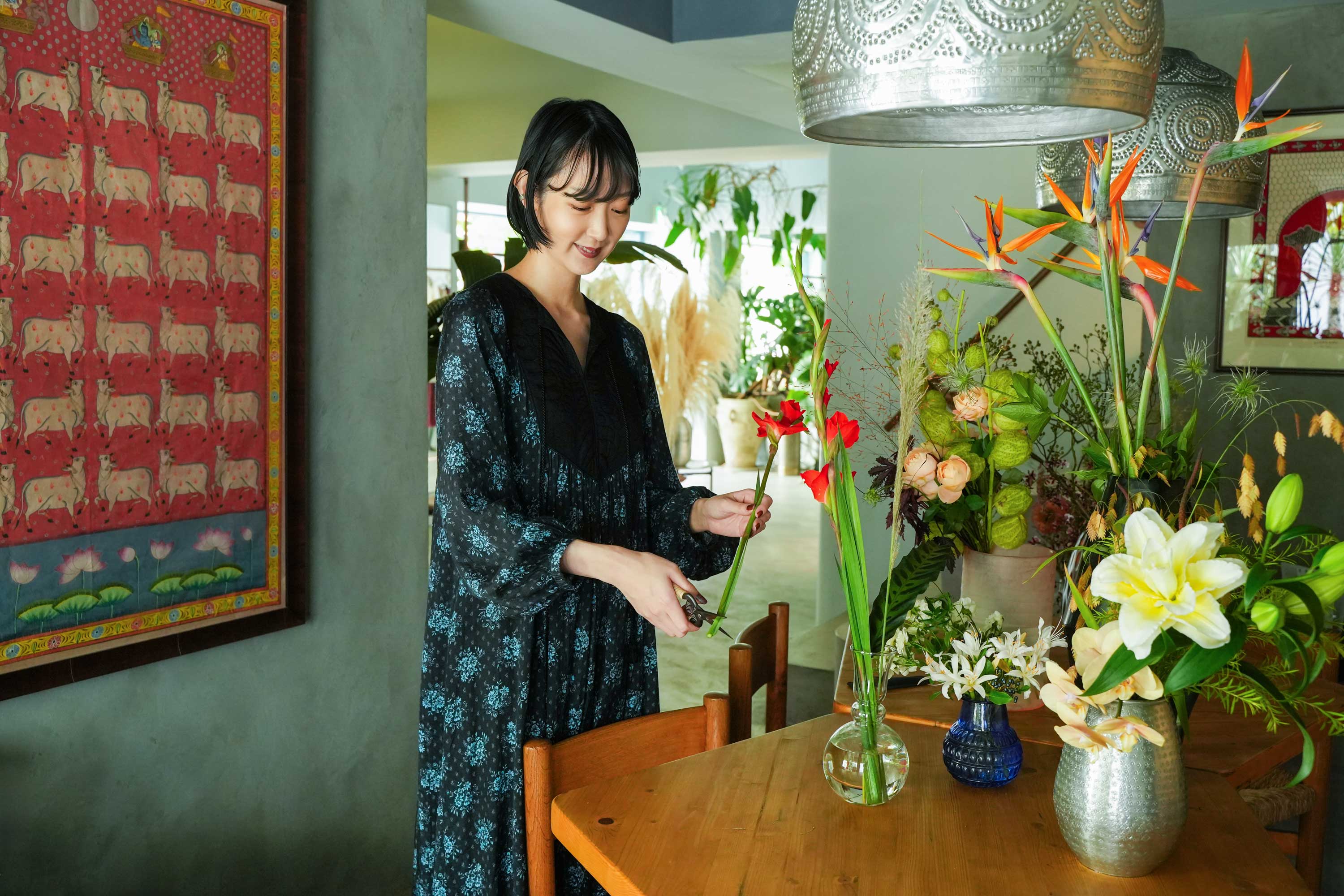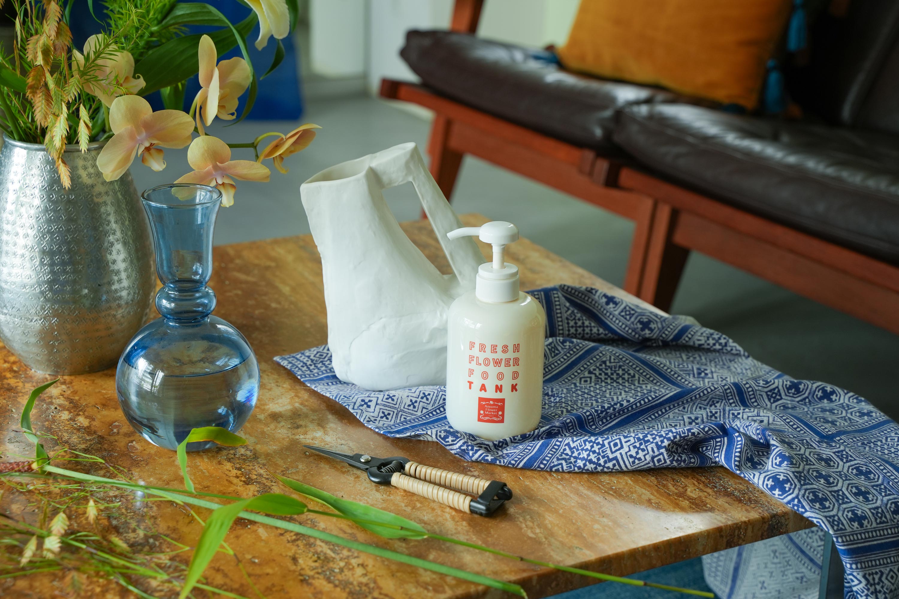 「花を生ける際に用意したいのは、ハサミ、栄養剤、カラフェ、布。キッチンバサミや文房具バサミで切ることもできますが、清潔に管理され、切れ味のいい花専用のハサミで切った方が持ちがよくなります。栄養剤は、入れた方が花がより綺麗に、長く咲きます。水換えの頻度も減って楽ちんに。カラフェは、複数の花瓶に生ける際にあると便利です。水がこぼれたり飛んだりしやすいので、布を敷くのもマストです」──by Ruri Komeno