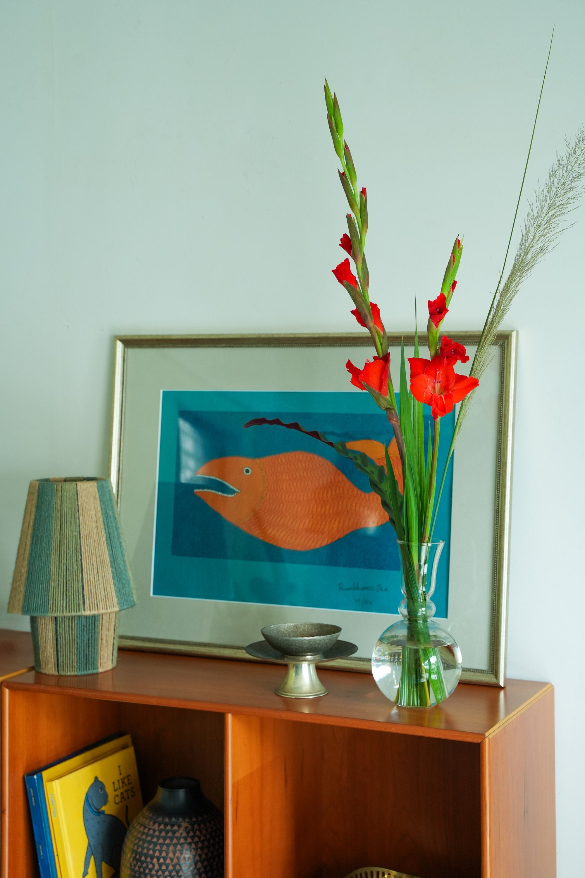 「一見、一輪挿しのように見えますが3~5本くらいの花を生けられる花器。このくらい口が狭めの花器は、迷わずに生けられるので初心者の方にもおすすめです。また、透明なので生ける花の色を選ばないところも使いやすいポイント。基本的に、花を生ける際は1:1が黄金バランスですが、今回のように上の方が細くなっている花やグリーンは軽い印象なので1:1.5くらいのバランスでもOKです。少ない本数で生ける時は、今回メインにしたグラジオラスのような発色のいいものを選ぶと見栄えよく仕上がっておすすめ」by Ruri Komeno