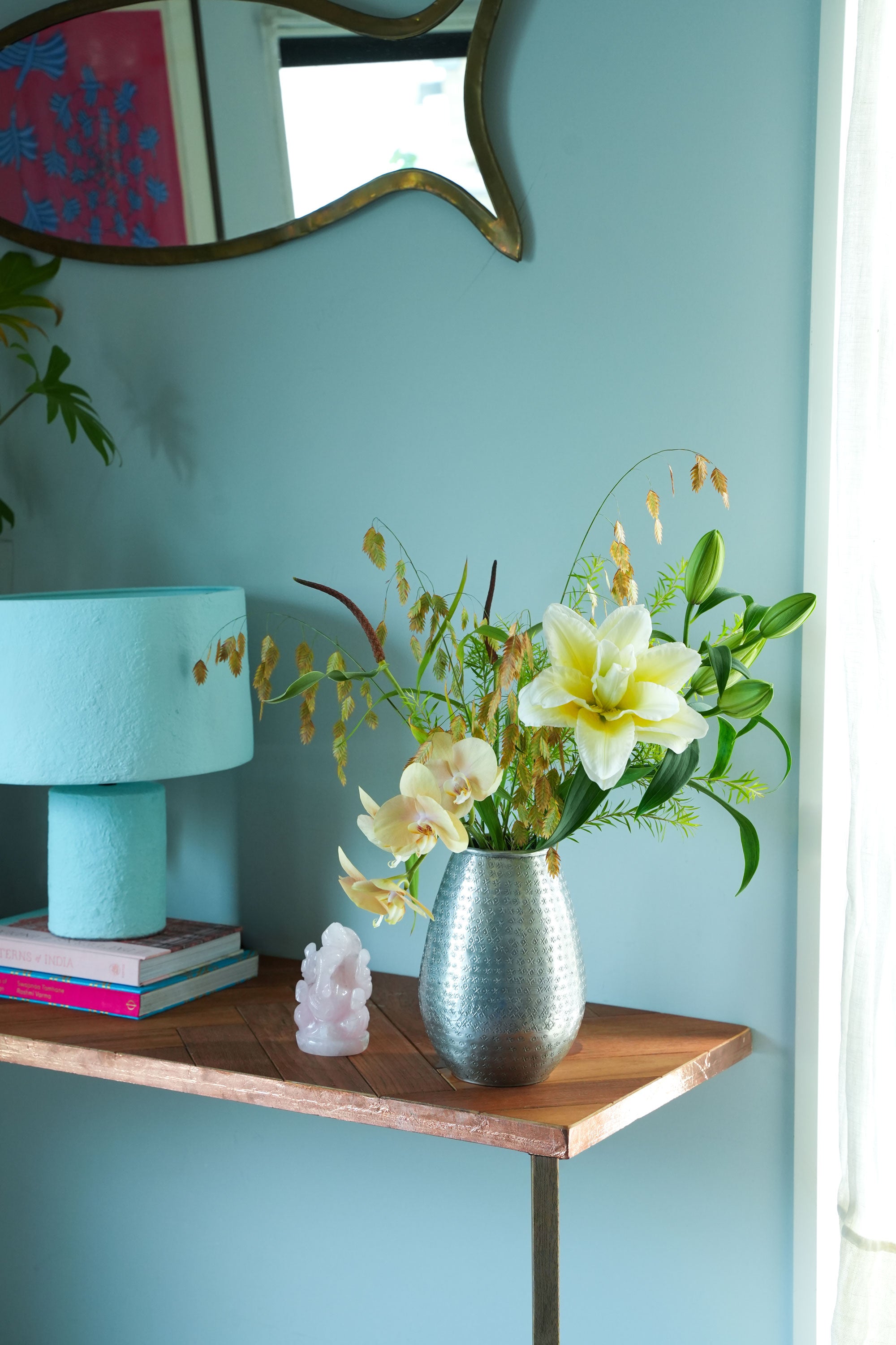 「アルミ素材が珍しく、どんなお花もおしゃれに生けられる花器。下に膨らみがあるデザインなので、大ぶりの花と相性がよく、今回は百合を選びました。まずはメインの百合を生けて、間を埋めていくようにアンスリウムを入れ、バランスを見ながら胡蝶蘭とグリーンスケール、メラレウカを添えていきます。今回は、全体的に黄色がかった色味でまとめたのがポイント。花をよく観察すると、一輪の花の中にも様々な色味が入っています。そこから色味を拾って組み合わせていくと、単調すぎない同色系でバランスよくまとまります」by Ruri Komeno