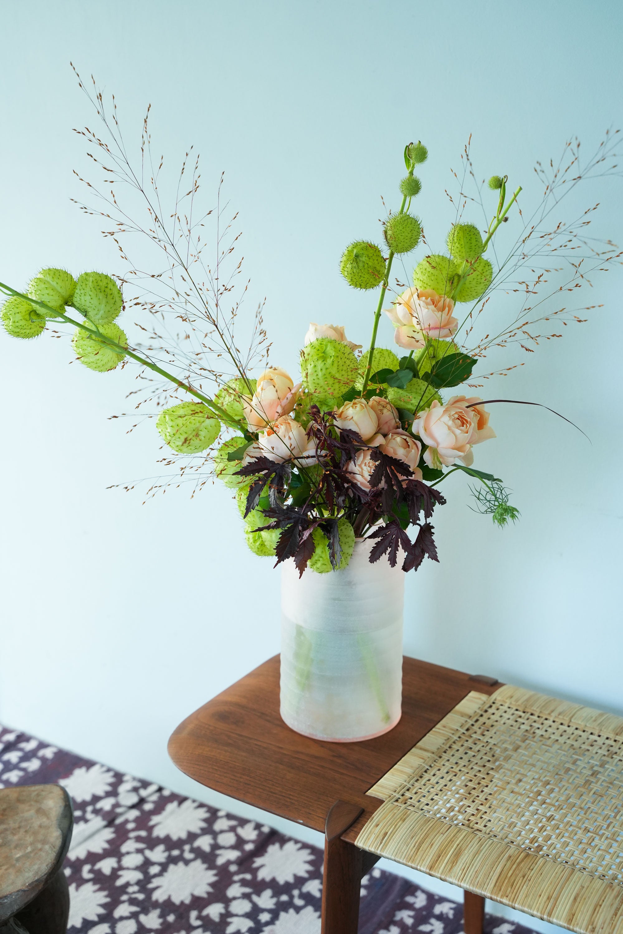 「フロストがかったような質感で、柔らかな印象の花器。口が広めなので、花はブーケのように束ねて入れると、少ない本数でもバランスが取りやすくおすすめ。花器の色味に合わせて、淡い色味で柔らかい印象のバラとフウセントウワタをセレクト。全体の印象を引き締めるために、深い色味のグリーンを足しました。ブーケの束ね方としては3本のフウセントウワタを基軸に、バラ、パニカム、ヒマの順で間を埋めていきました。ギフトでもらったブーケを、束のまま生けるのにも最適な花器です」by Ruri Komeno