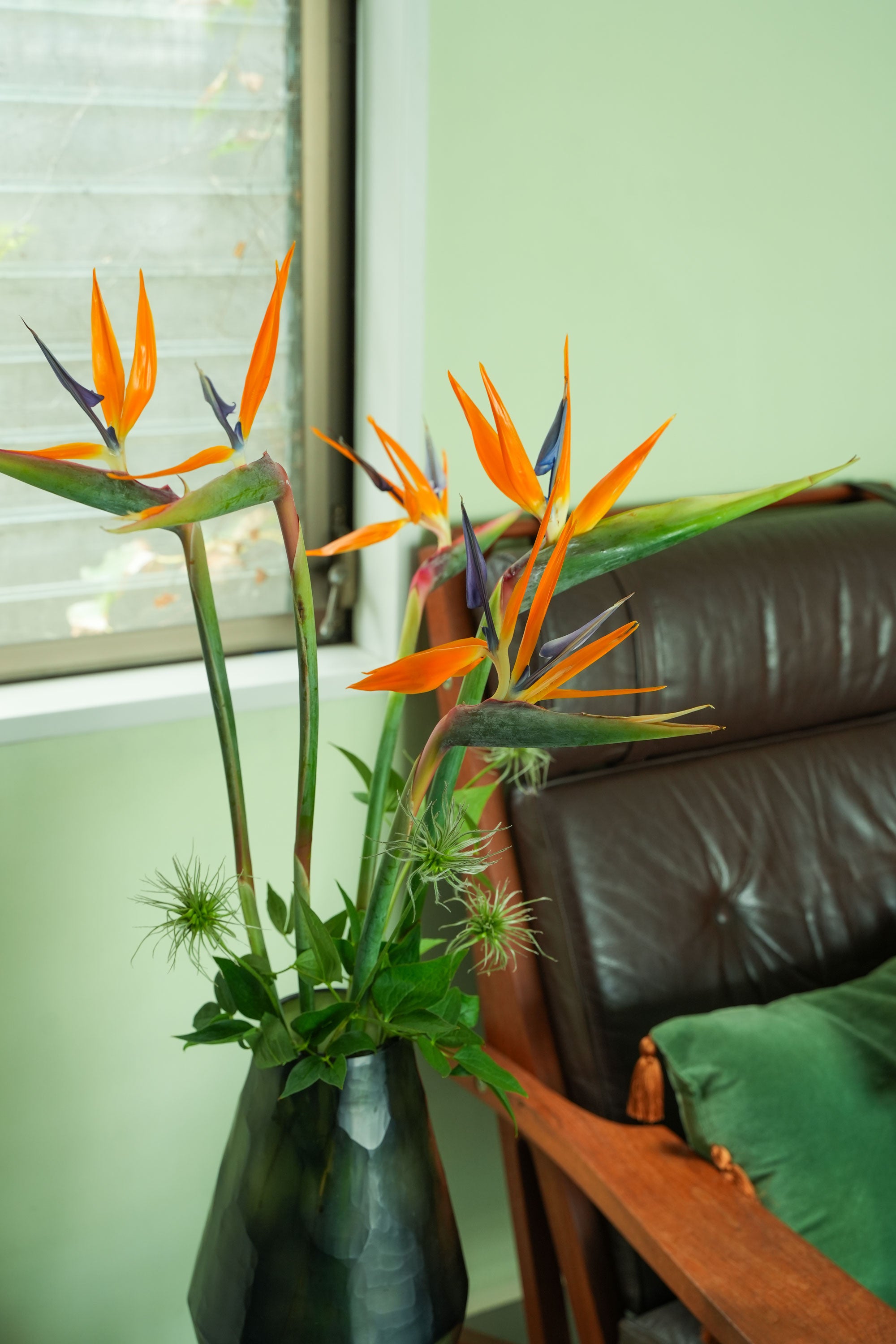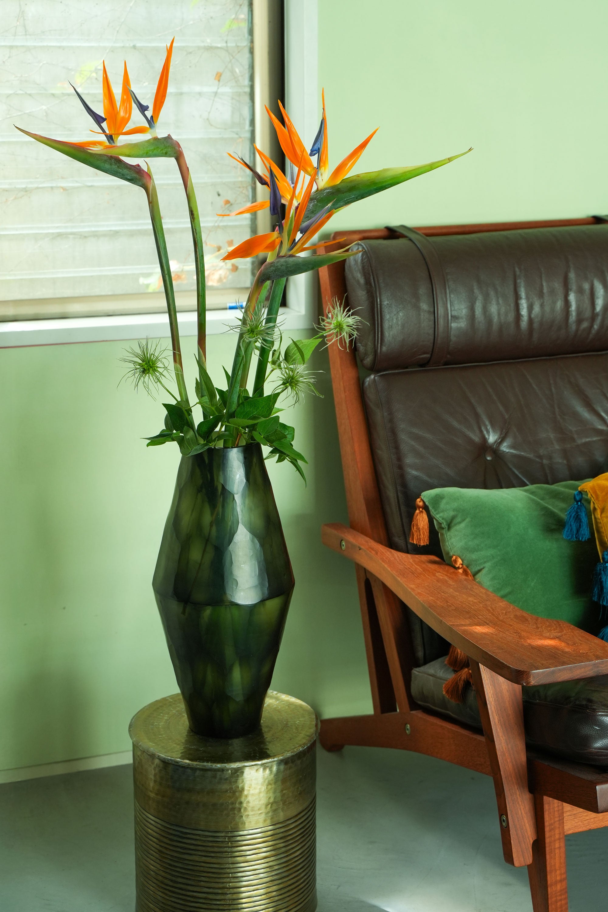 「オブジェとして床に置くだけでも様になる大きな花器。枝物を生けるのにも最適な大きさです。今回は花器に合わせて、高さと存在感のあるストレリチアをメインに、足元にはクレマチスシードを添えました。基本的に、花器に対して花の高さは1:1で生けるのが好バランス。花器の中に入る部分の葉を綺麗に取り除くと、全体がすっきりした印象に見えます。夏になったら、ドウダンツツジのような大きめの枝物を1~2本生けるのもおすすめです」by Ruri Komeno