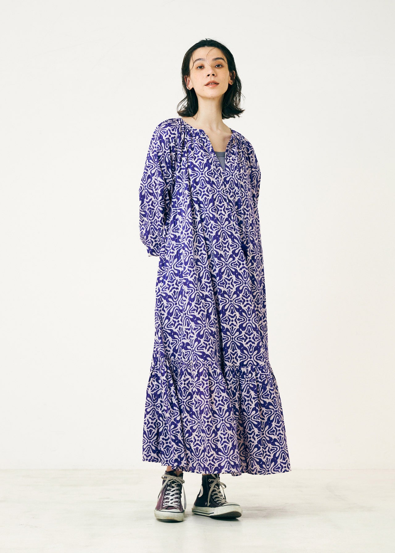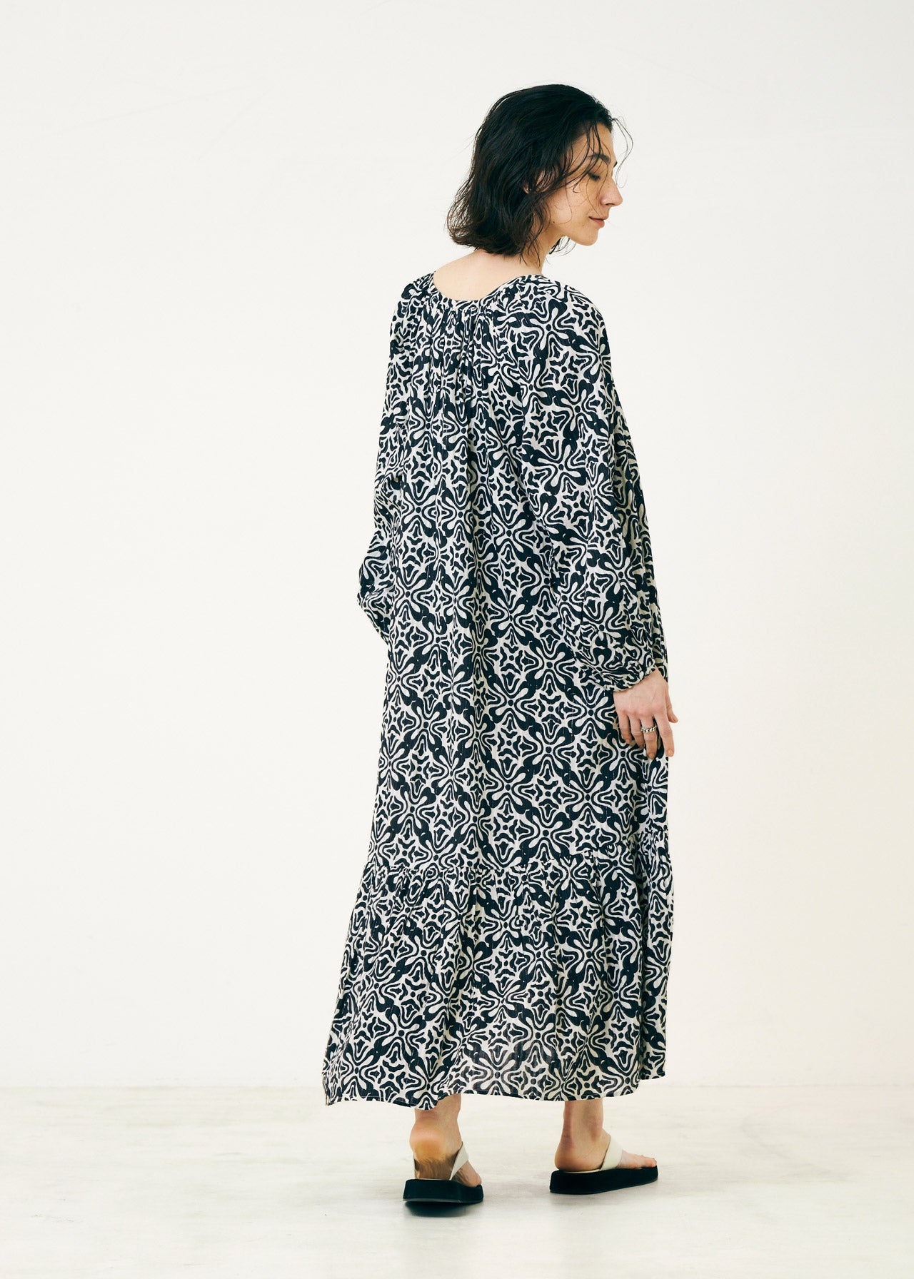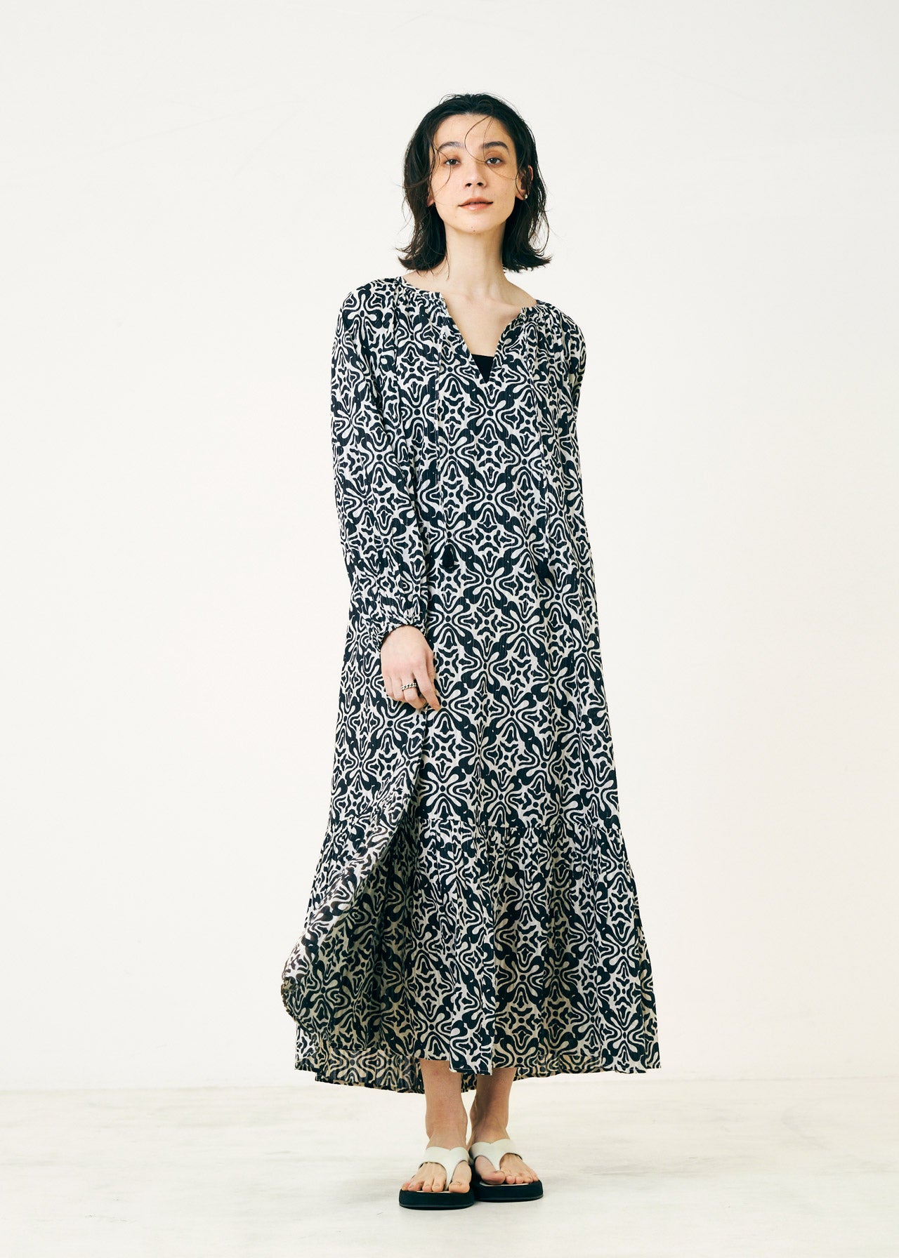 水滴をポトンと落とした時に広がる波紋のようなモチーフを全面にプリントしたロングドレス。