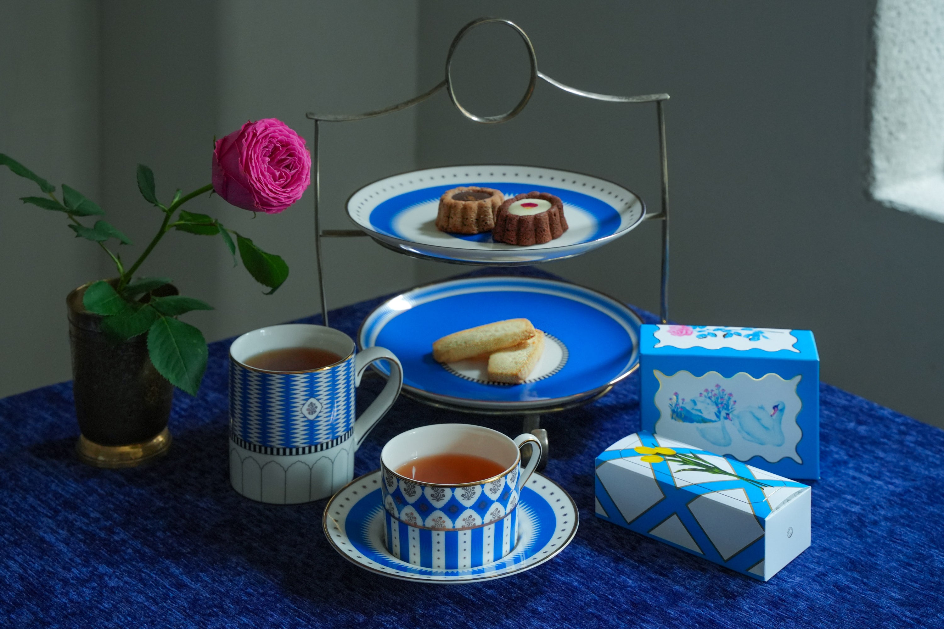 お菓子・食器・ファッションが響き合う、ブルーの世界観に包まれた空間でお迎えします。