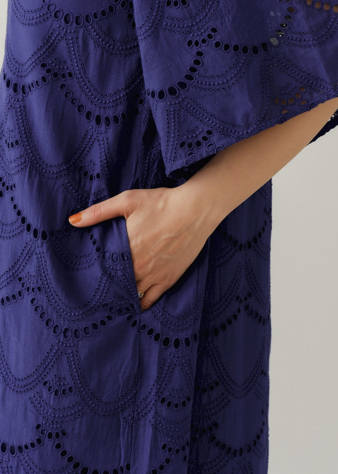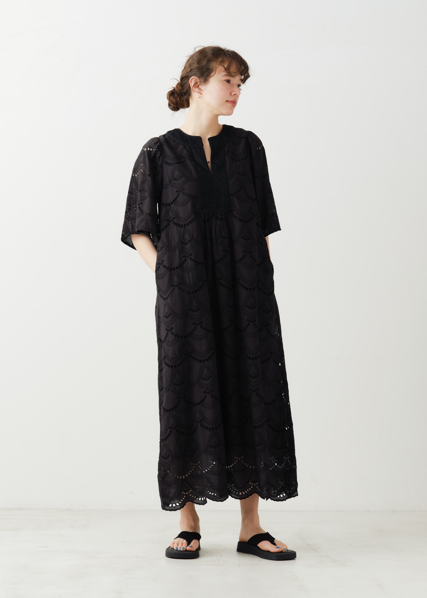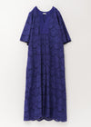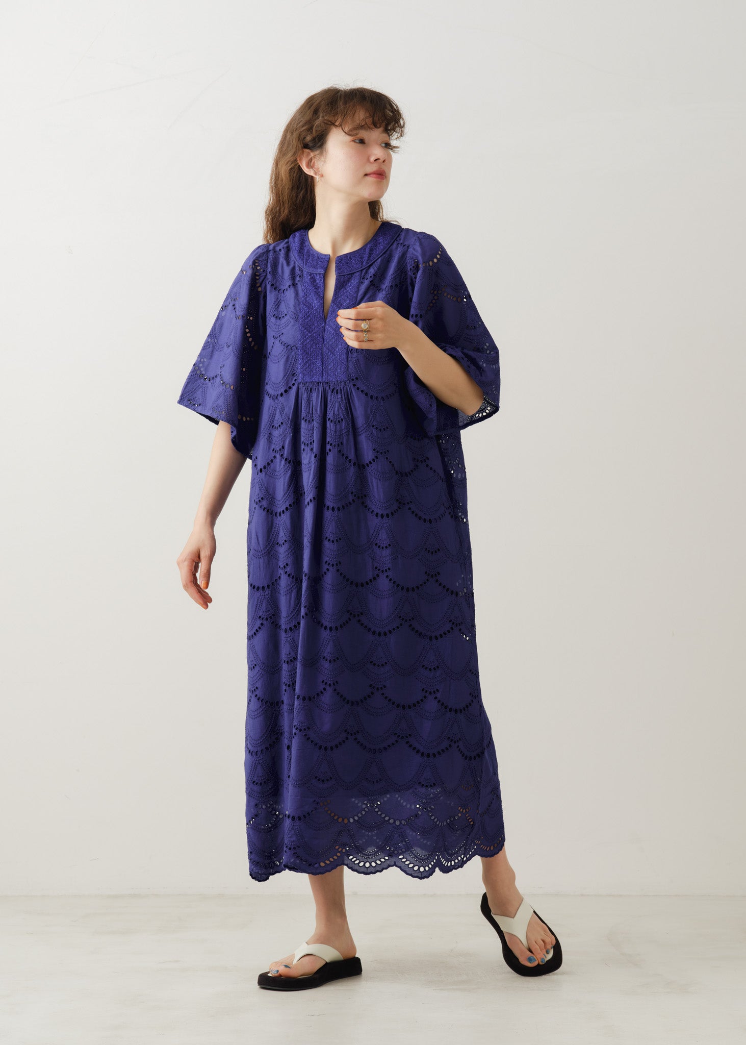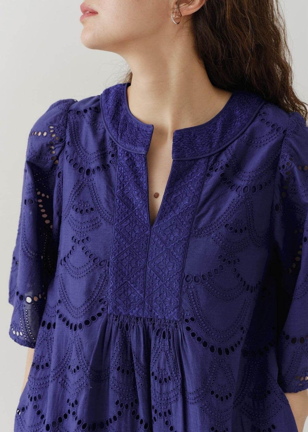 An original motif inspired by the Indian tribal art "Gond", which uses many dots, is expressed with delicate hemla embroidery. Dresses that stand out with delicate techniques unique to India give a sophisticated impression and look gorgeous. The material is a light cotton voile material. The airy and fluffy flared sleeves keep you cool even in the middle of summer. The sharp slit on the chest makes your décolleté look neat and beautiful.