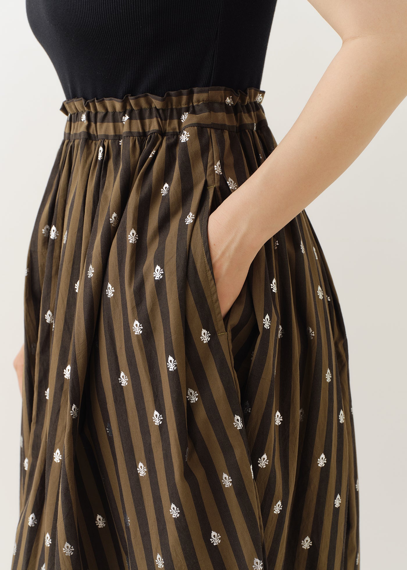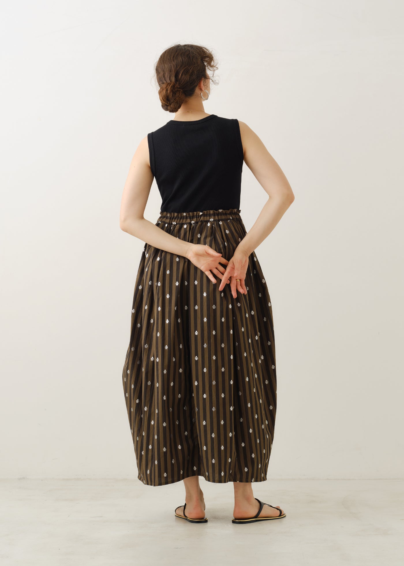 ウエストゴムでゆとりもありながら、ウエスト周りはタックで抑えて広がりすぎないつくり。