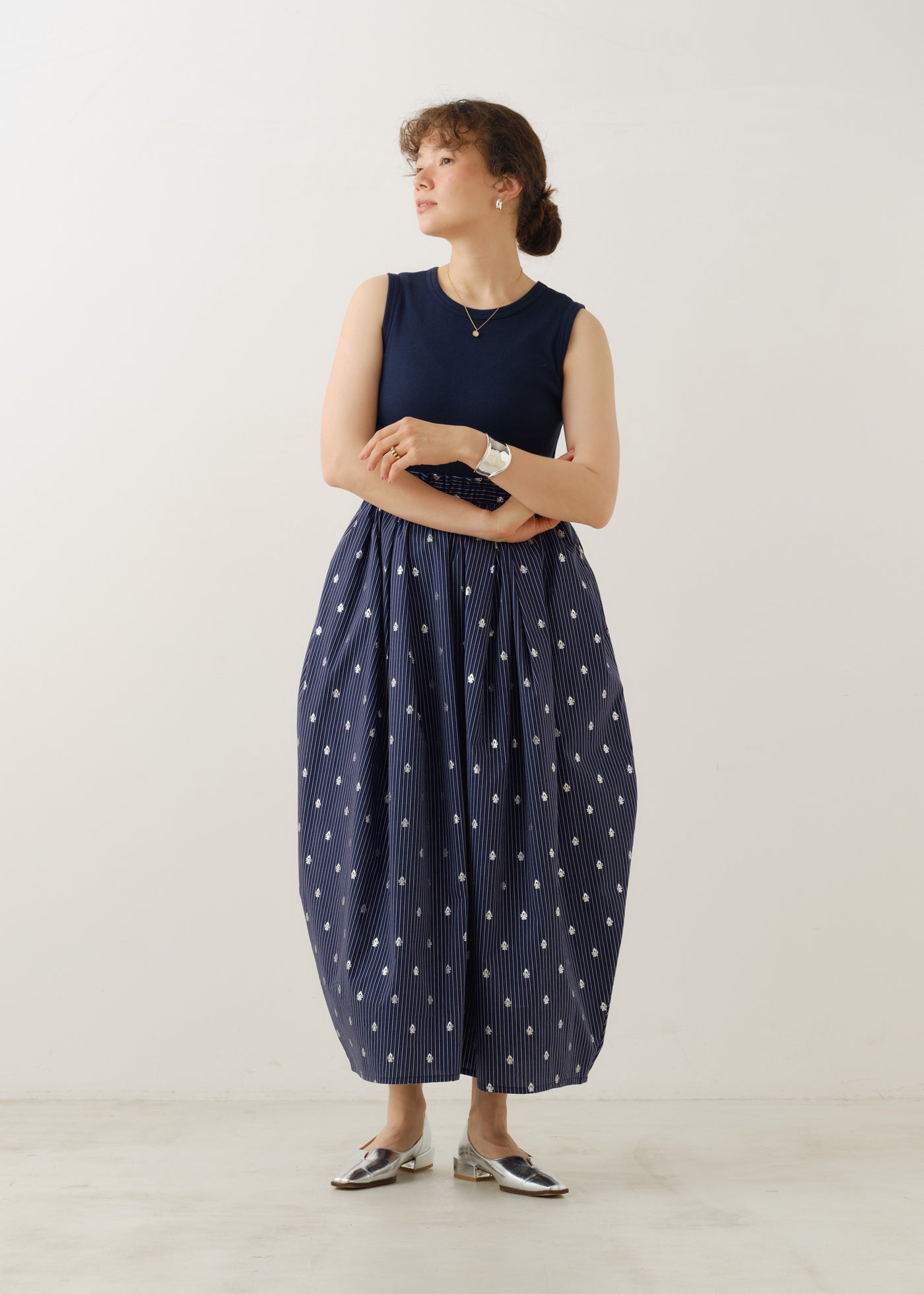 身体につかず離れず、ヒップ周りのふくらみがチャーミングな楽しいシルエットを作ります。