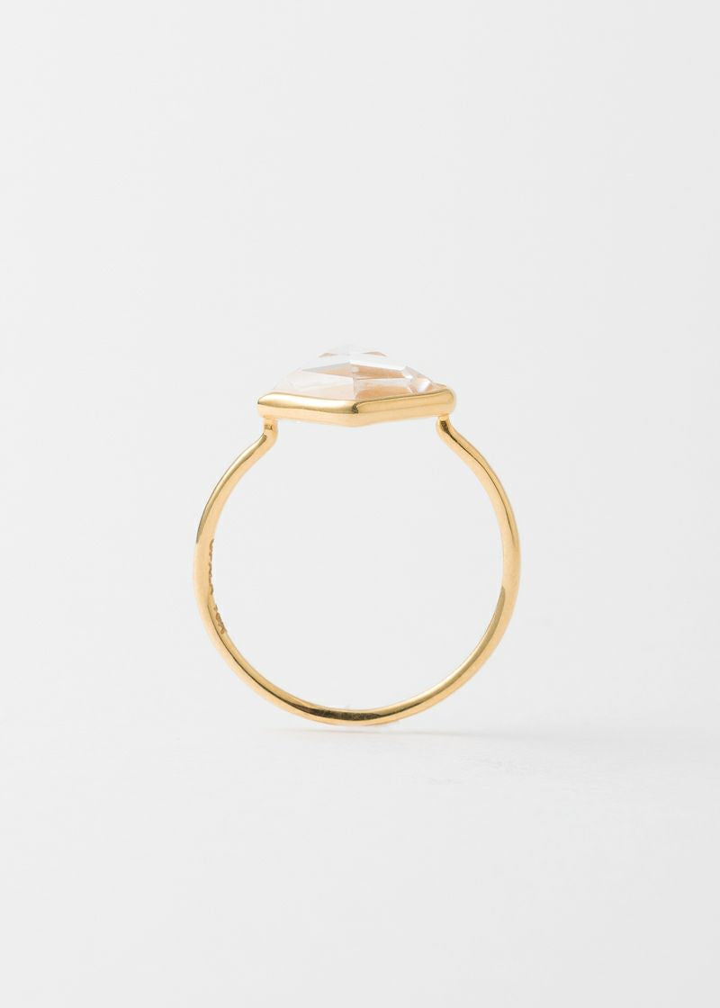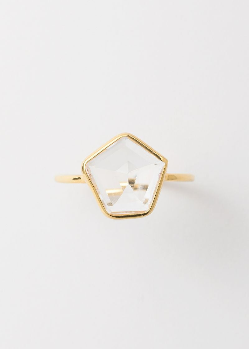 A pentagon motif ring made of clear quartz, which radiates clear charm. Highly skilled Indian craftsmen hand-cut each stone to bring out its individuality. The nuanced organic form is feminine but not too sweet, and exudes a modern atmosphere. The simple design makes the most of the beauty of the colored stones, and goes well with layering with other rings. *Since natural stones are used, there are individual differences in color, texture, and shape. There may also be inclusions or small scratches. Please note.