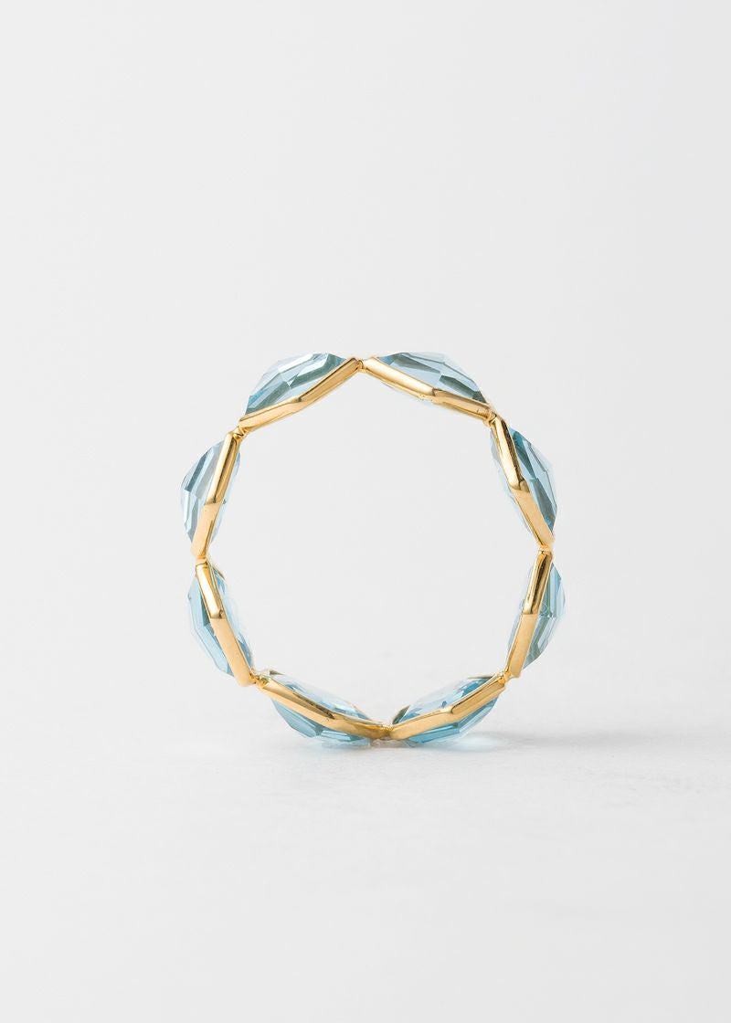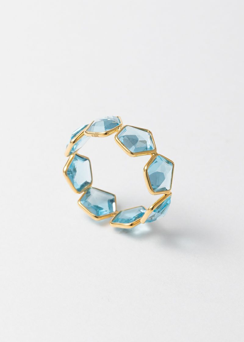 An eternity ring with a light pentagon motif of blue topaz. Highly skilled Indian craftsmen hand-cut the stones one by one to bring out their individuality. Gold is delicately wrapped around the ring to highlight the fresh color and transparency. The design of the pentagons, which are all unique, is full of charm that you will want to love as your own amulet. This ring, which uses a luxurious amount of colored stones, is likely to allow you to feel the power of each stone more deeply by wearing it on your bare skin. Topaz is the birthstone for November. It symbolizes friendship, hope, and intelligence. It is said to encourage you to move forward courageously into the future and to smooth relationships with those around you. *Since natural stones are used, there are individual differences in color, texture, and shape. There may also be inclusions or small scratches. Please note.