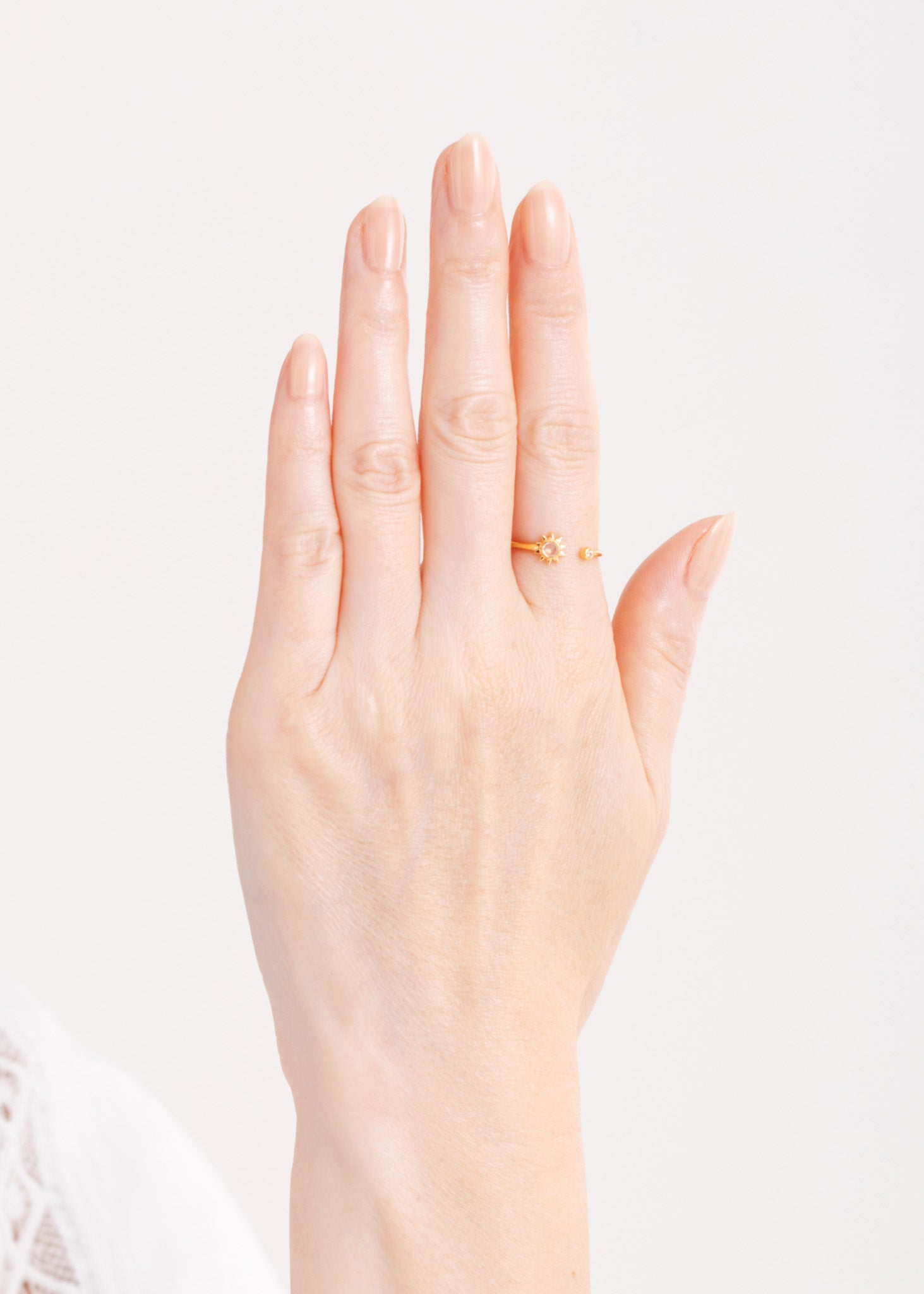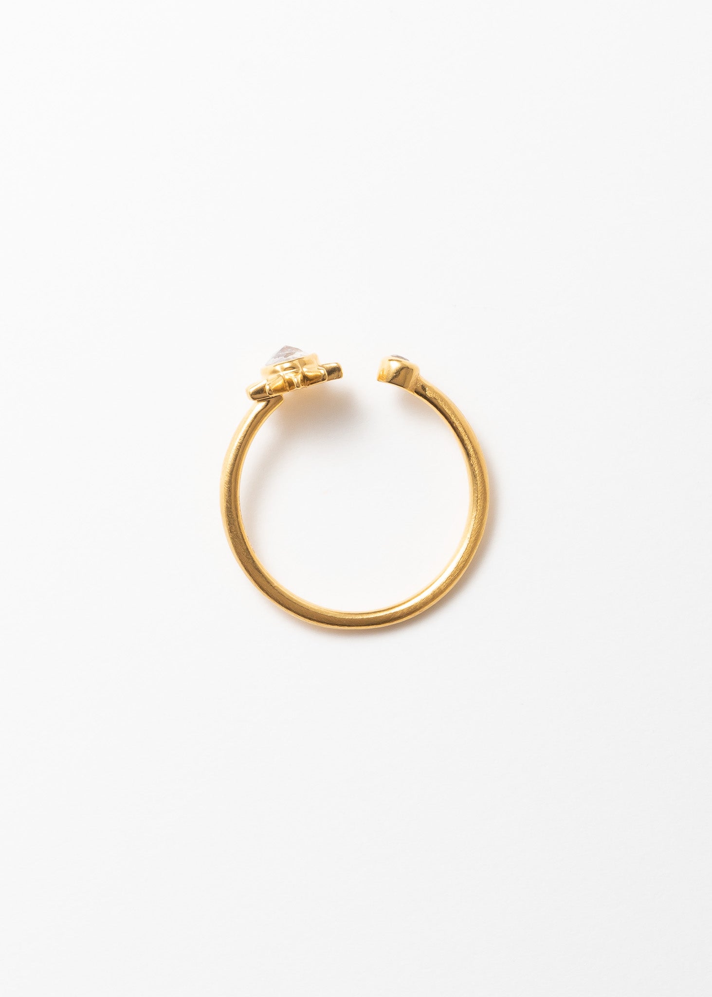 This open ring is set with a luxurious rose-cut rainbow moonstone and features a sun-motif charm, which represents success, protection, and harmony. It is paired with a subdued, sparkling white sapphire. The sun motif truly symbolizes the immense energy of the sun, and is said to give the wearer vitality and energy, ward off misfortune, bring courage and confidence, harmony and order, and have the power to attract people.