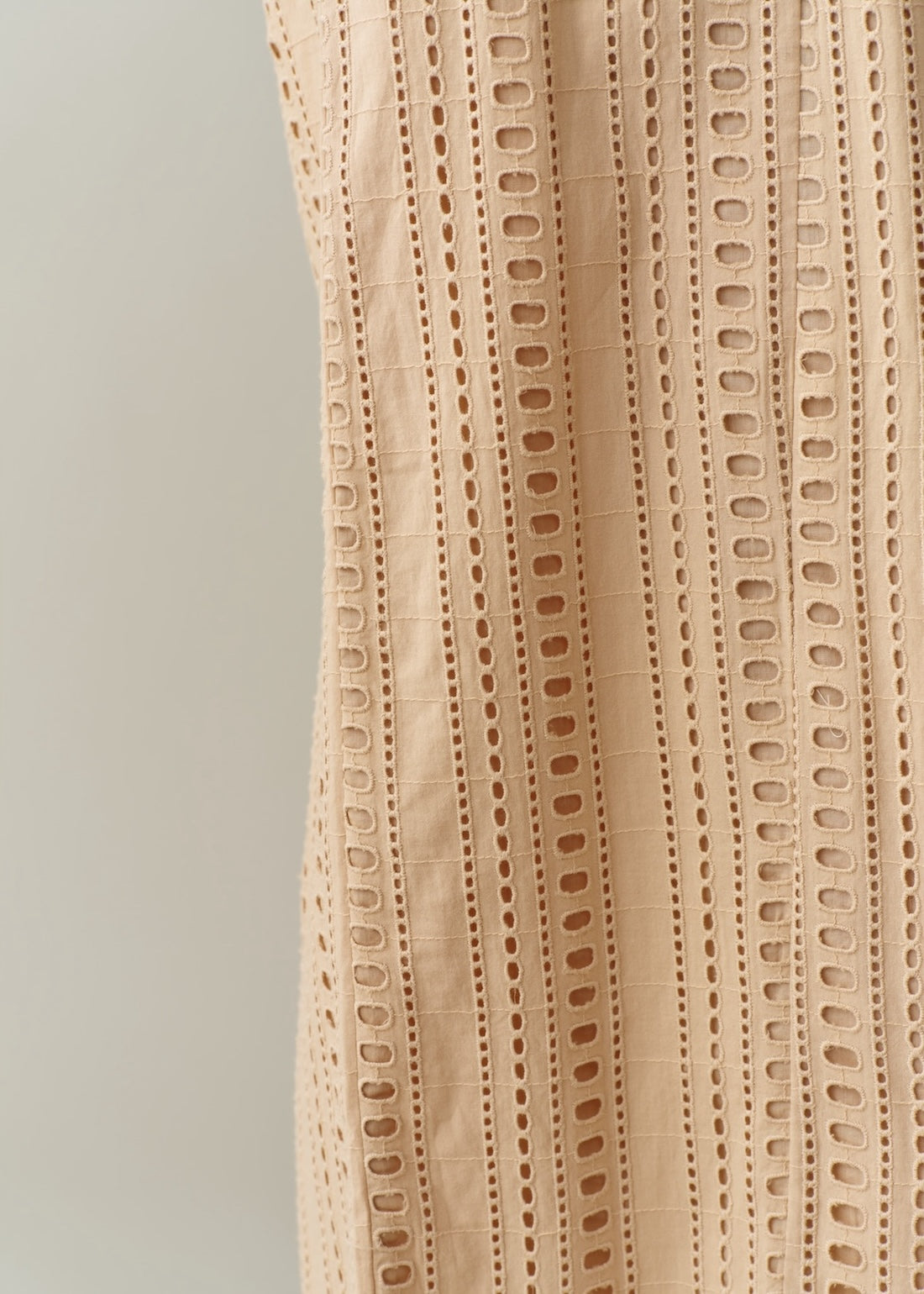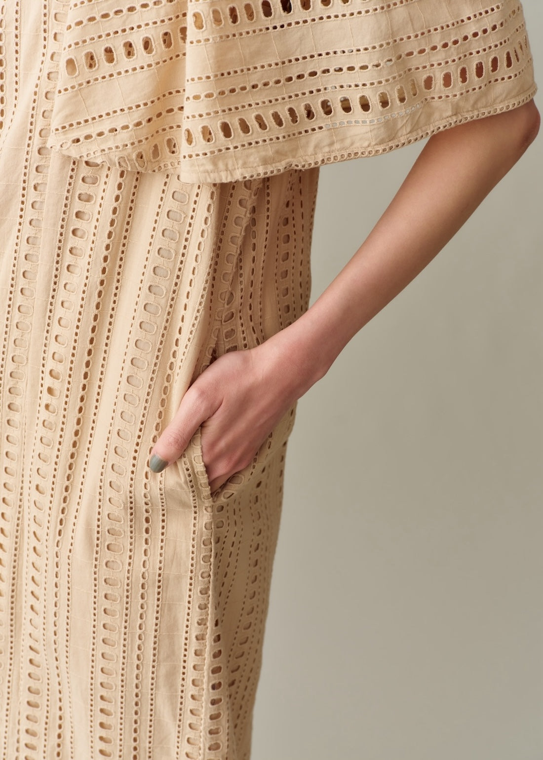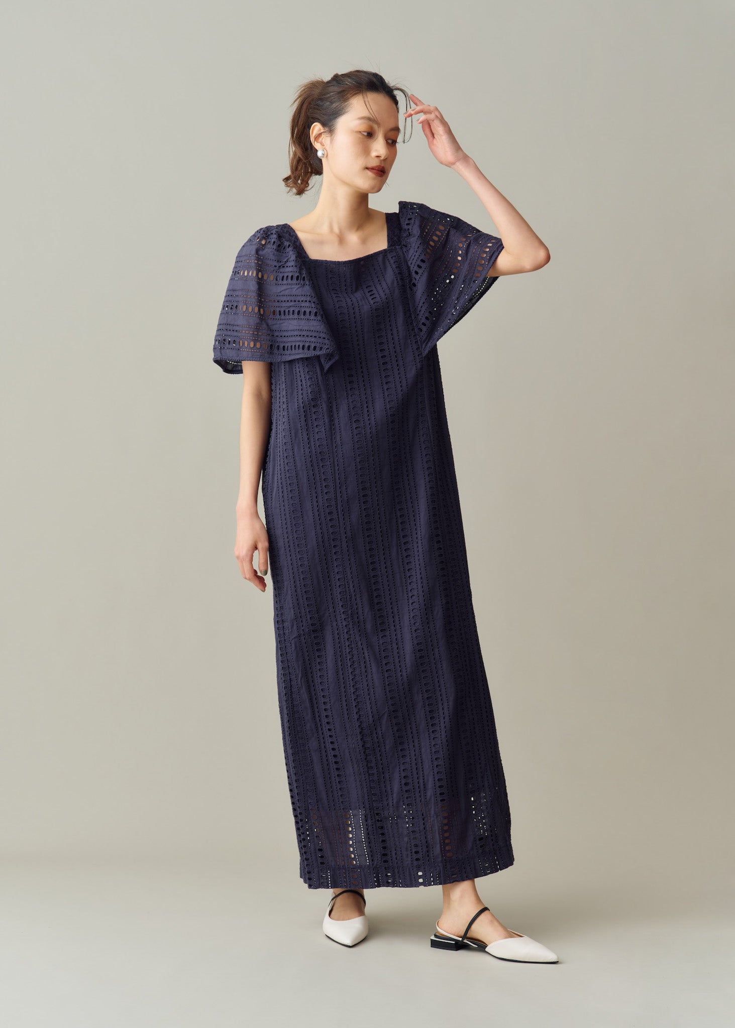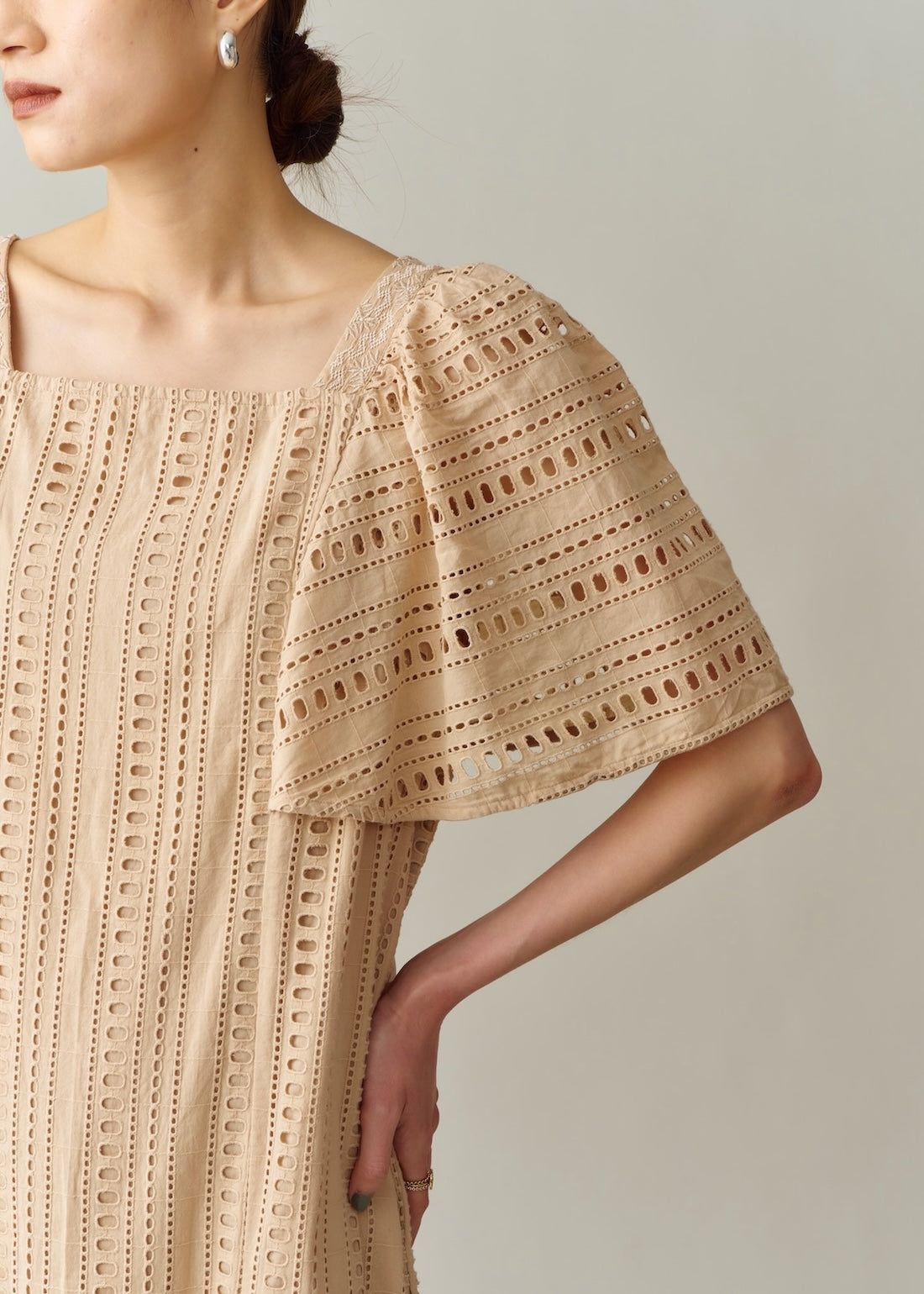 丸くあいた穴の連なるカットワークが印象的なフレアスリーブのドレスは、甘やかな香り。