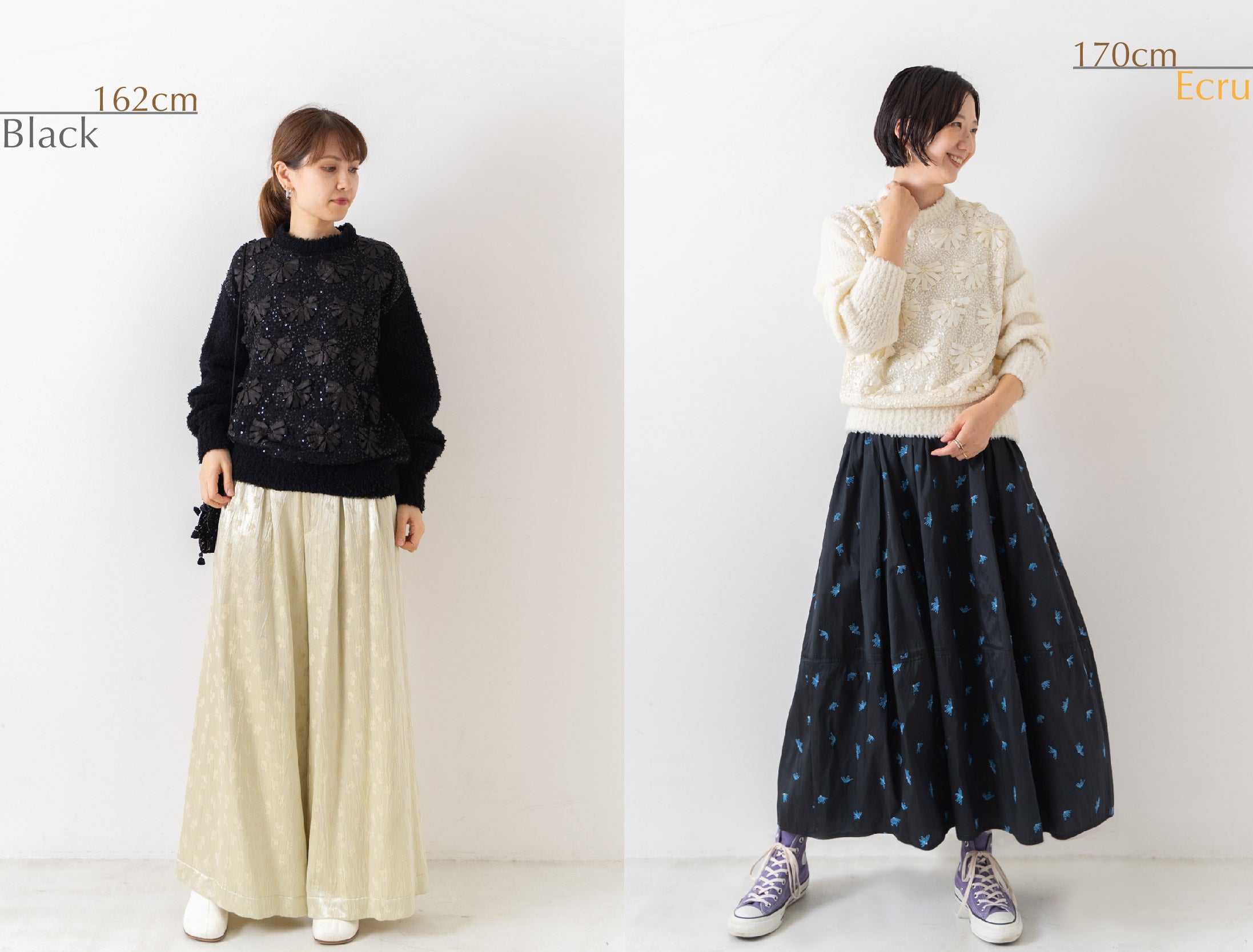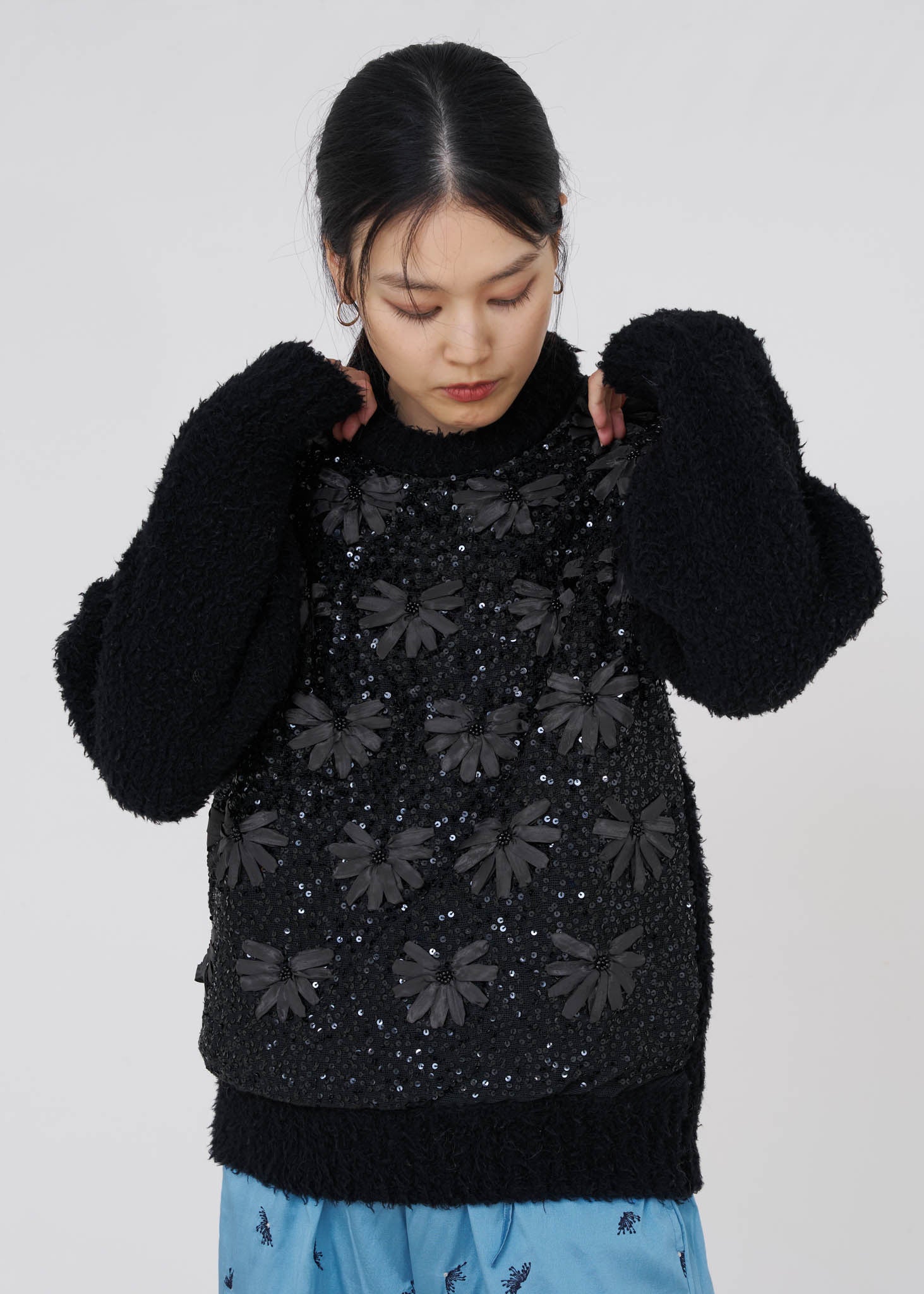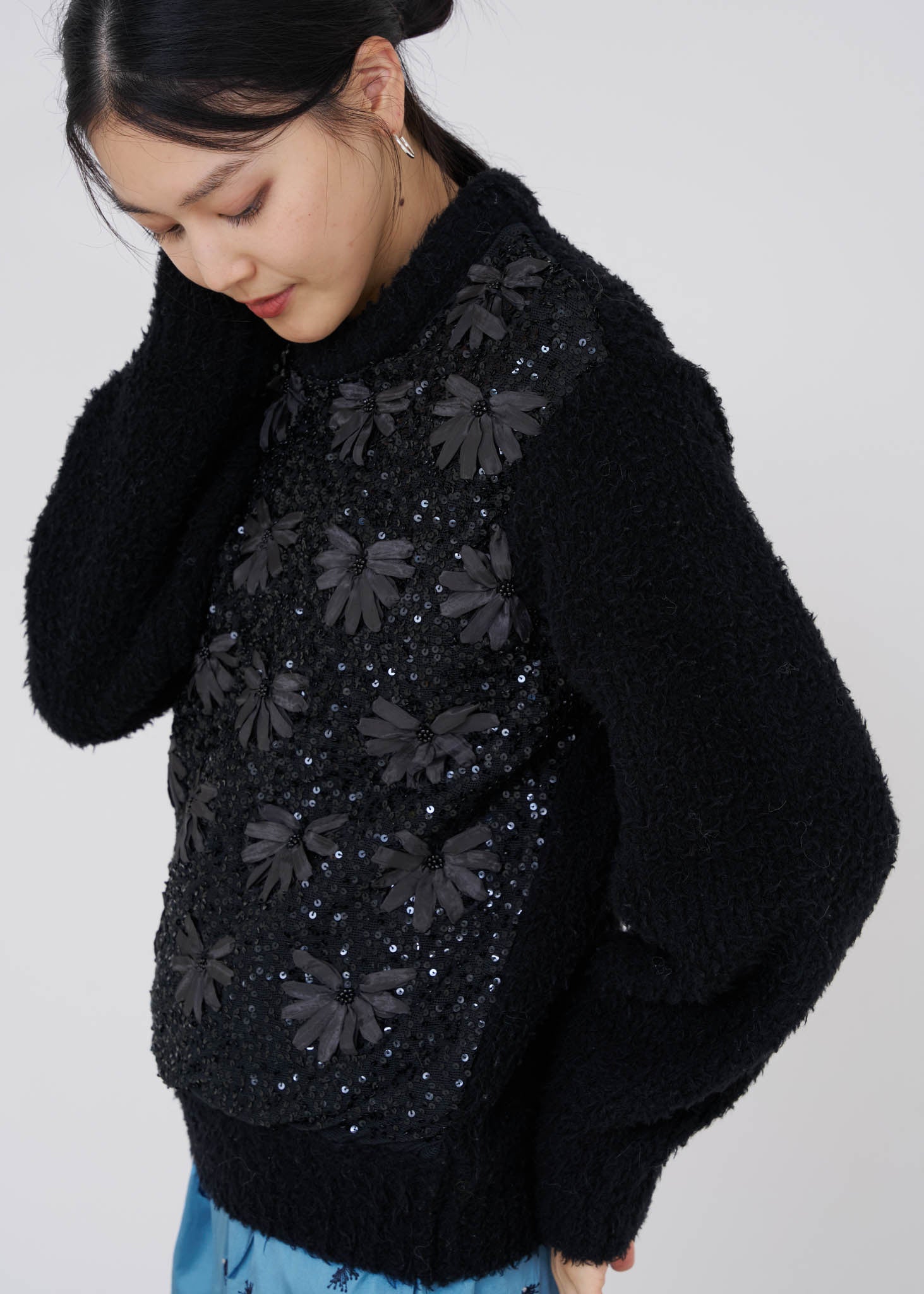 インドならではのリボンの手刺繍やスパンコール刺繍を施した贅沢なボディパーツと組み合わせた、新しい試みのアイテムです。ne Quittez pasのスカートやパンツに合わせて、冬のヌキテパスタイルをお楽しみください。
