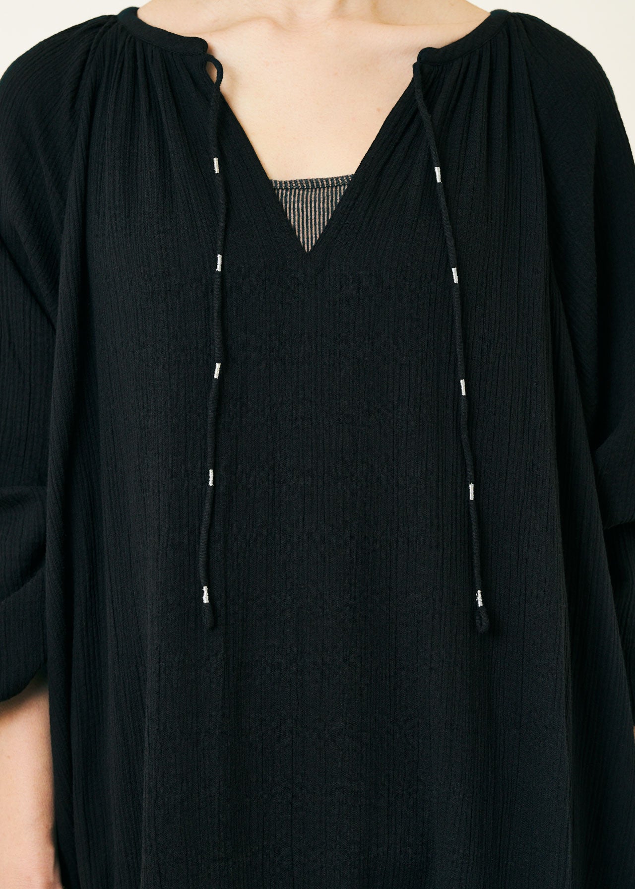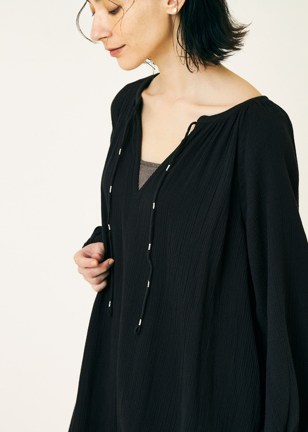 コットン100%のダブルガーゼの生地をたっぷり使ったロングドレスは、柔らかな風合いとニュアンスのあるシボ感が特徴です。