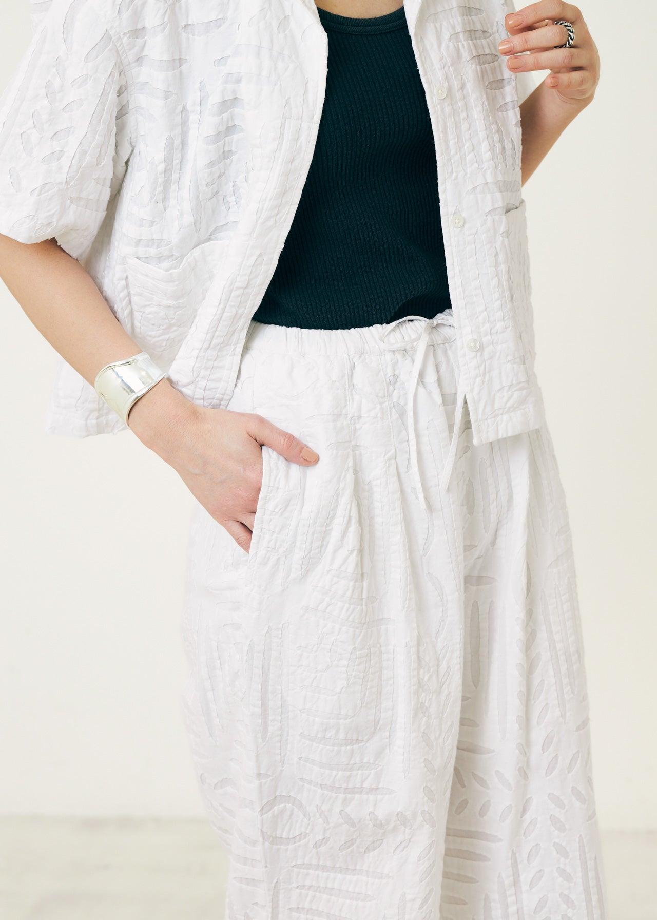 コットンを二重に重ね、アップリケを施した上品な印象のパンツ。