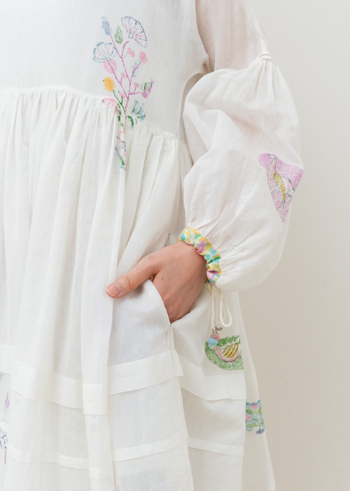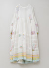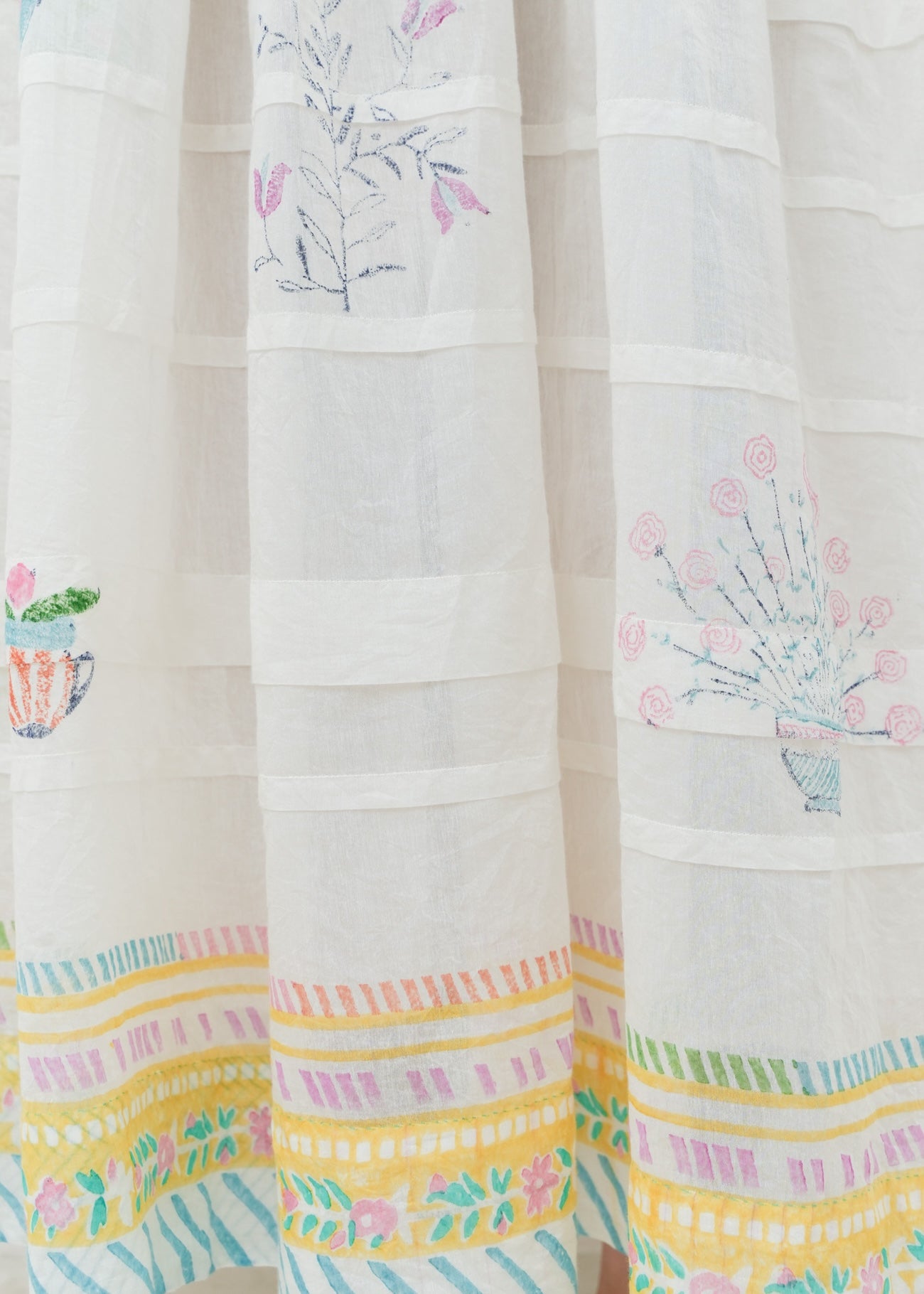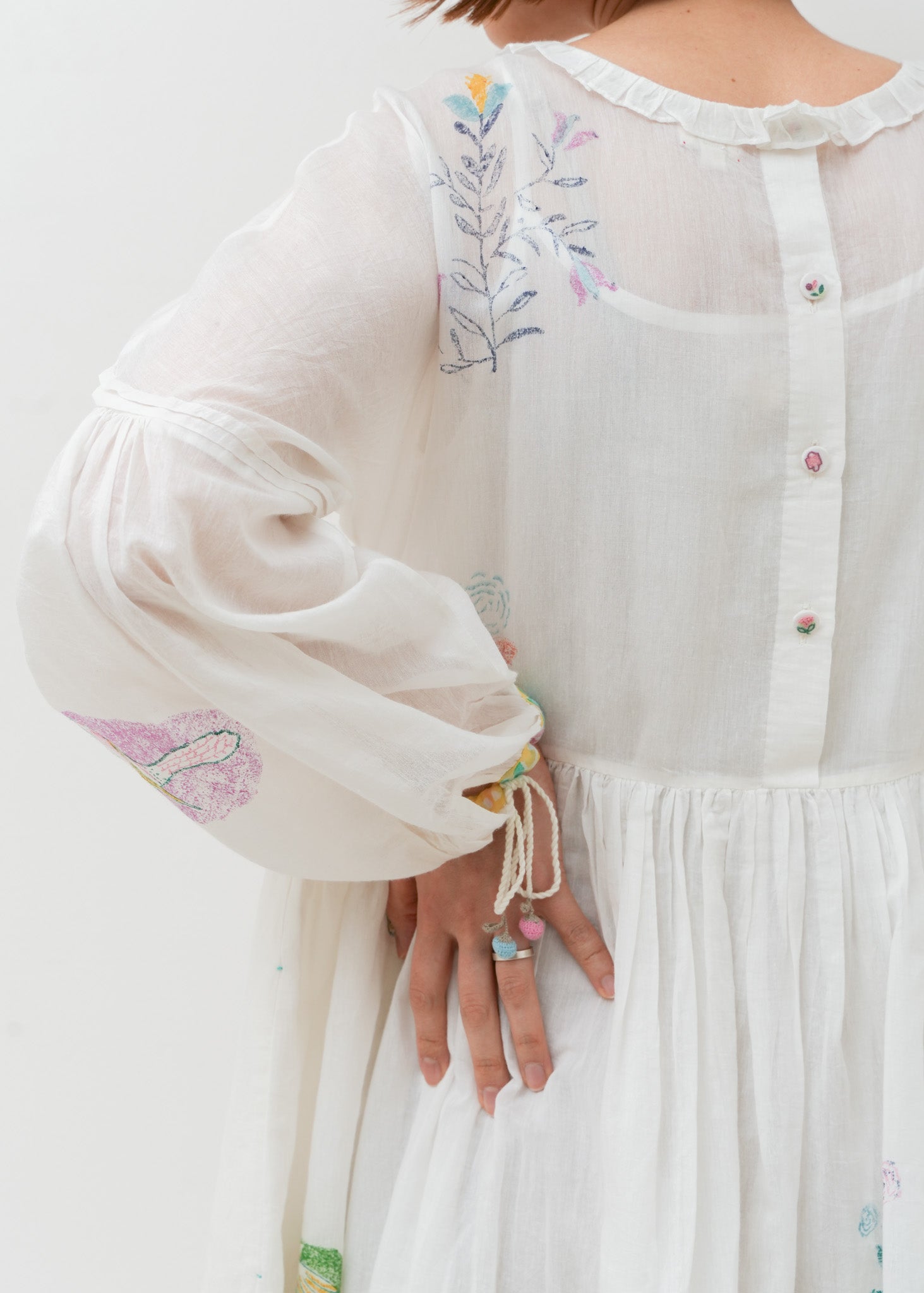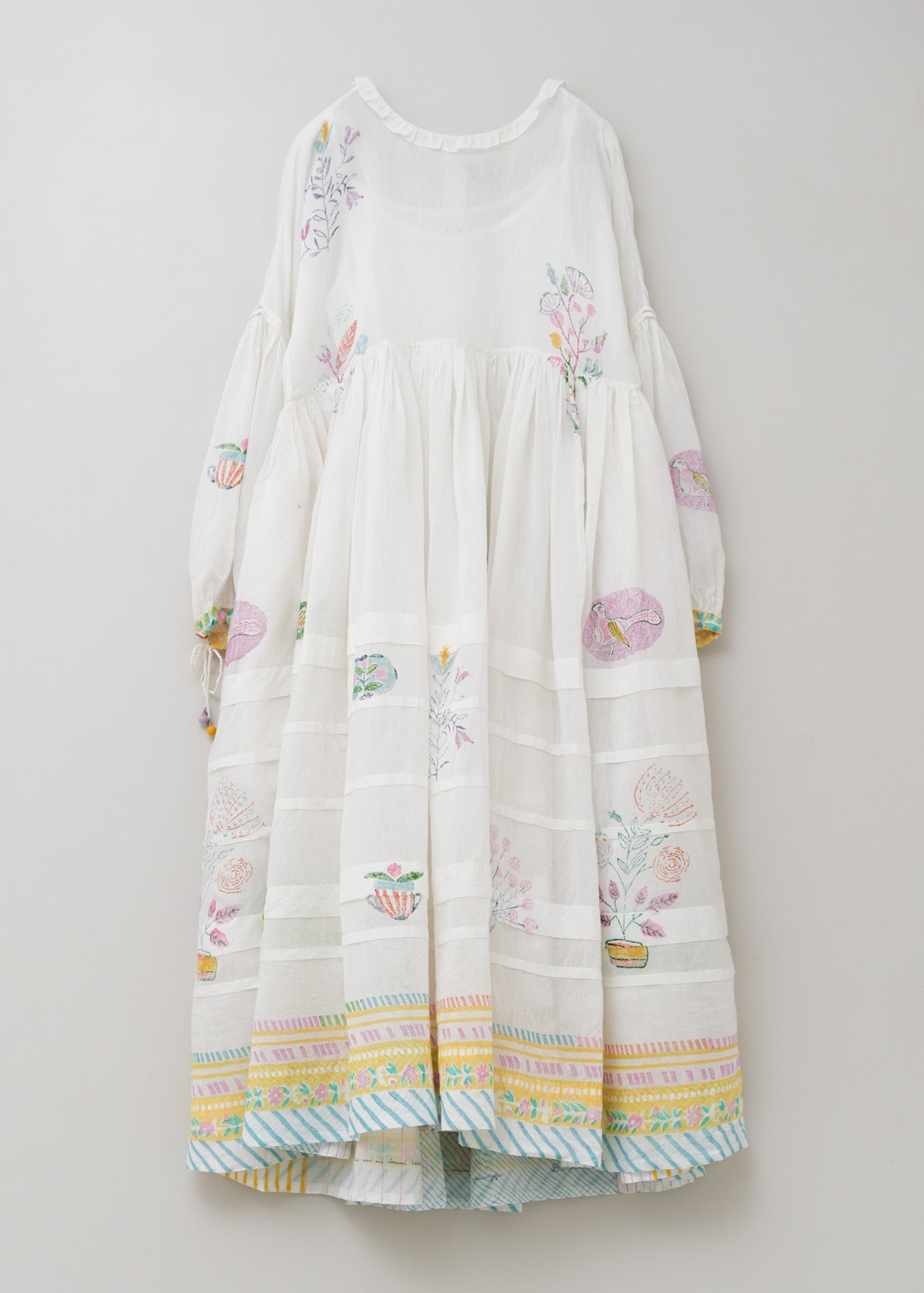 コットンシルクの混紡生地には、ハンドブロックプリントによるユニークなコラージュが広がり、その上には色とりどりの花の刺繍が散りばめられ、力強くも繊細な表情を生み出しています。