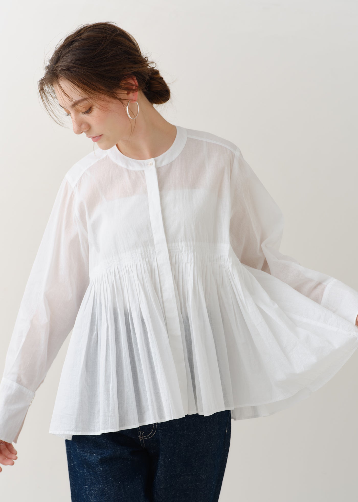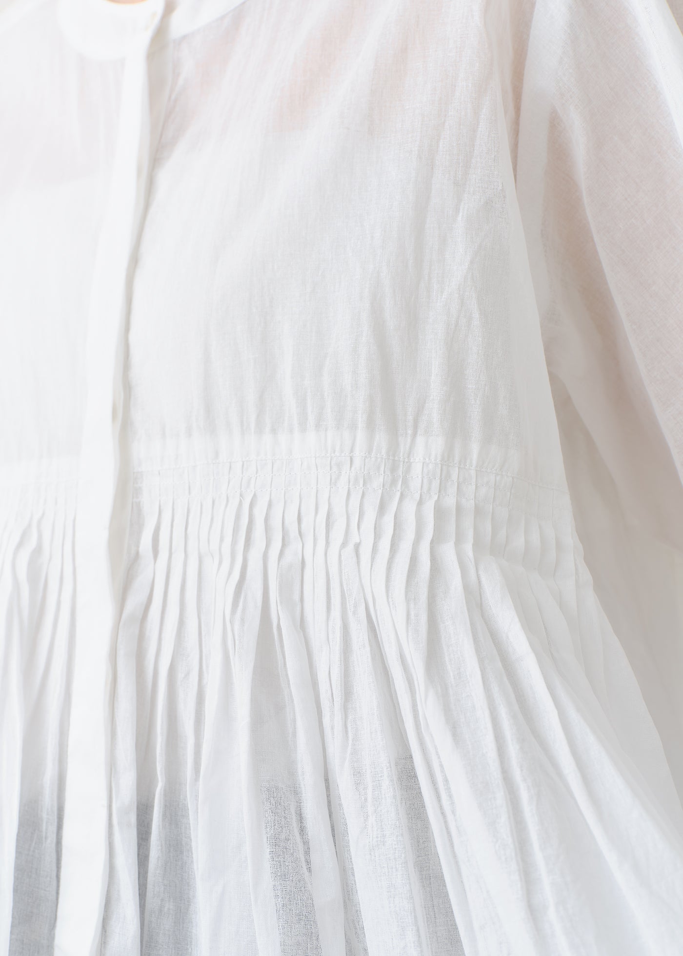 ごく薄手のコットンオーガンジーに、丁寧なピンタックで美しい陰影をつけたブラウス。