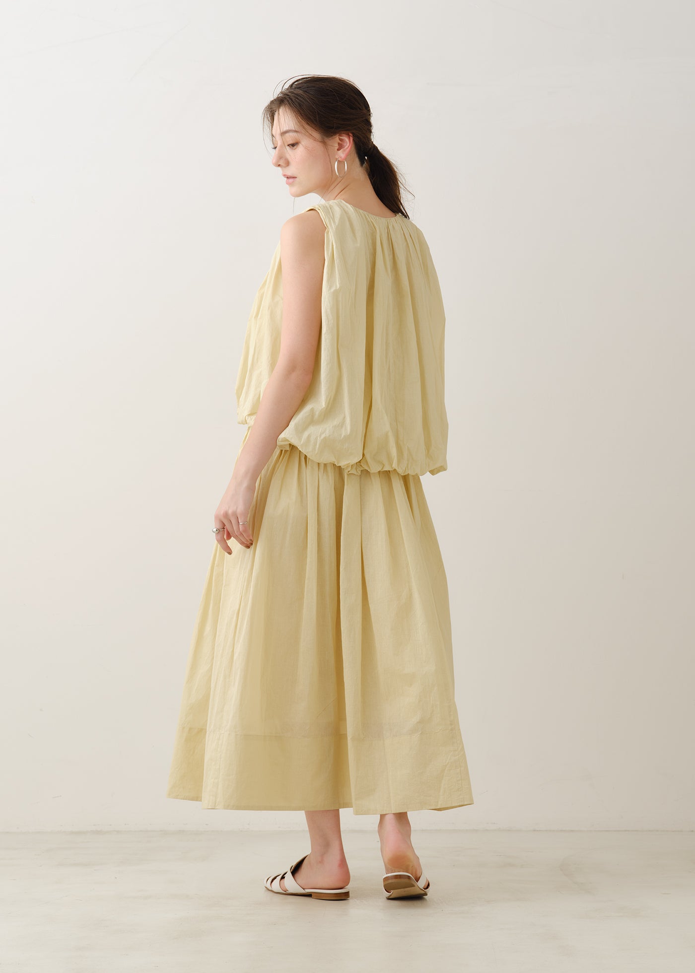 そこから広がるスカートは、薄手のコットンオーガンジーならではの透け感と柔らかさ。
