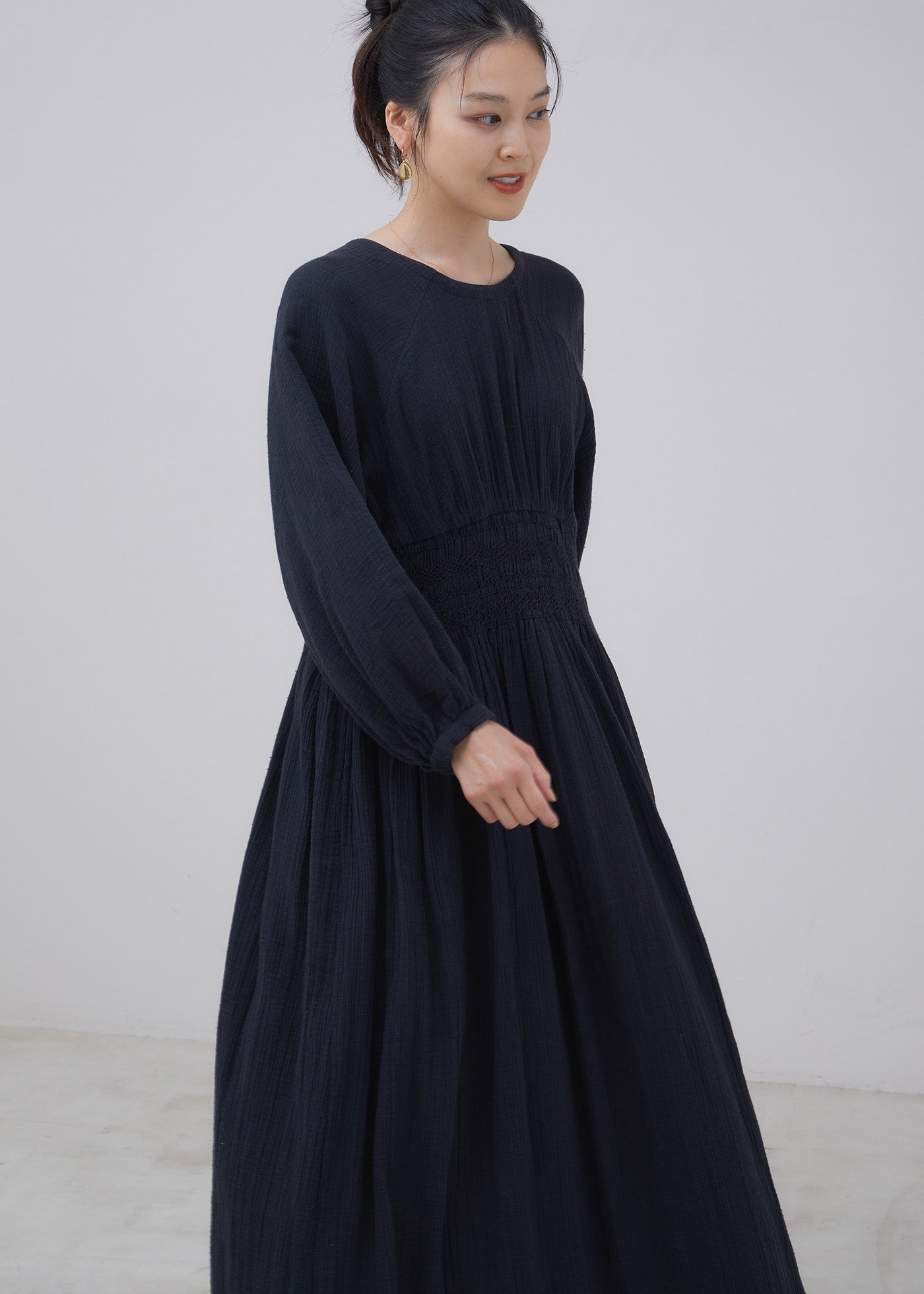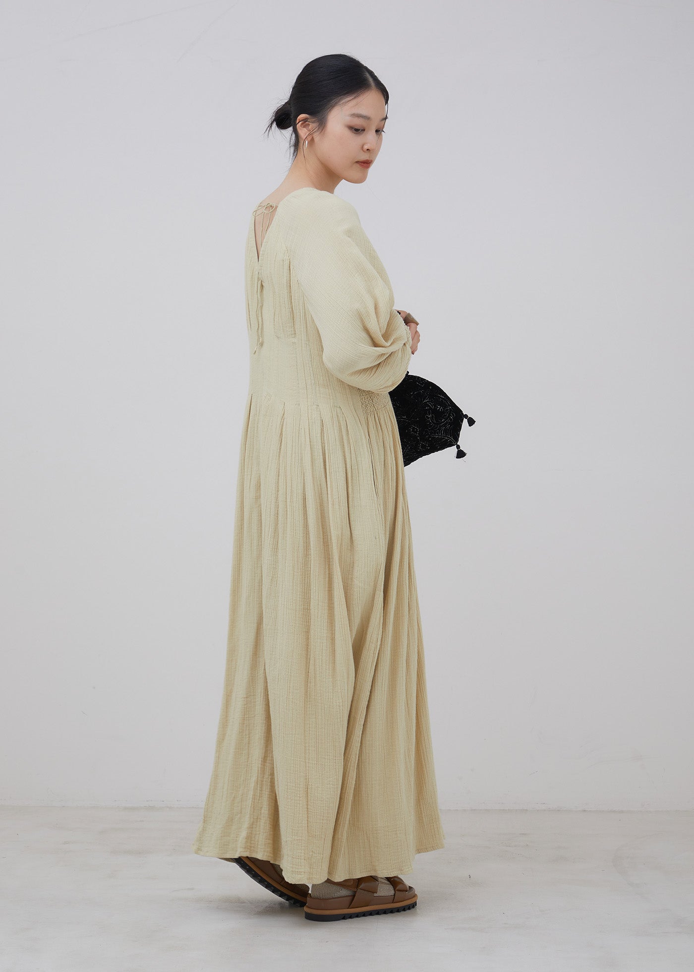 丁寧に寄せたギャザーが、静かにすとんと落ちるダブルガーゼ。