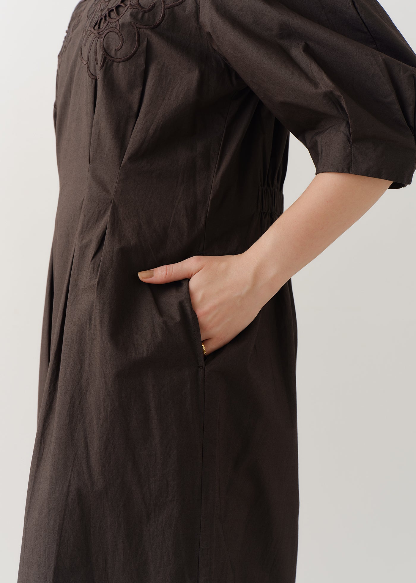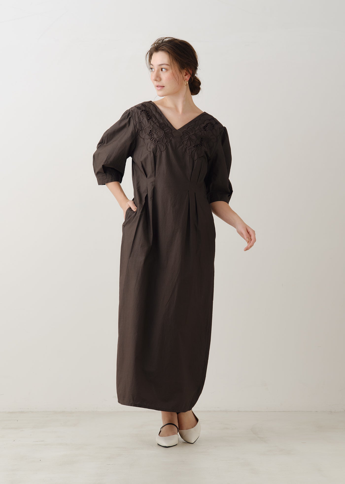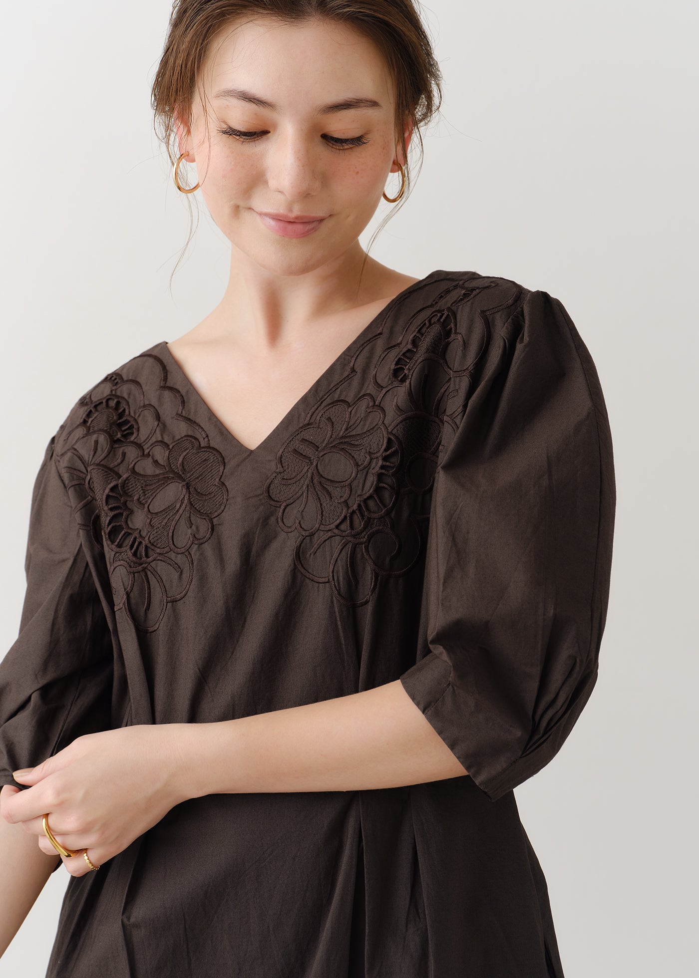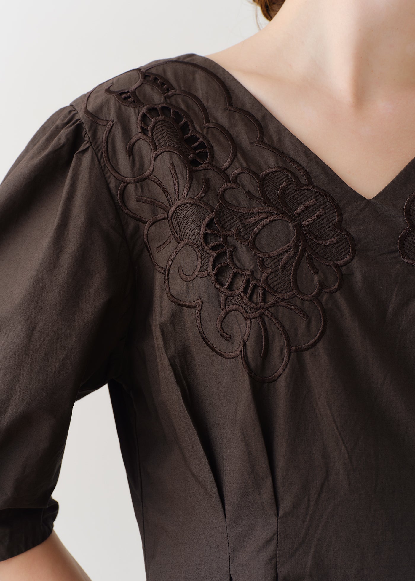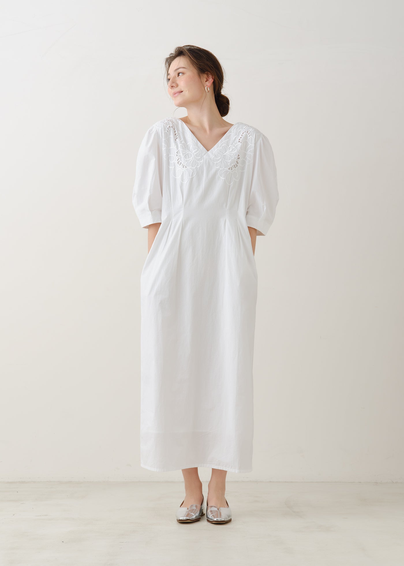 胸元から肩にかけて、カメリアのように大胆なフラワーモチーフのカットワーク刺繍。