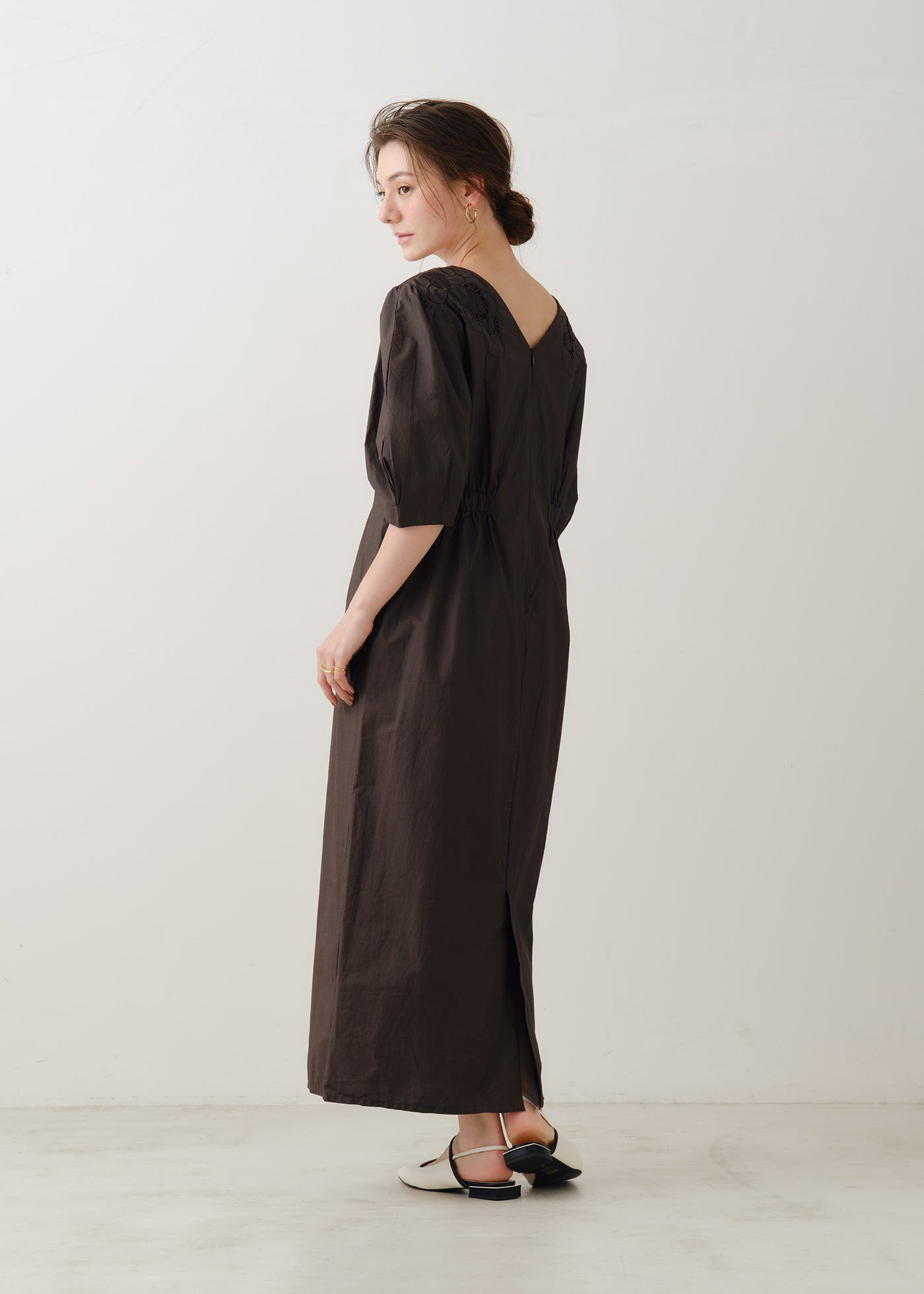 ウエスト周りや袖にタックとギャザーを入れてシルエットに立体感を出しています。
