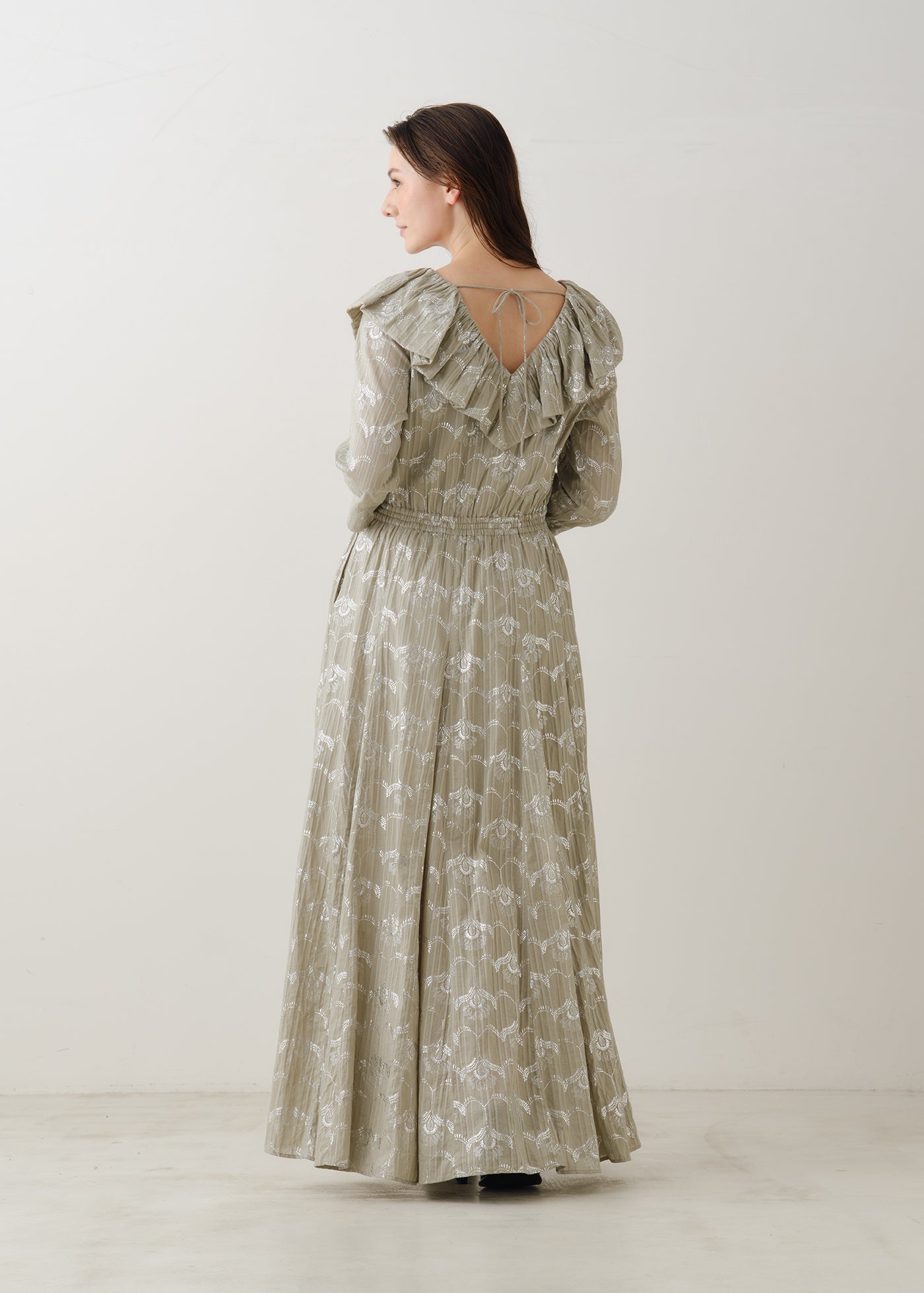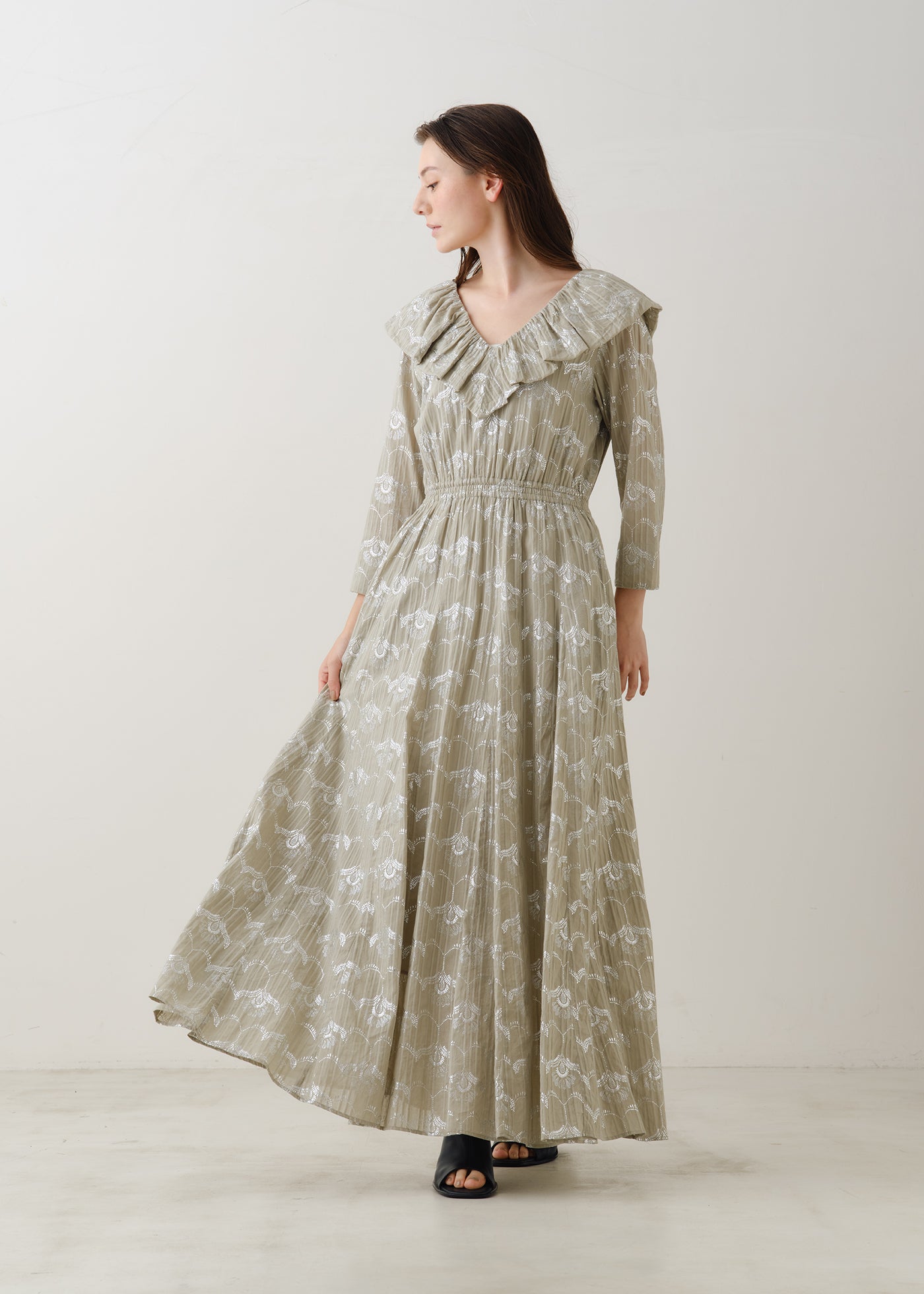 Cotton Dobby Wave Flower Foil Print Frill Collar Dress