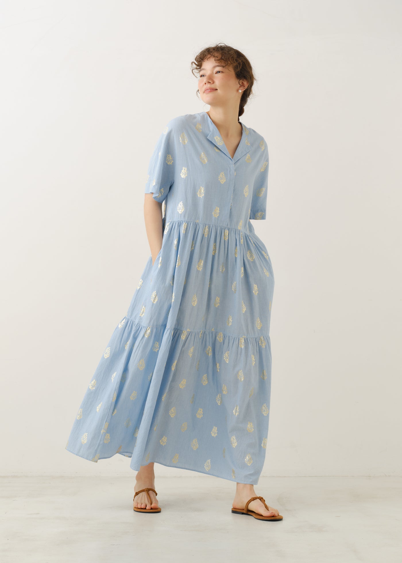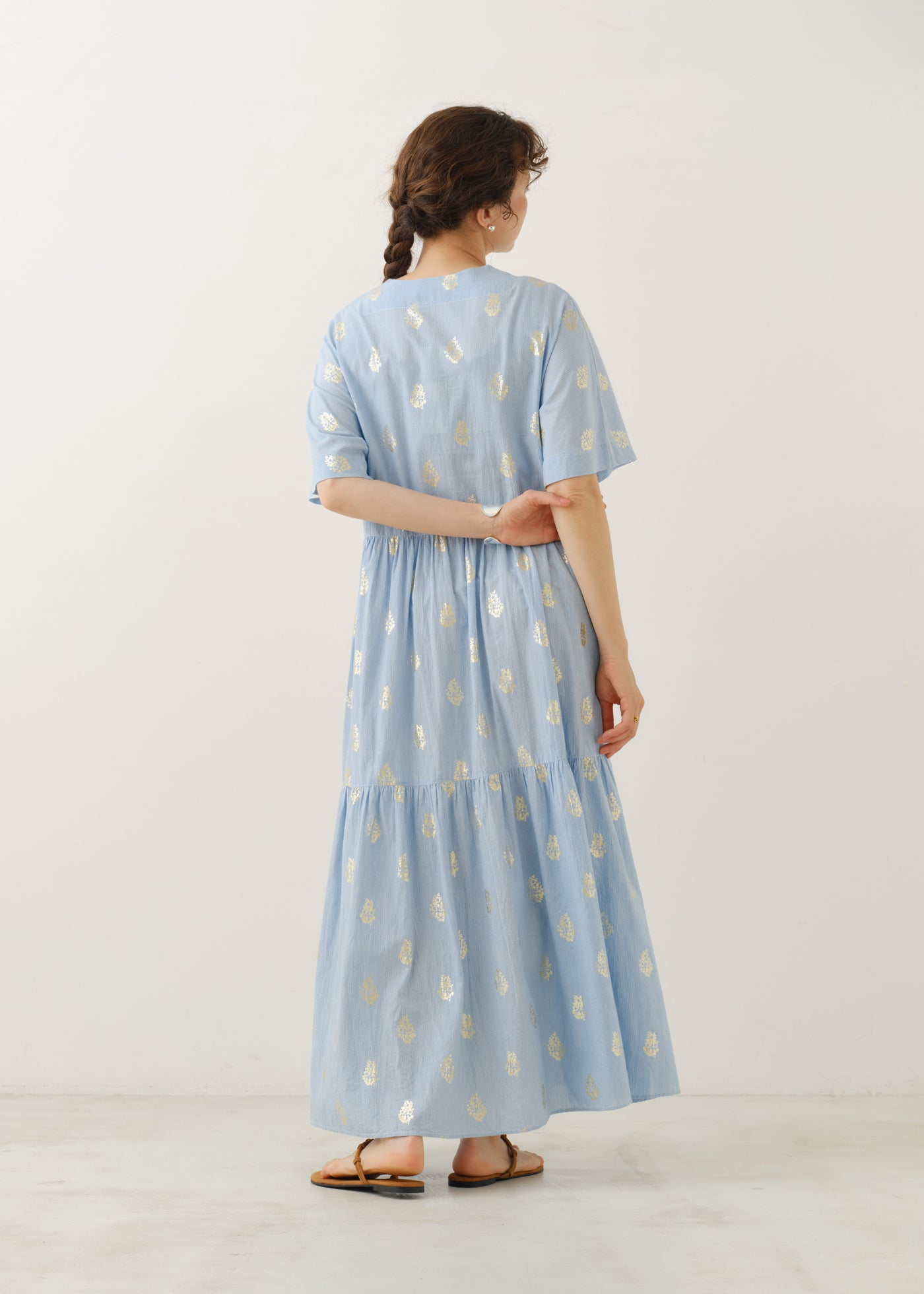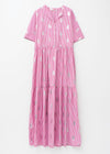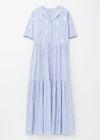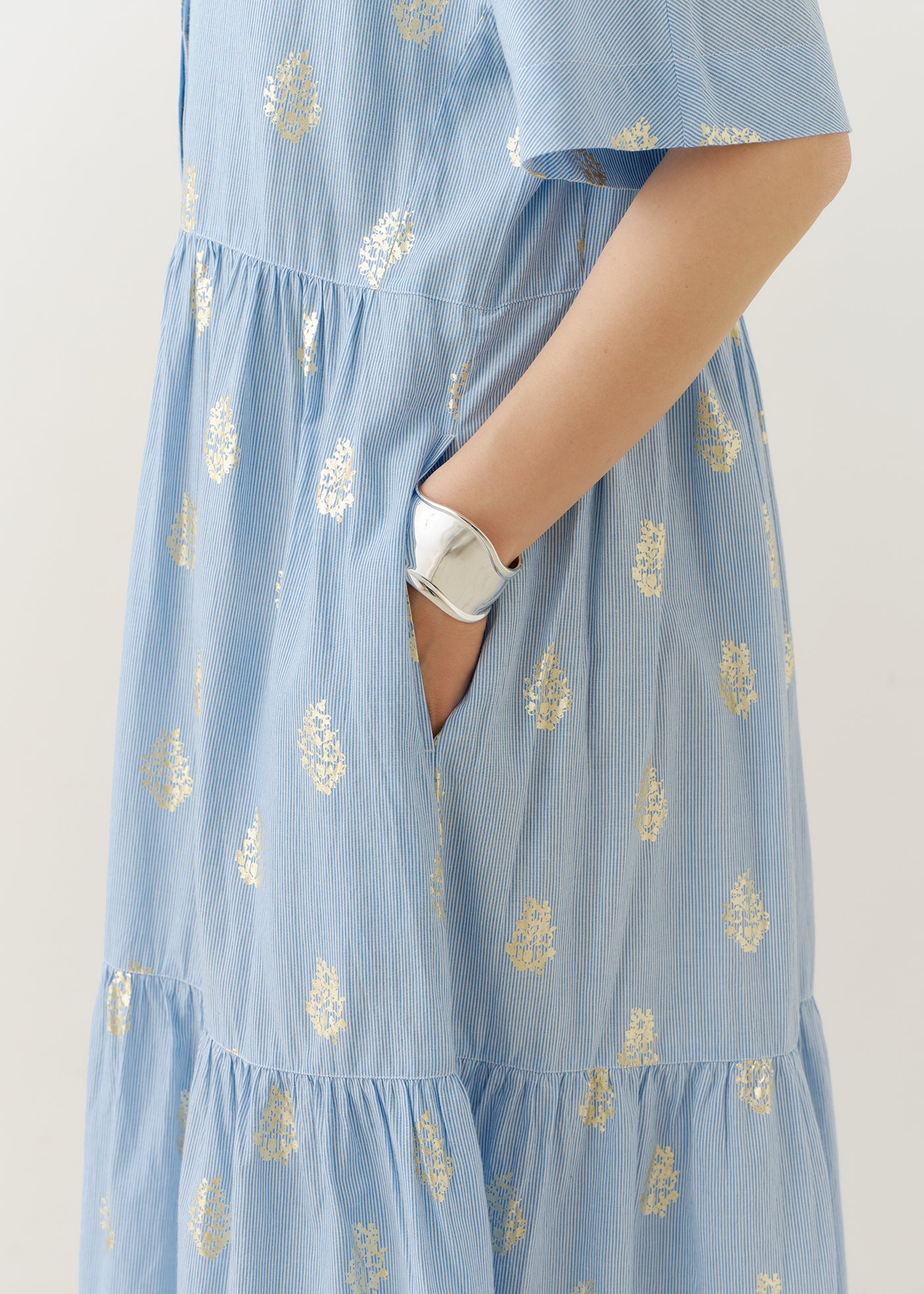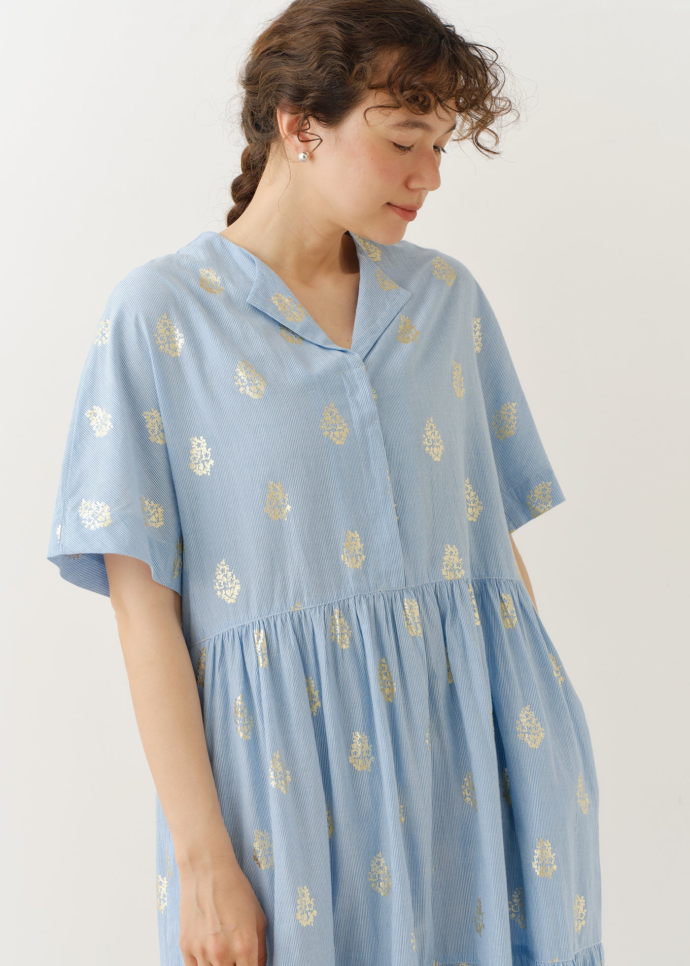 Cotton Poplin Stripe Foil Print Half Sleeve Tiered Dress