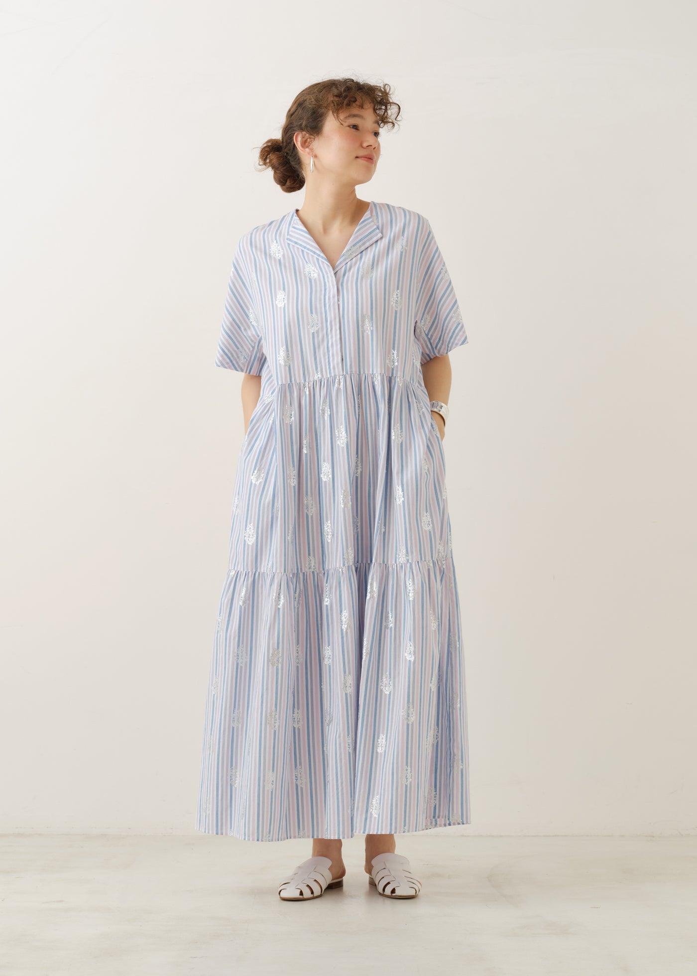 品質表示 Cotton Poplin Stripe Foil Print Half Sleeve Tiered Dress