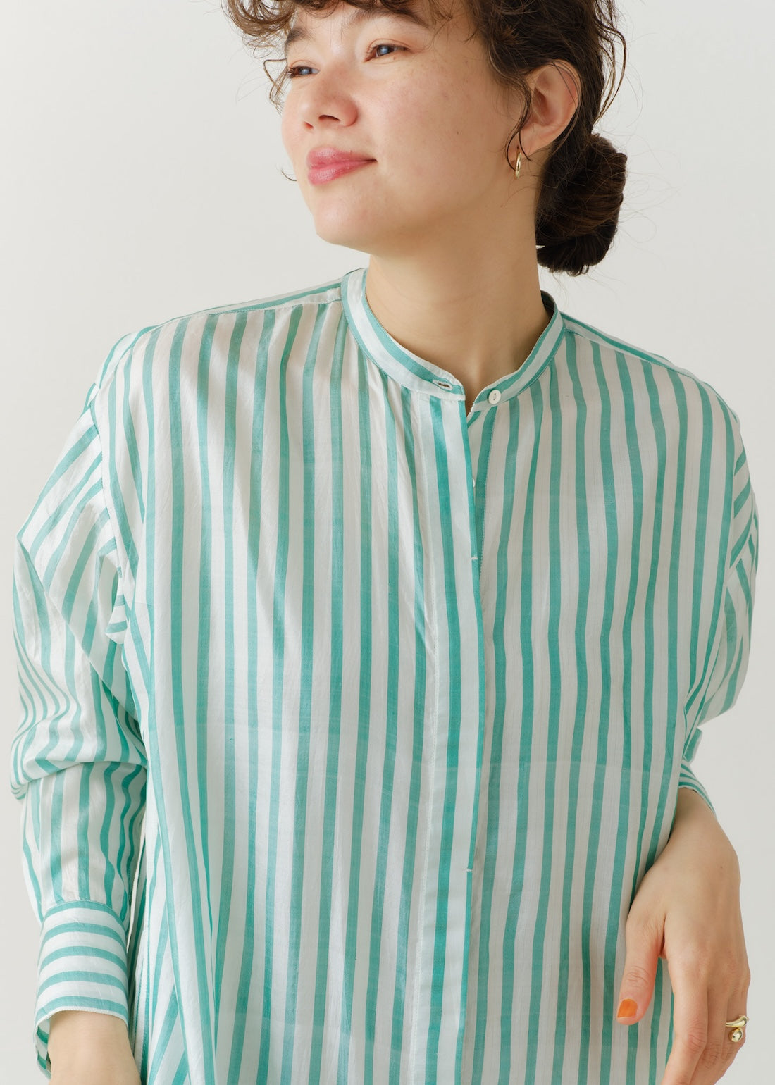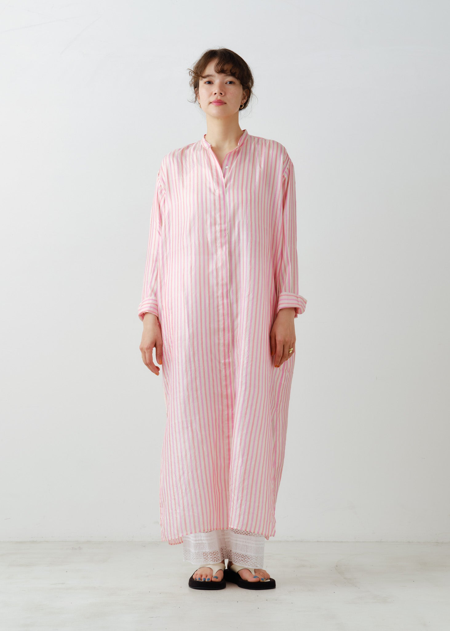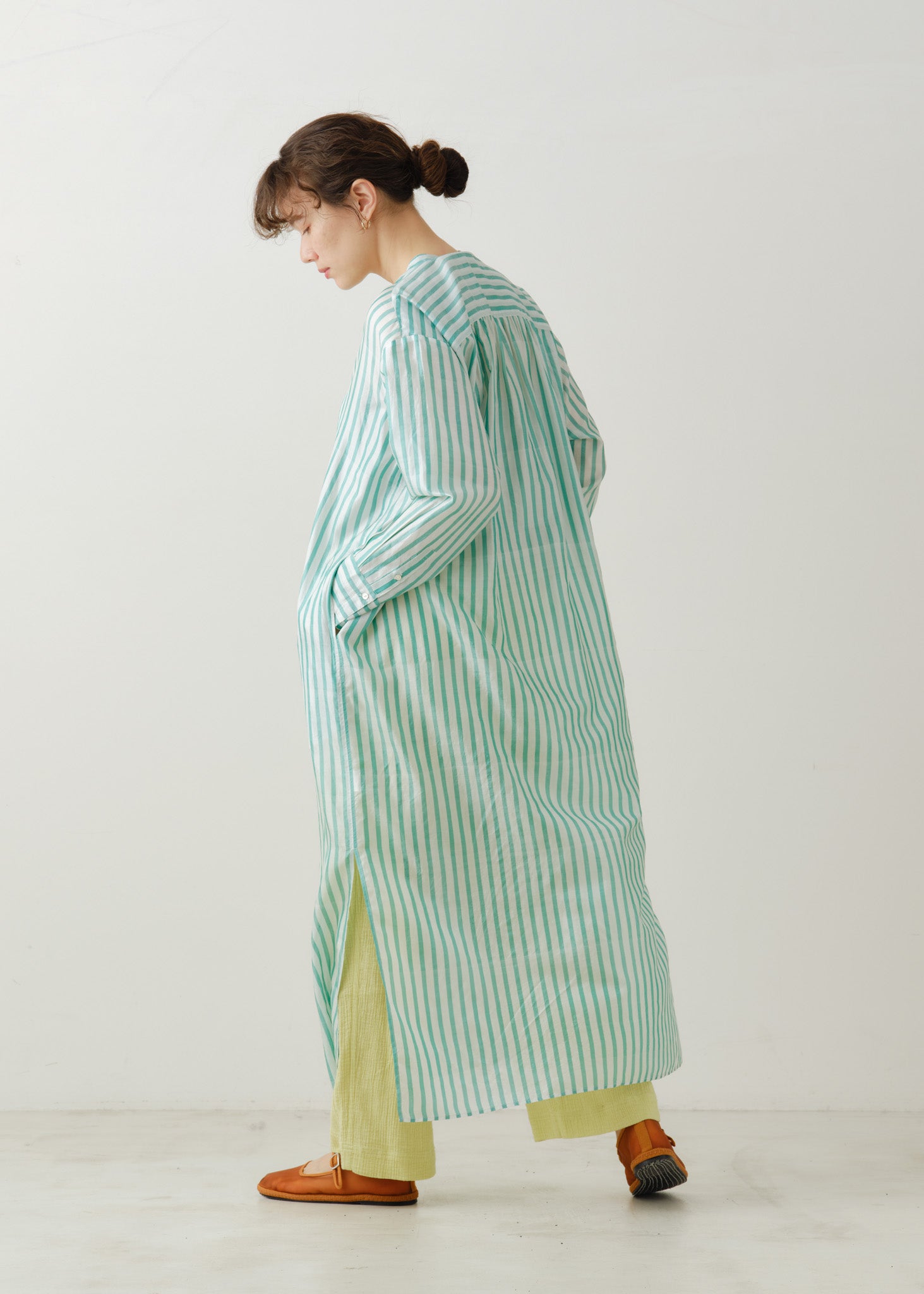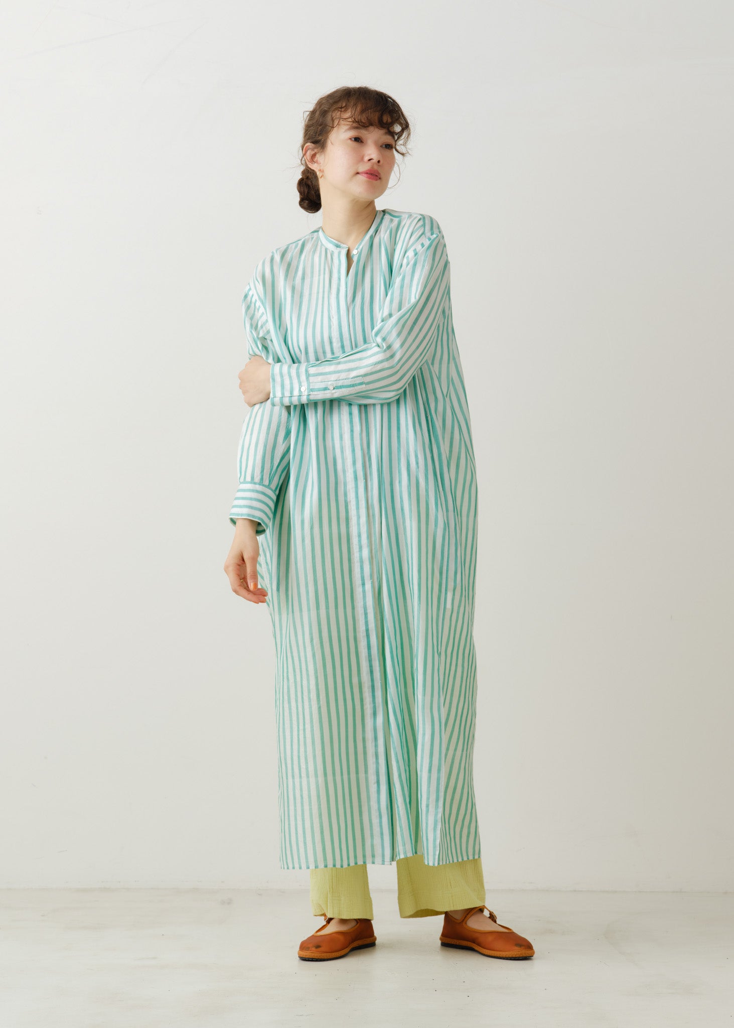 〈ne Quittez pas〉定番のクルタを前開き仕様に変更し、羽織としても着用できるように。