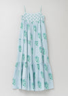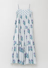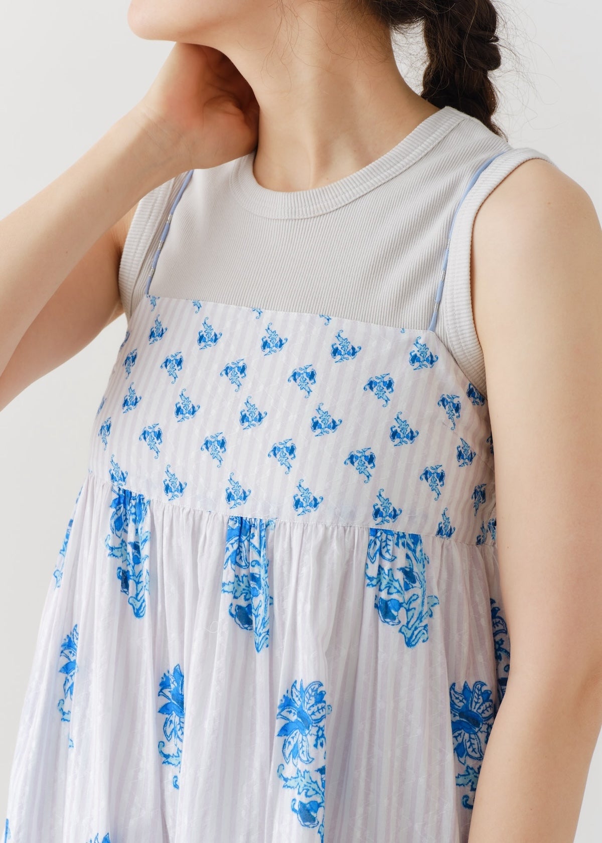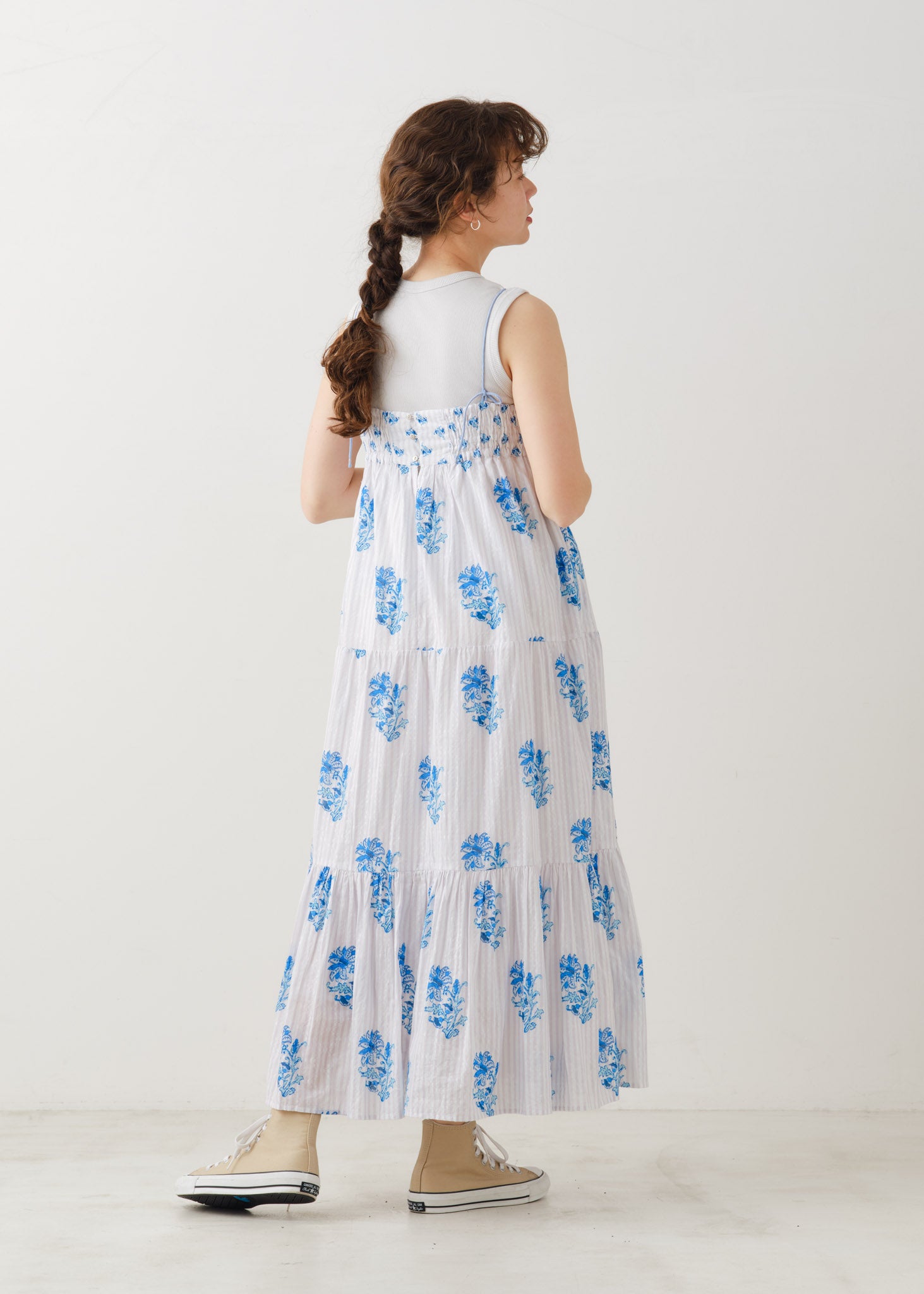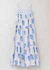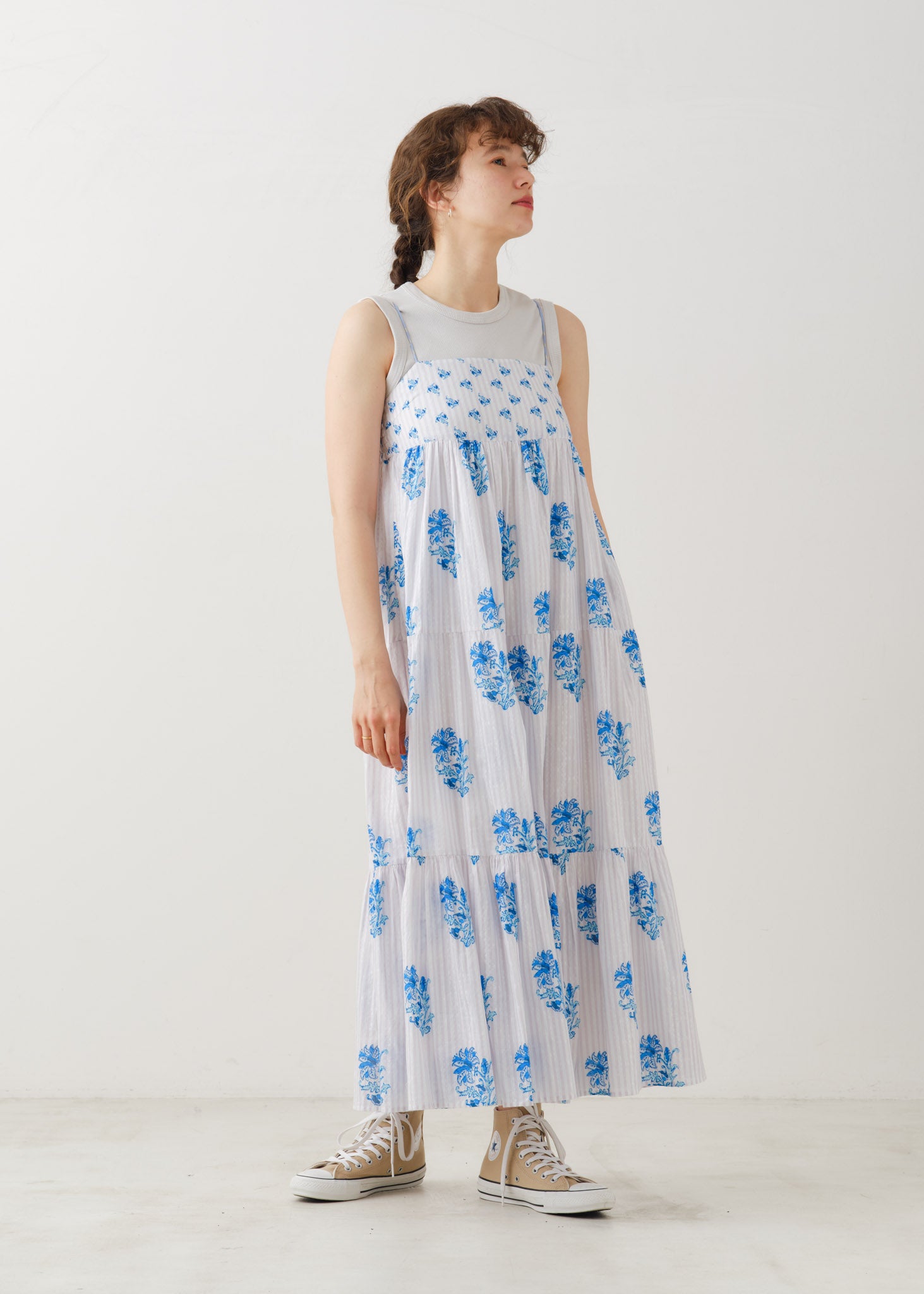 エキゾチックで大胆な百合のプリントを大小散りばめたキャミソール型のティアードドレス。