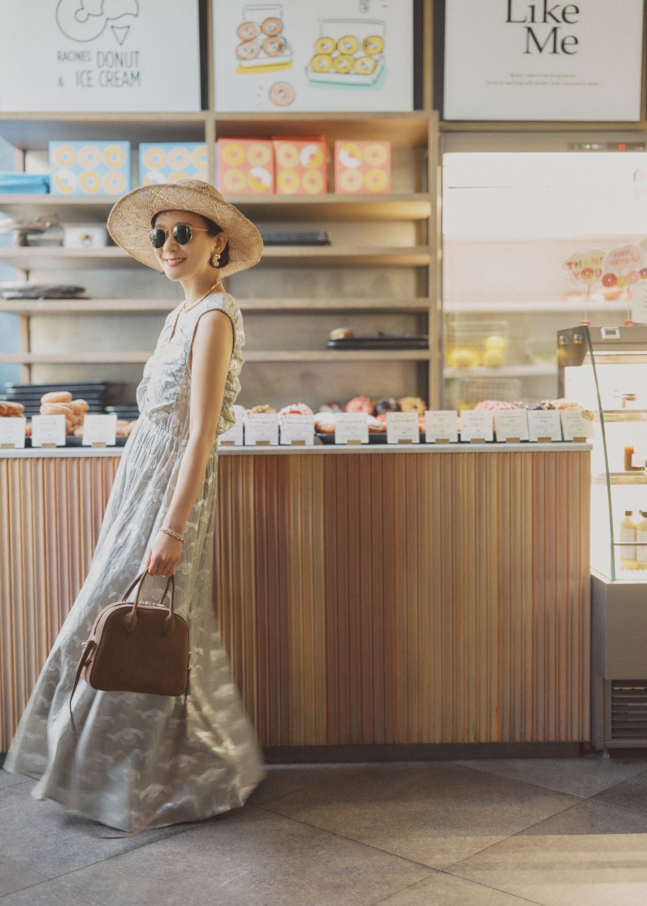 コンパクトなトップからひと足ごとに広がるスカートへ、流れるようなシルエットです。
