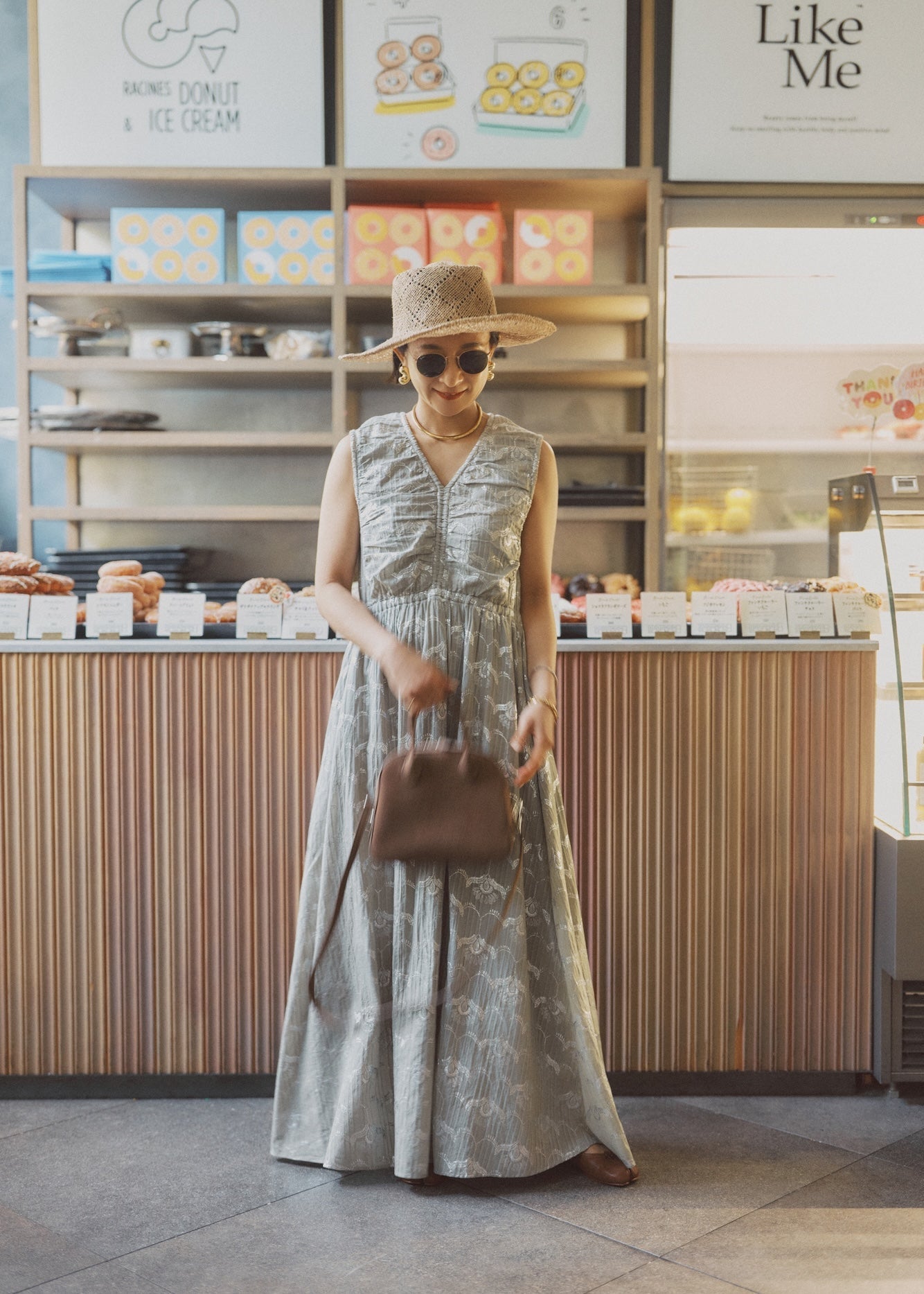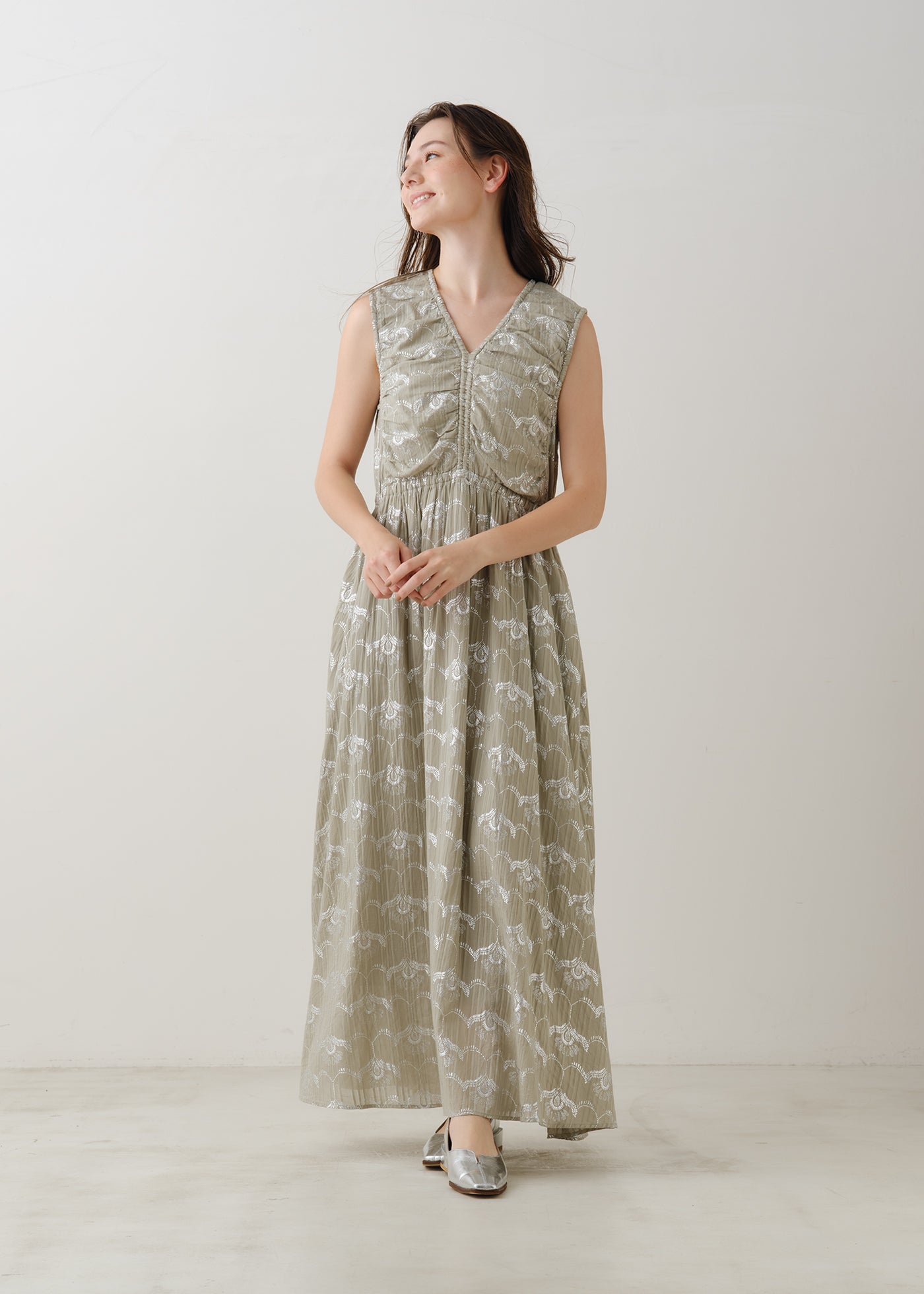 フラワーモチーフのフォイルプリントが、キラキラ波のように揺れる爽やかなドレス。