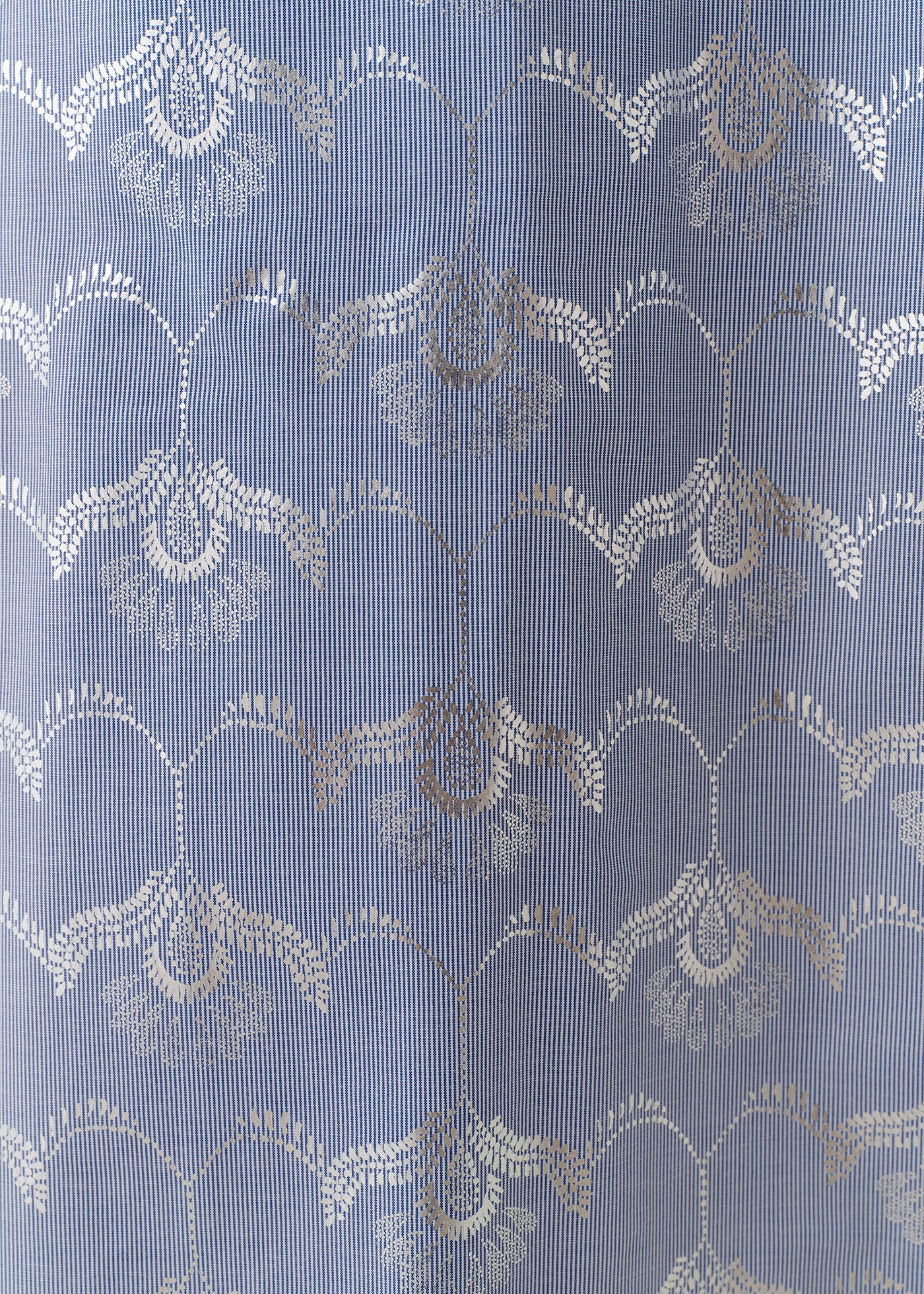 衿ぐりと袖口には、ギャザーを寄せたコードで縁取りをパイピング。