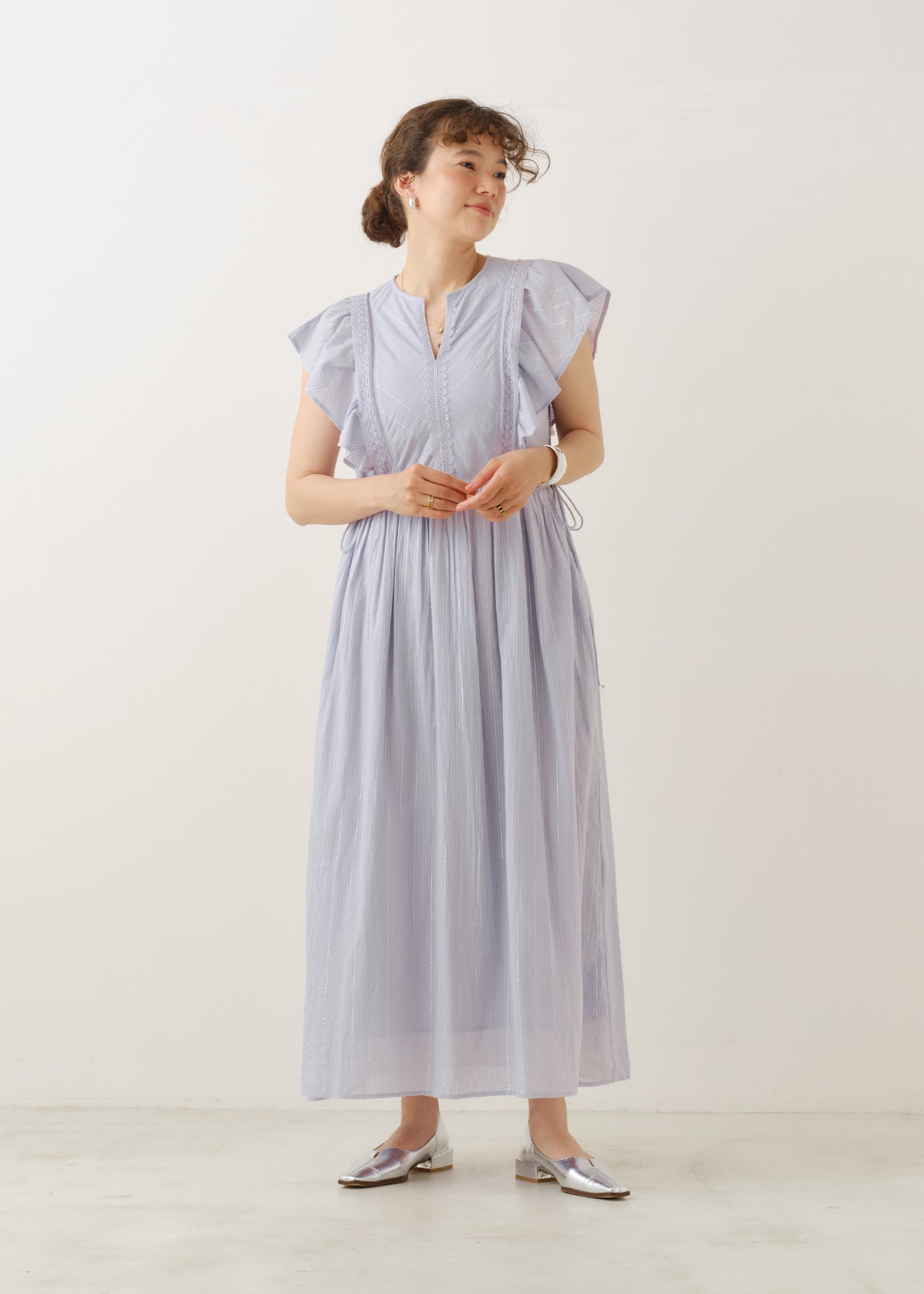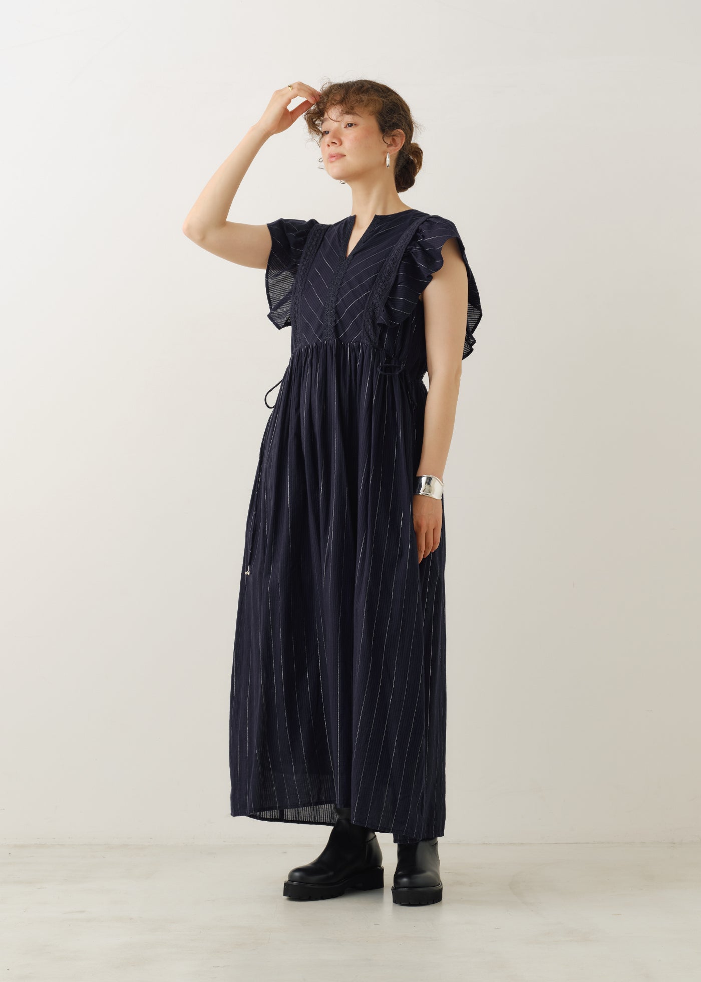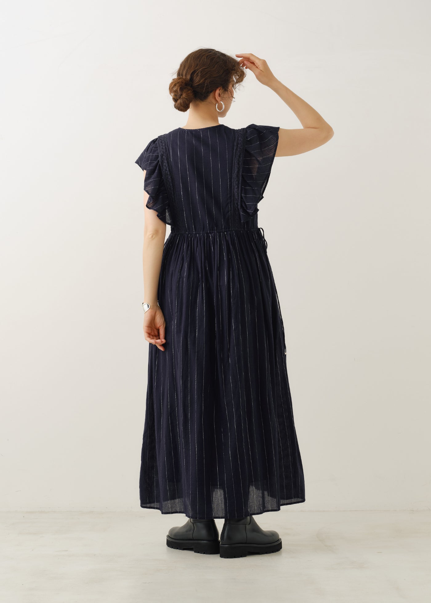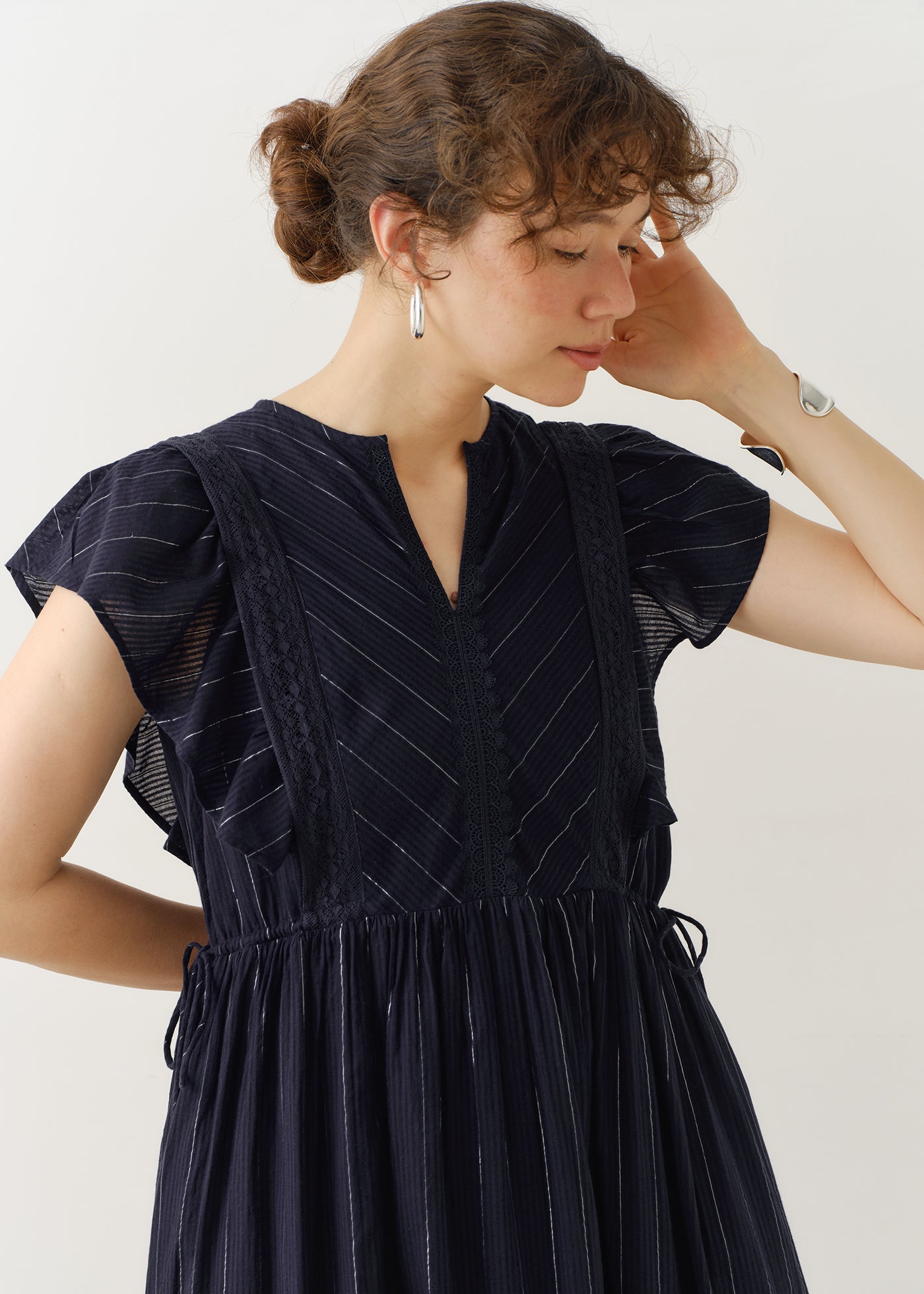 レースを合わせた胸元とスカートでストライプの方向を変えて、よりすっきりときれいなシルエットに感じられるようなつくり。