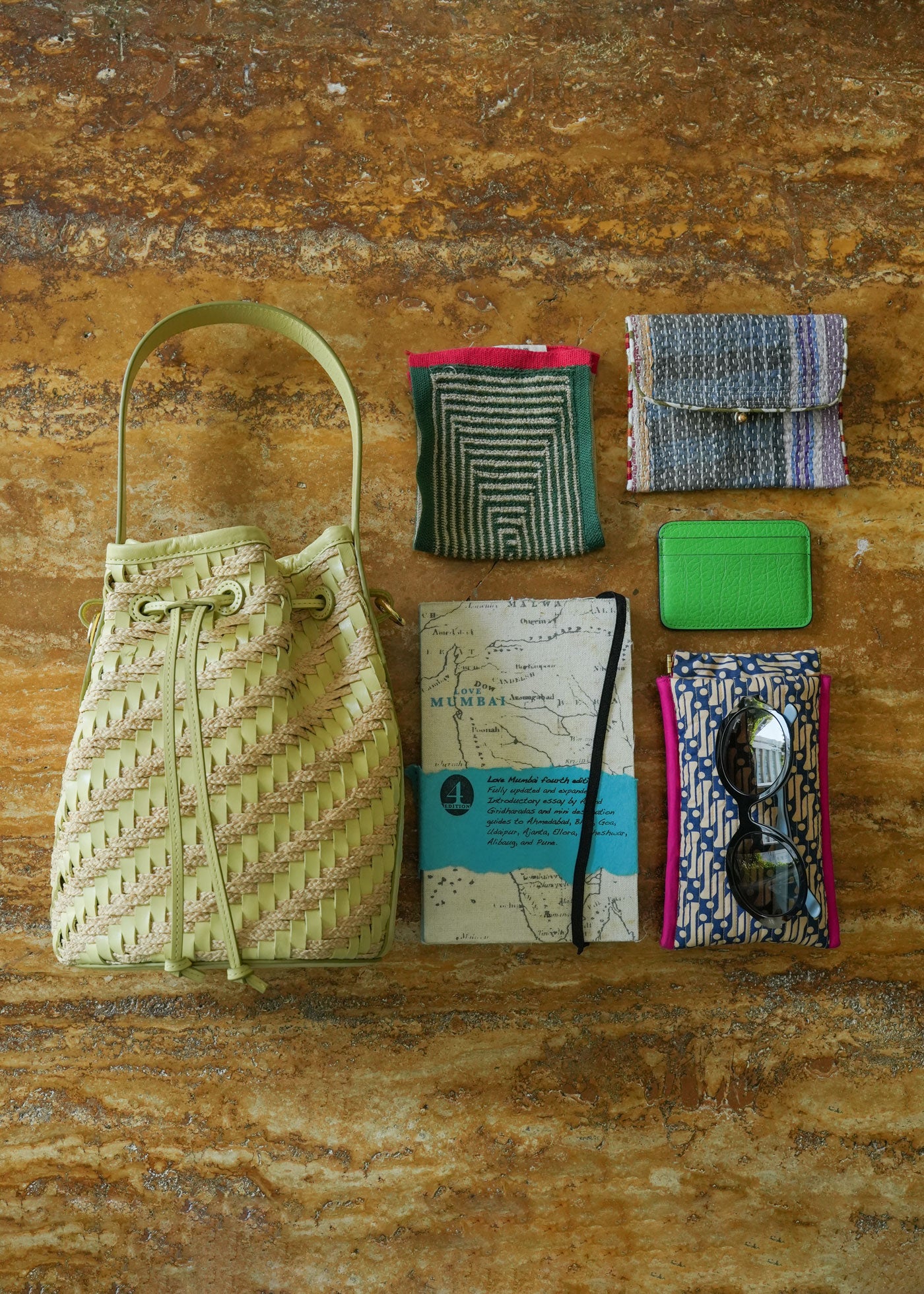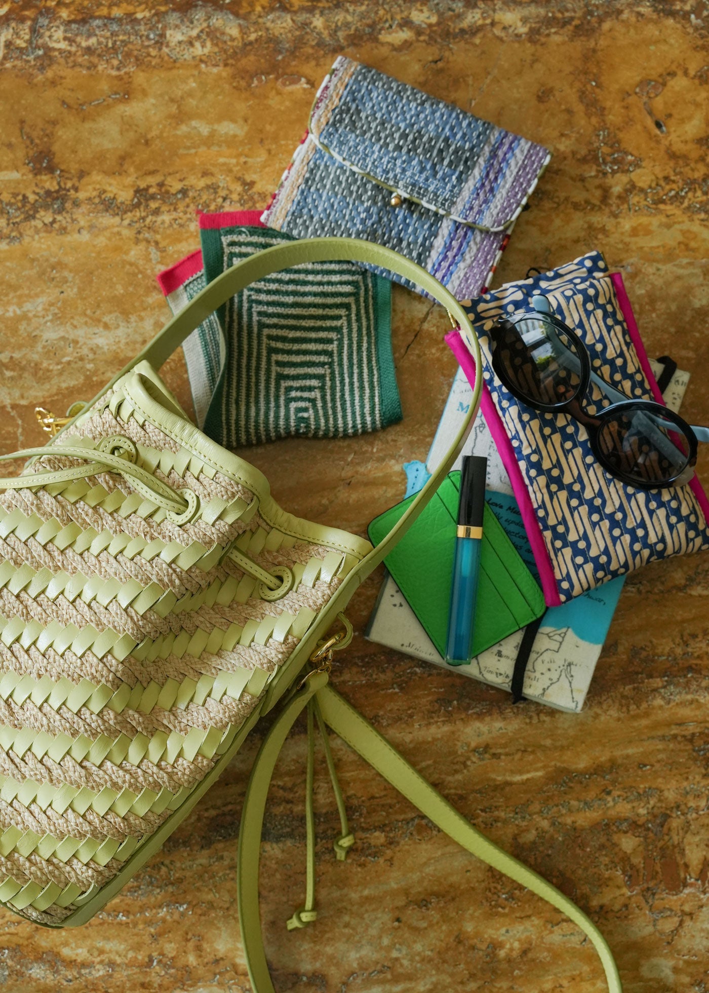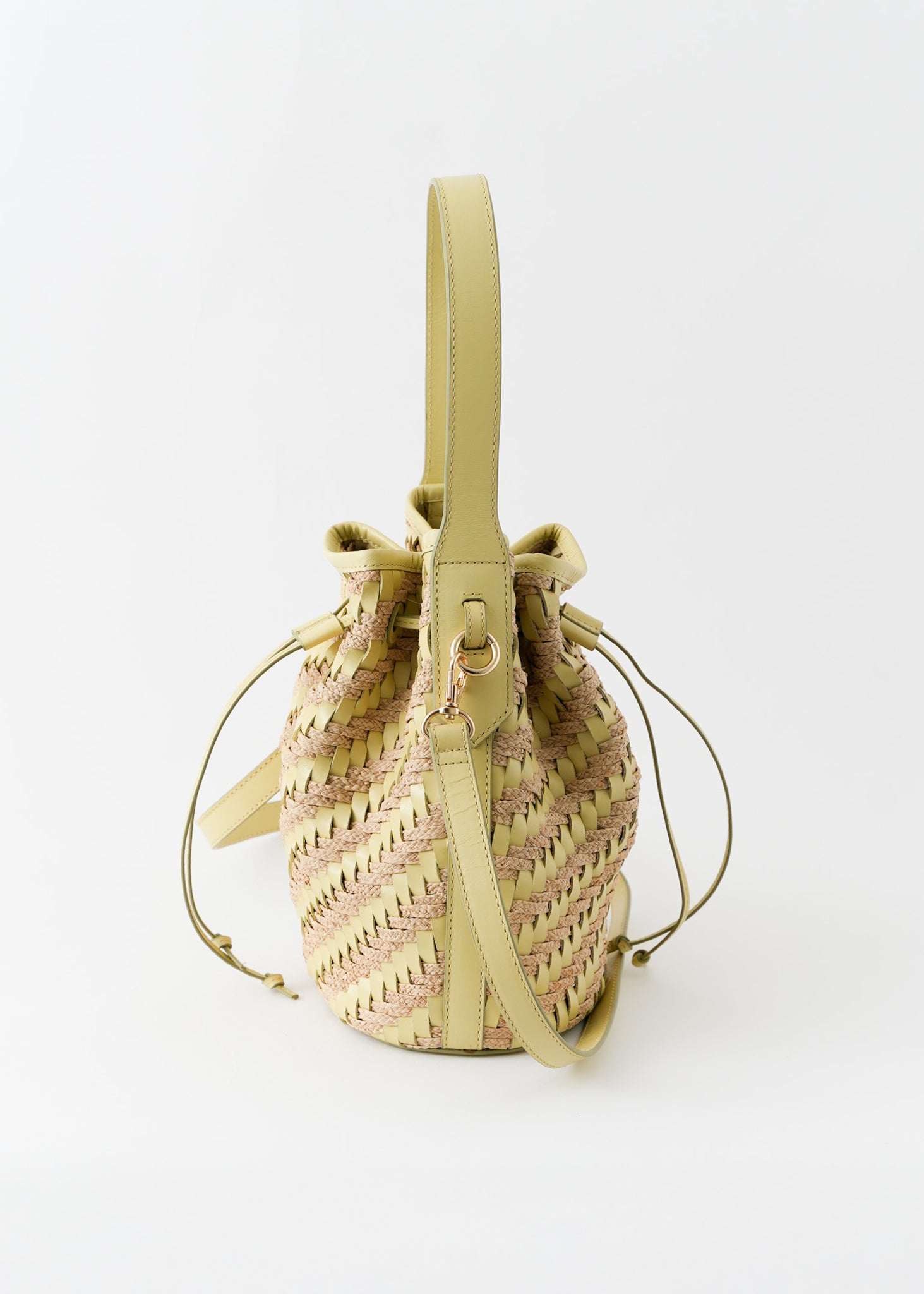 レザーとラフィアのコンビは、使うほどにしなやかに。ショルダーストラップ付き。