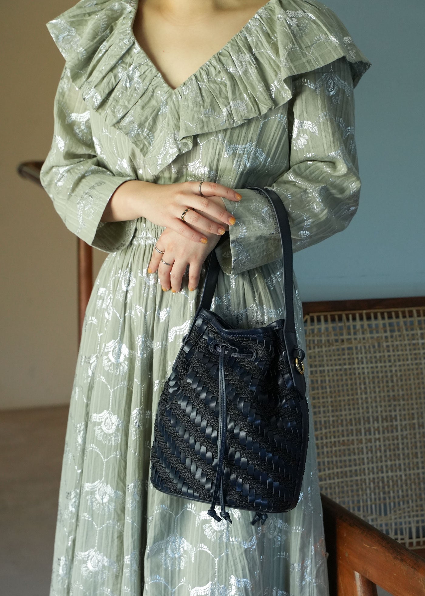 ラフィアとレザーを編み込んだ、ワンハンドルのバッグです。