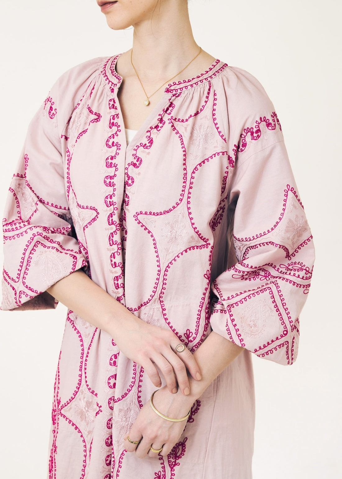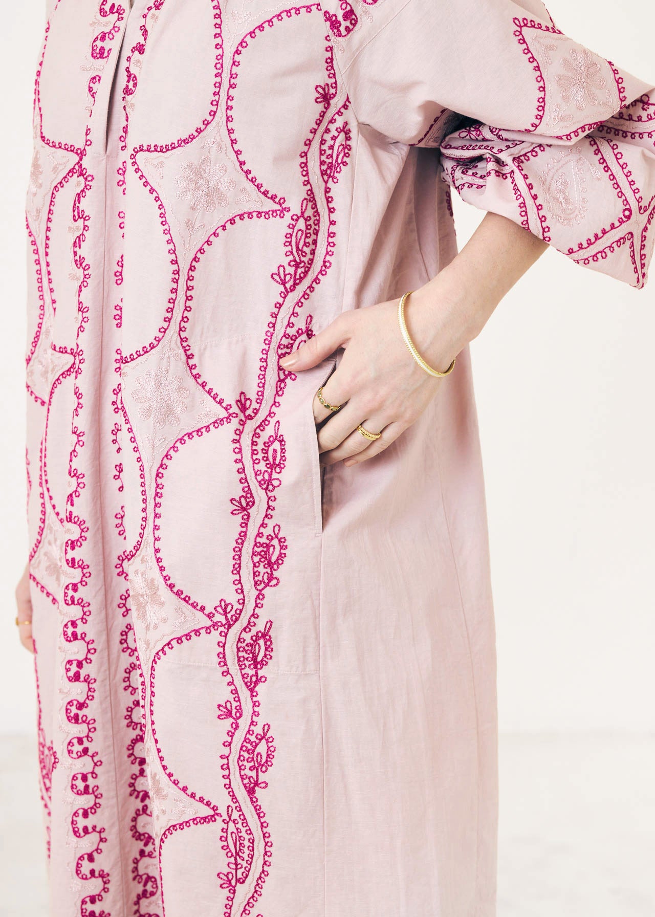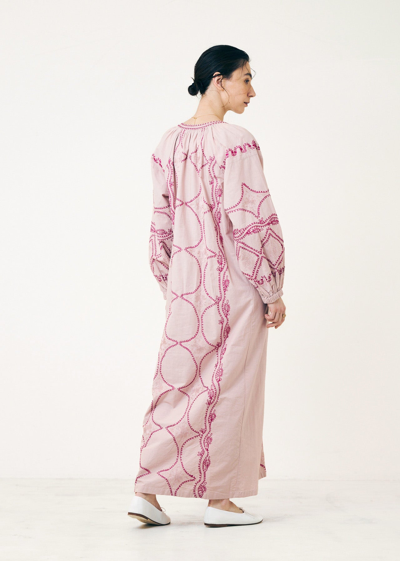 刺繍が縦ラインに入っているので全体のシルエットをストンと縦長に、サイドにあえて刺繍を入れないことでよりすっきりと。